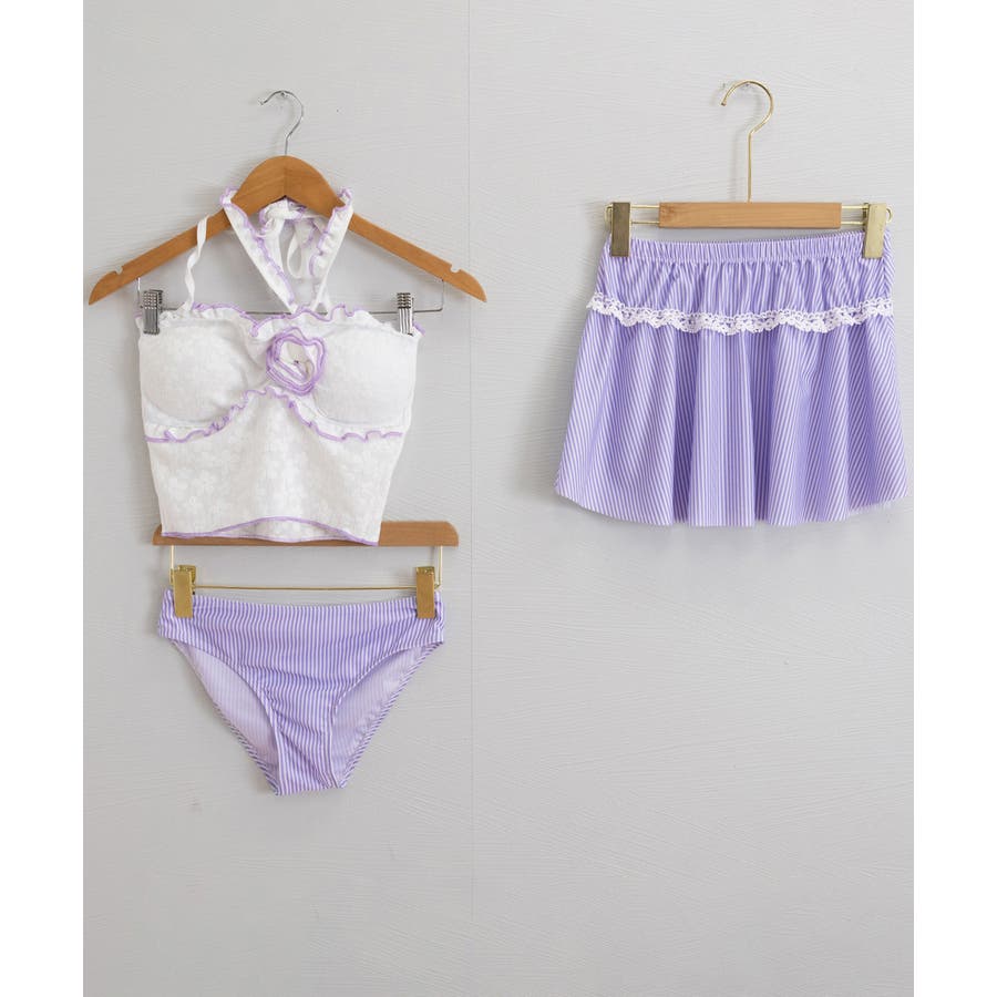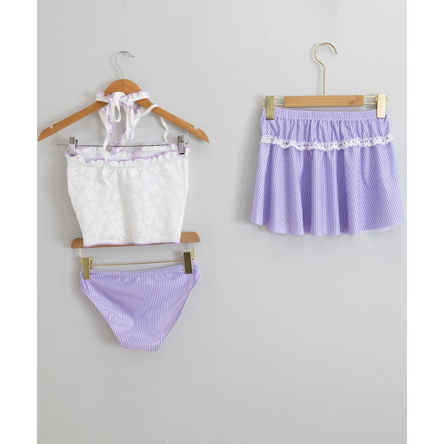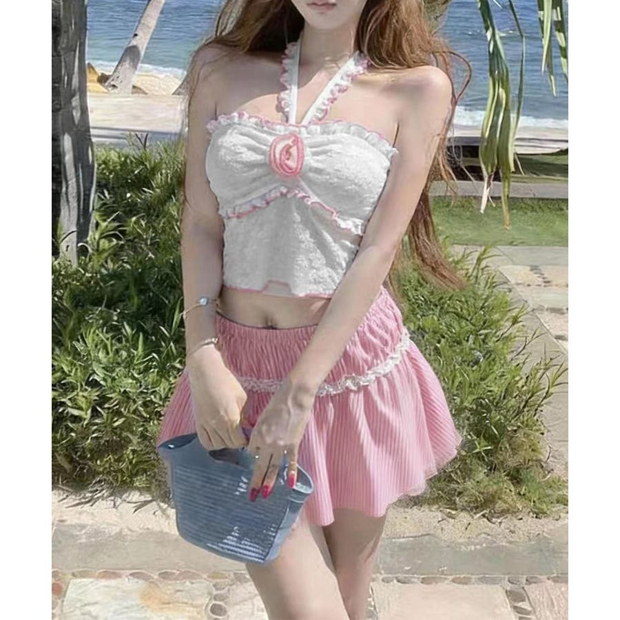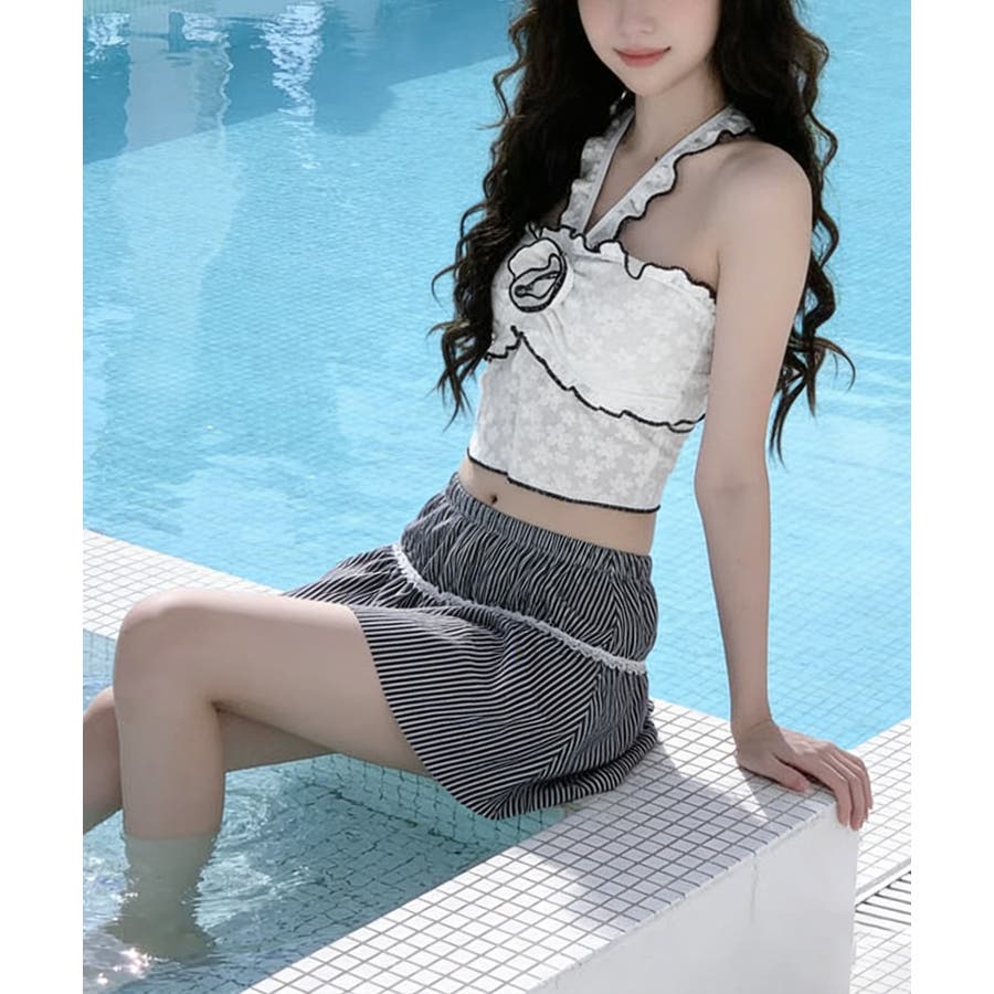 立体フラワーモチーフとフリルが目を引く三点セットスイムウェア。