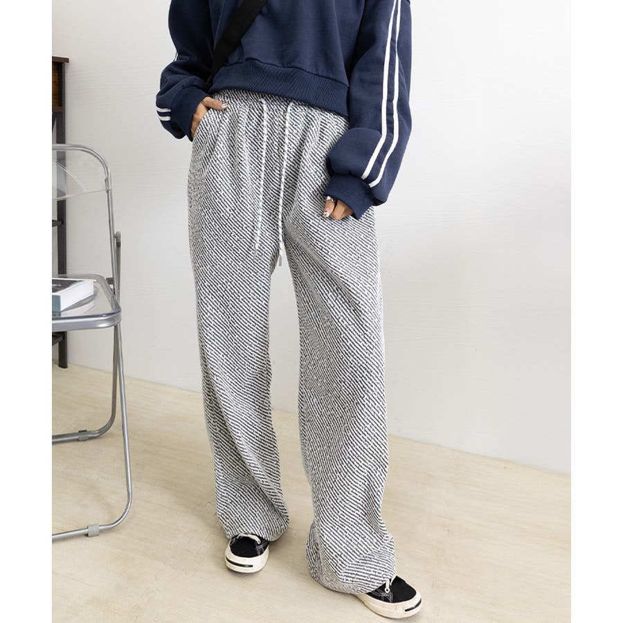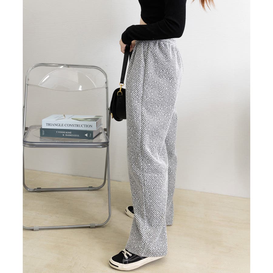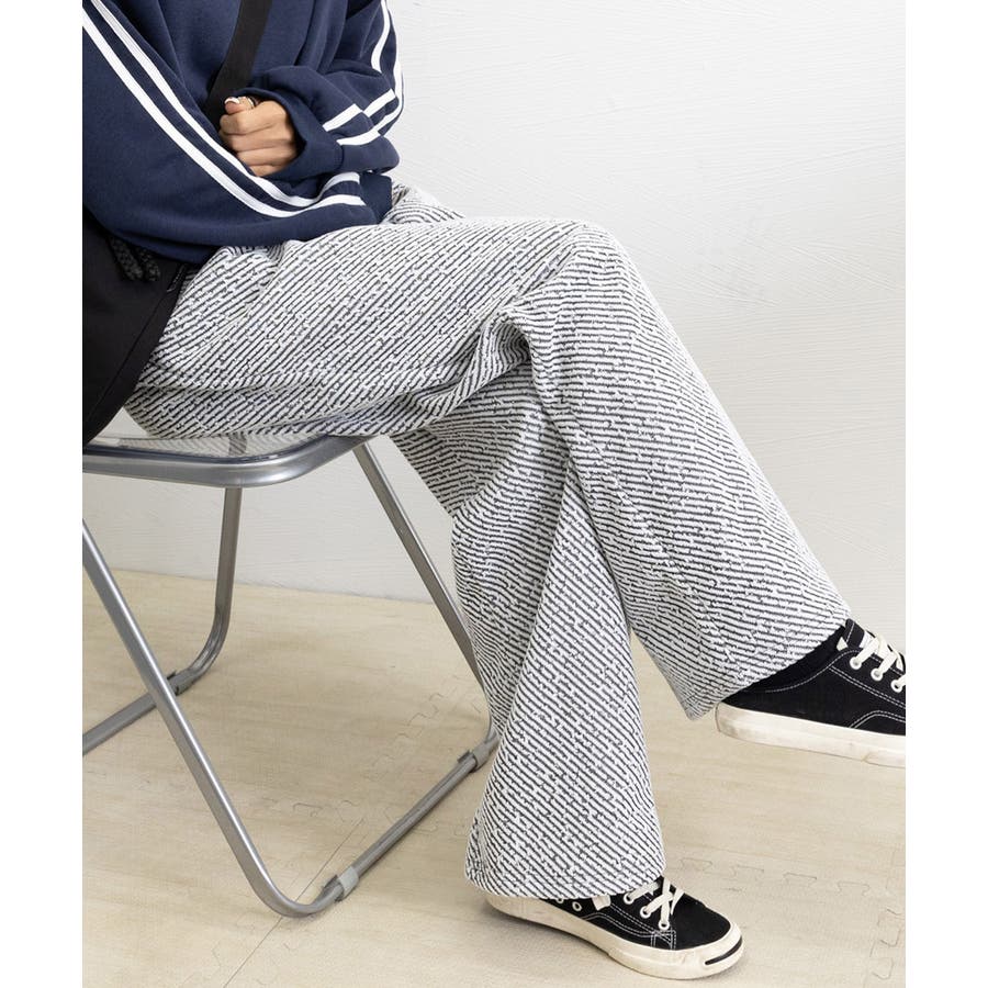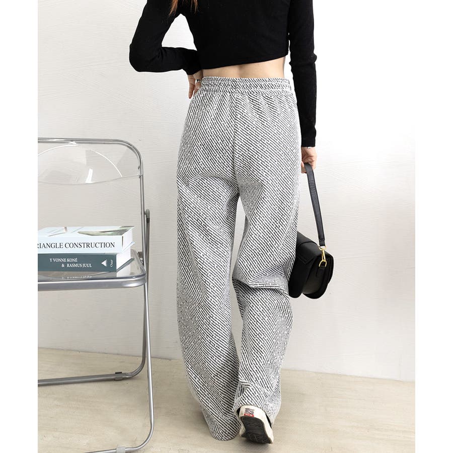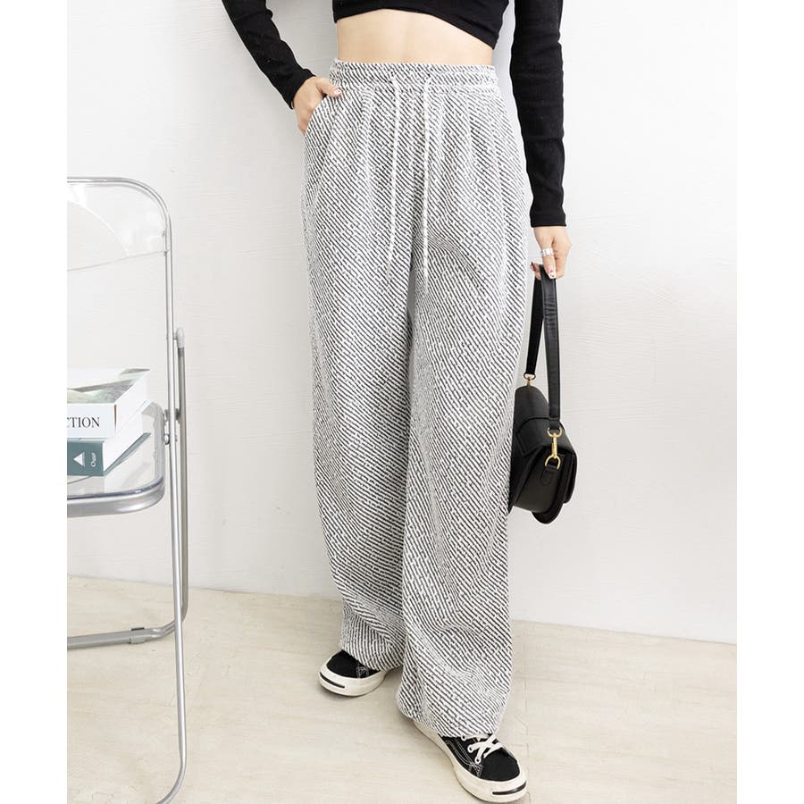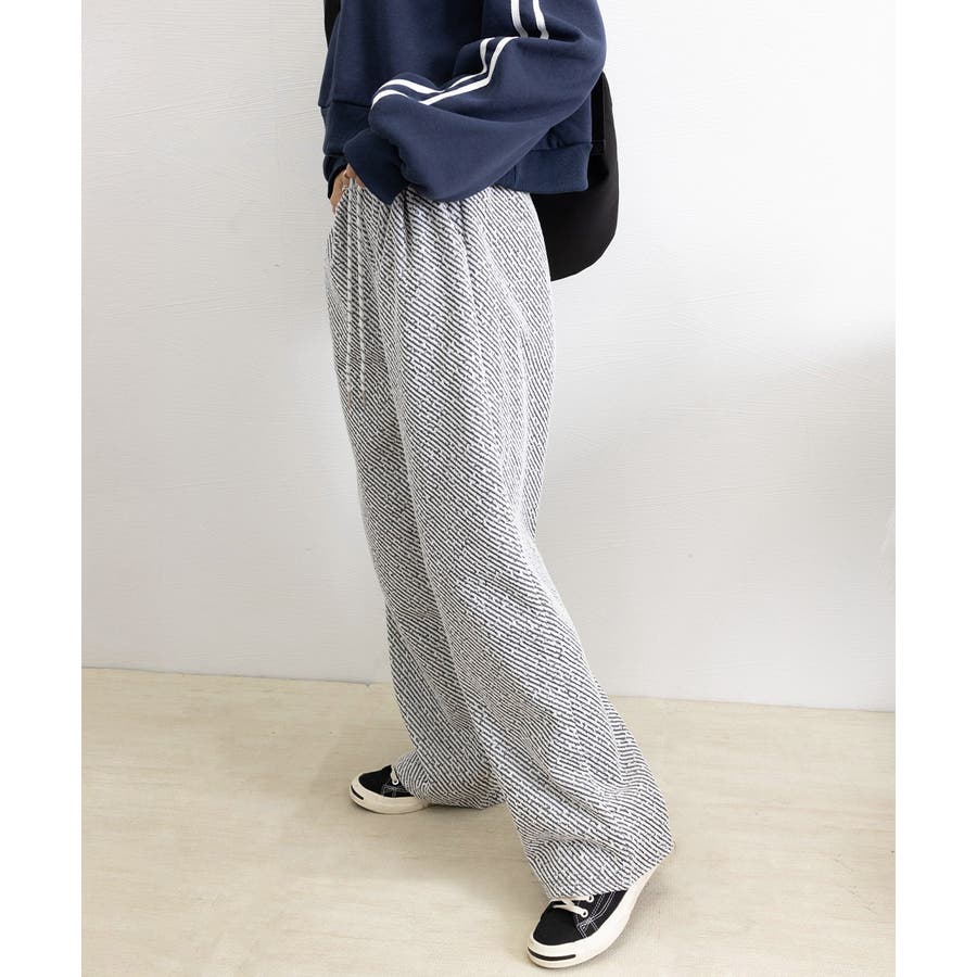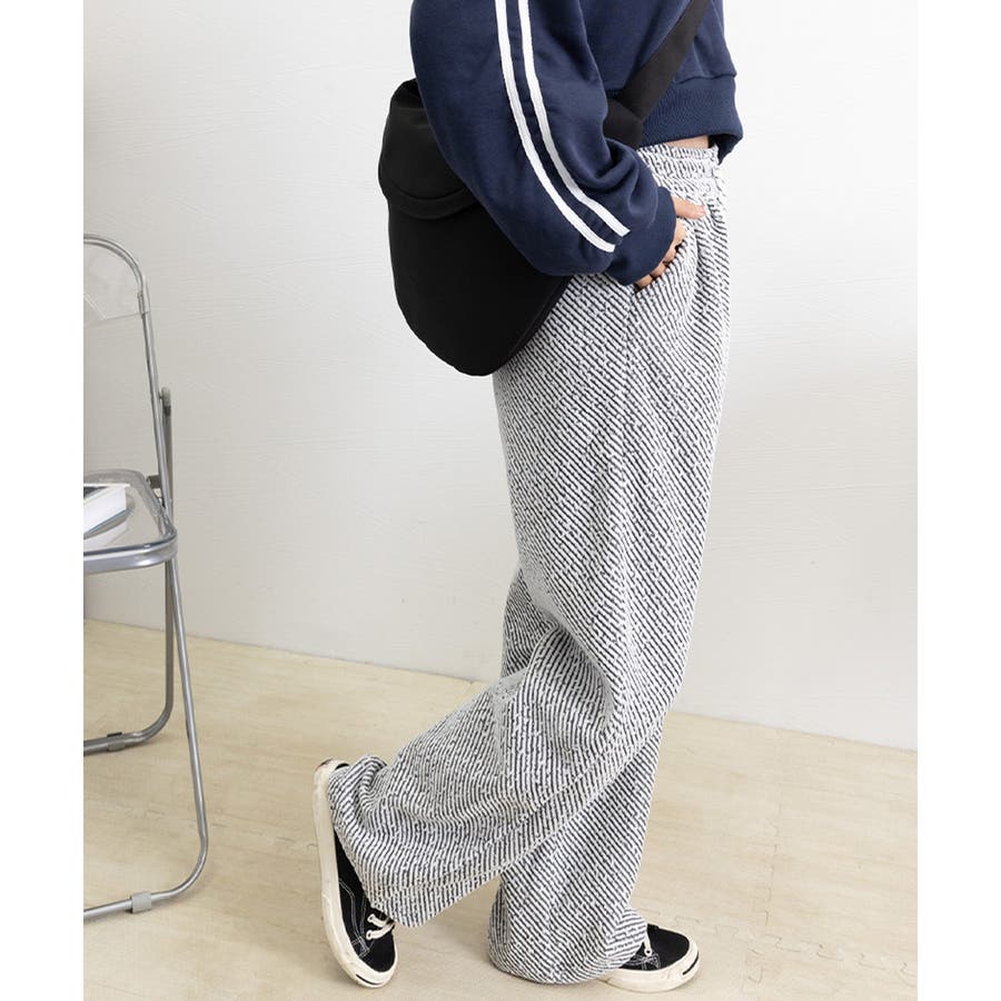斜めストライプ柄がスタイリッシュな印象を与え、コーディネートにアクセントを加えるワイドパンツ。