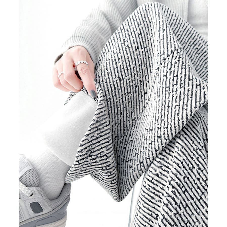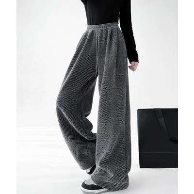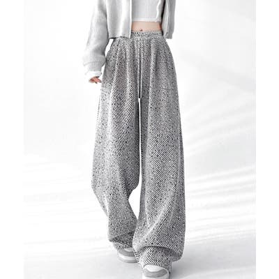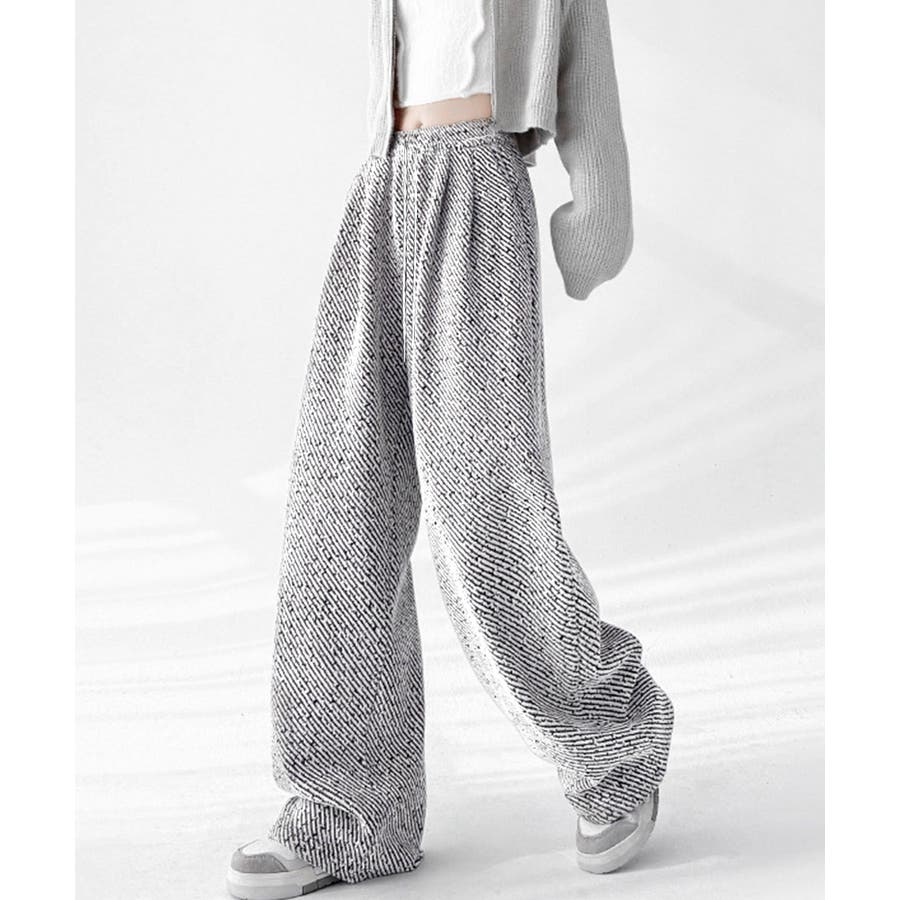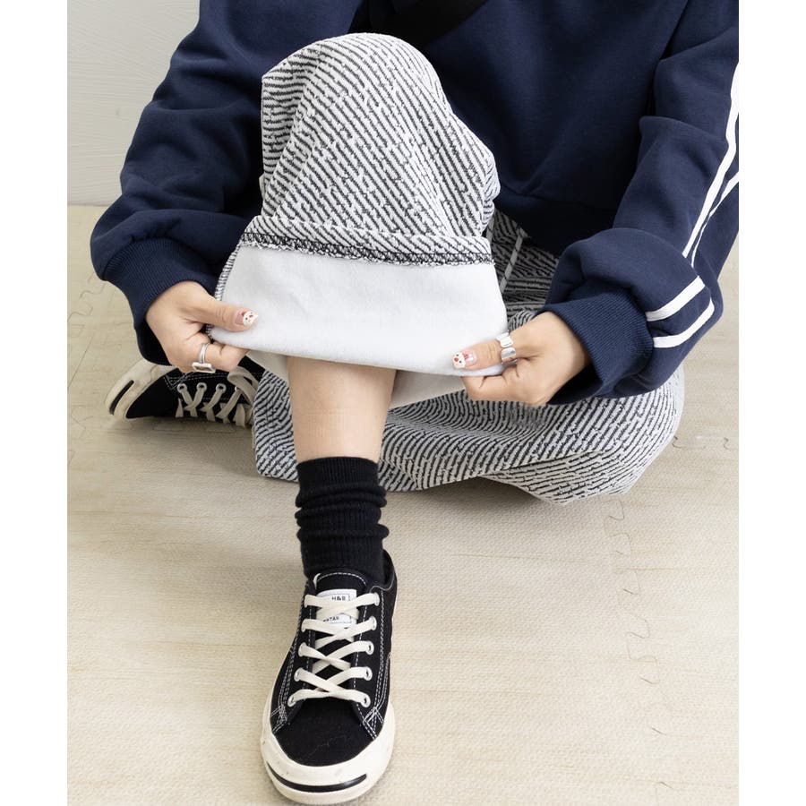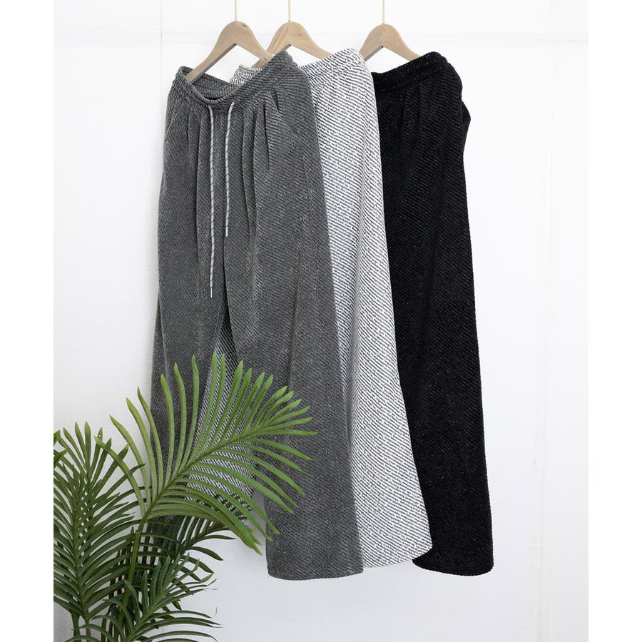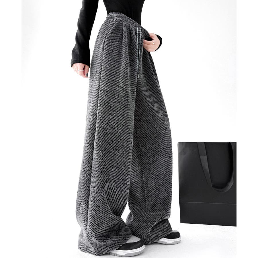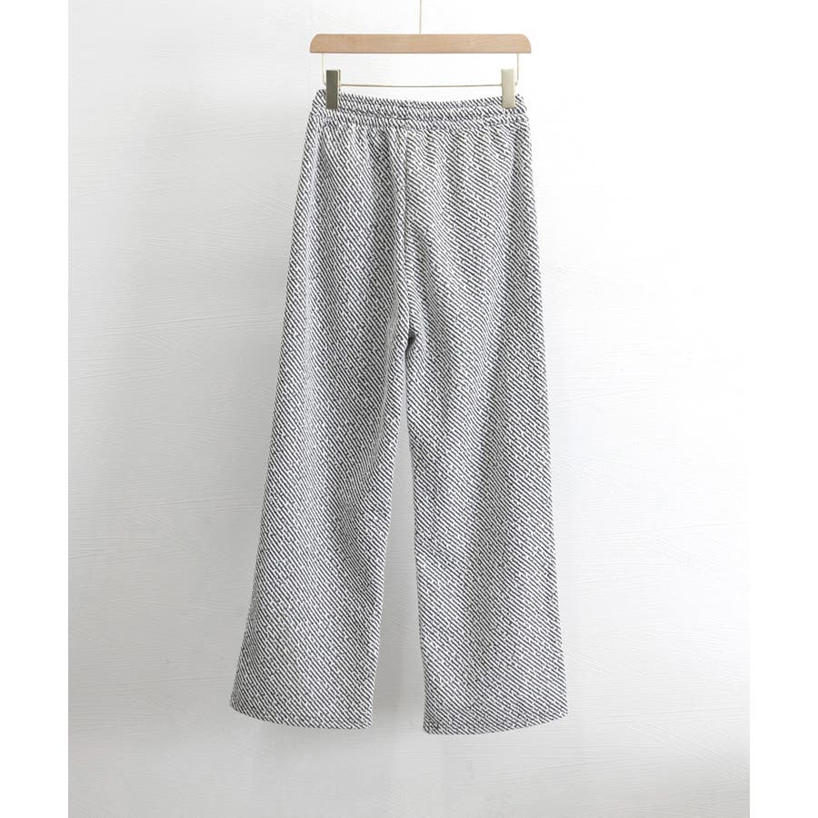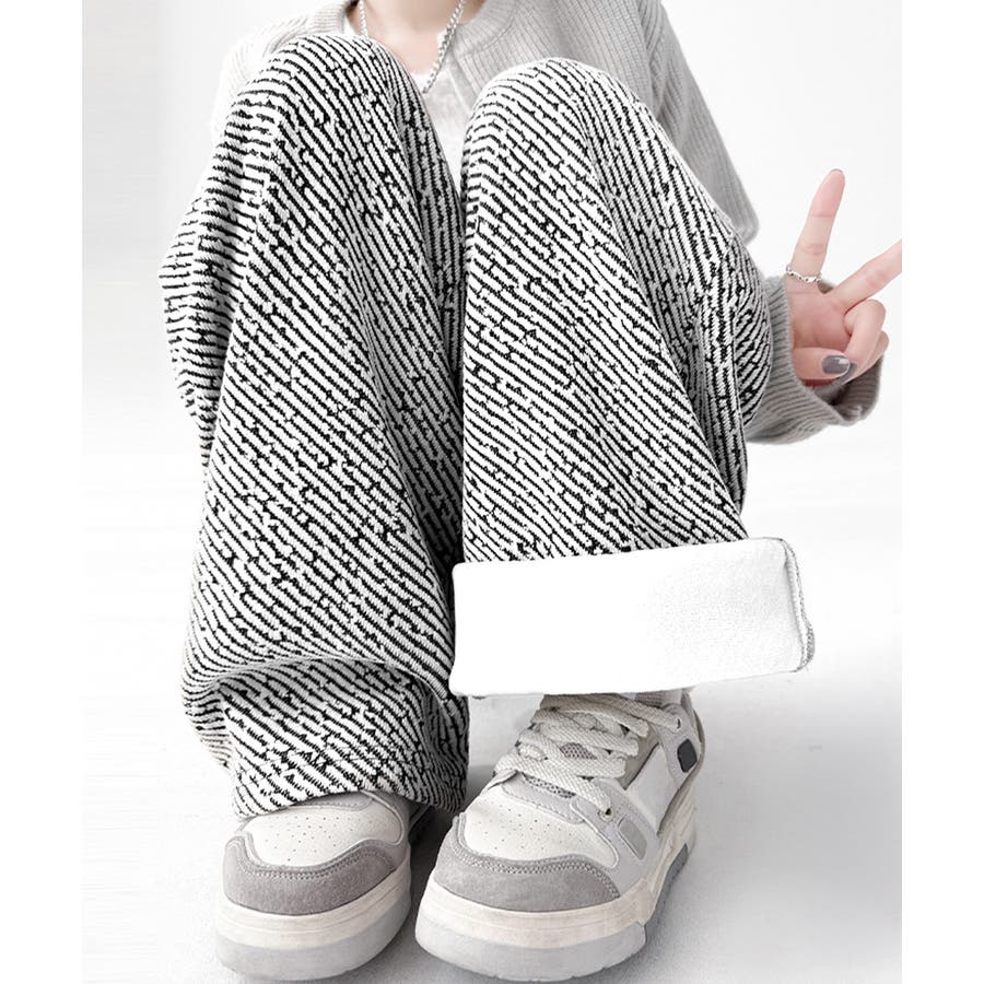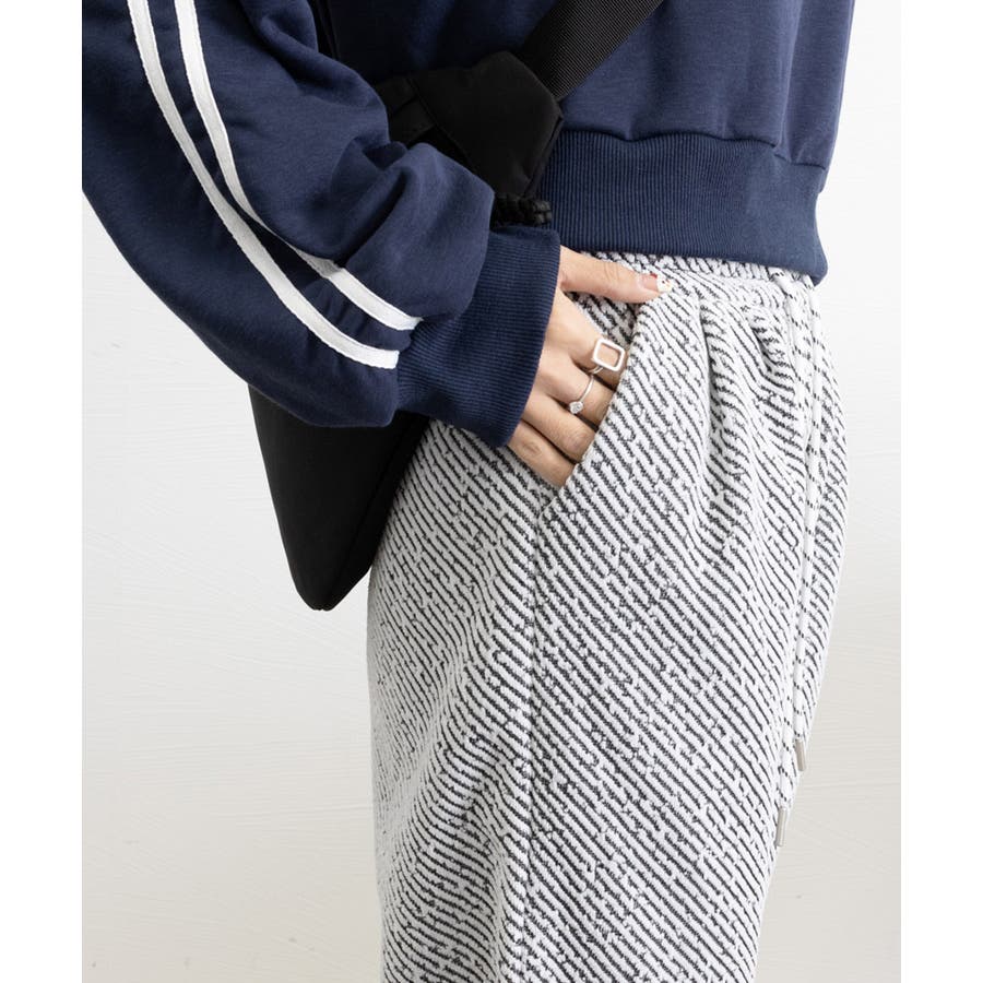 斜めストライプ柄がスタイリッシュな印象を与え、コーディネートにアクセントを加えるワイドパンツ。