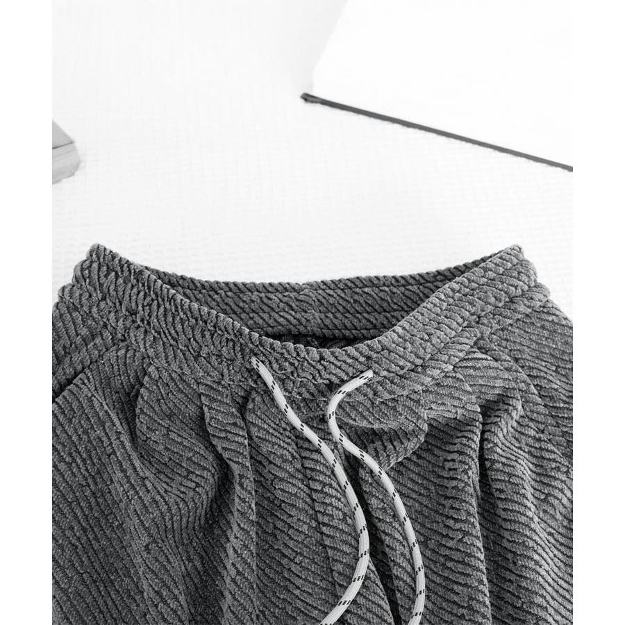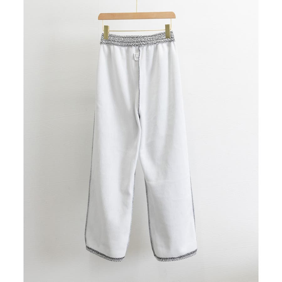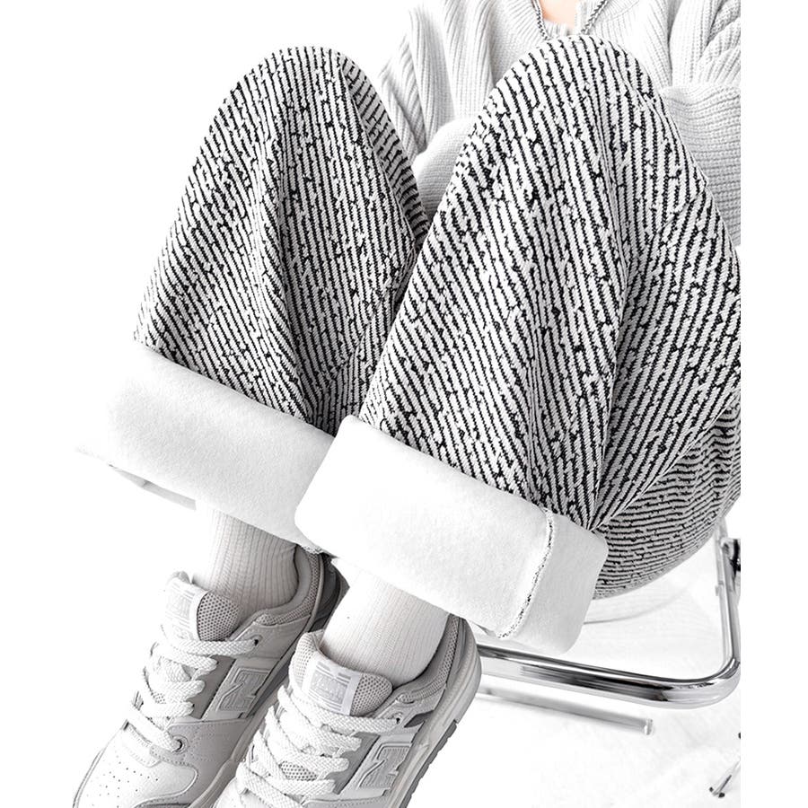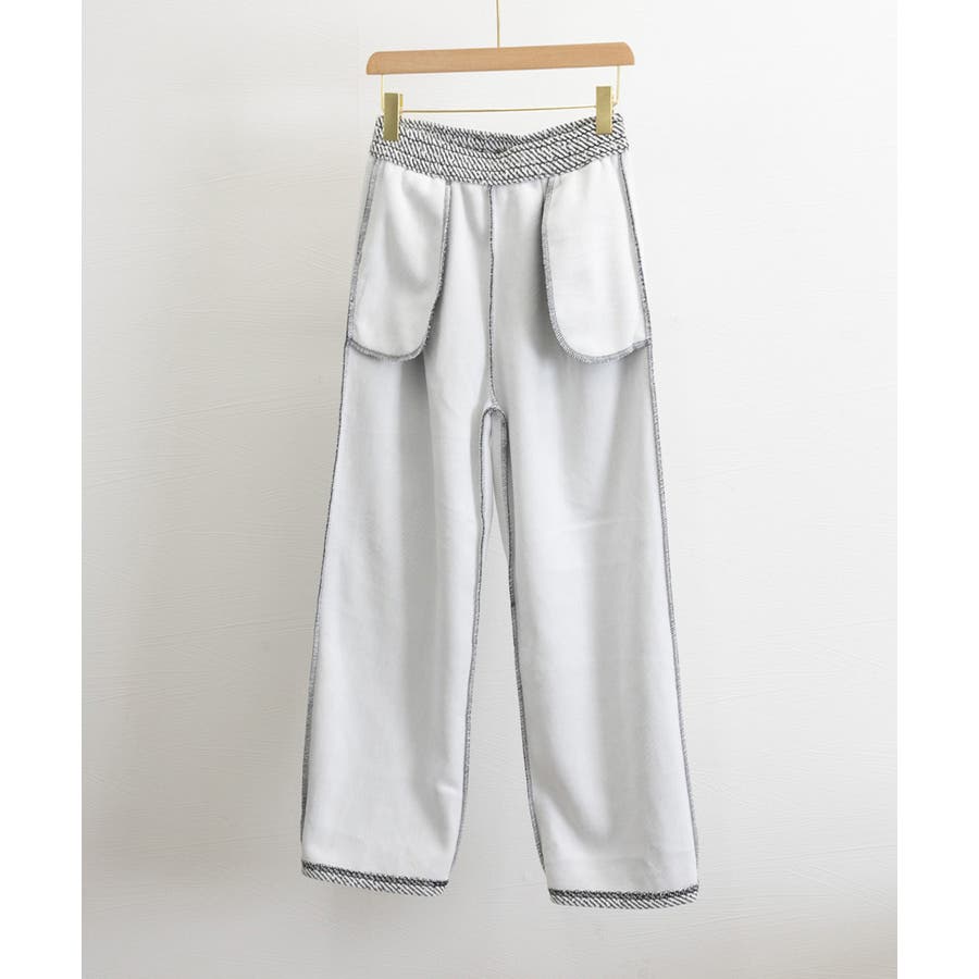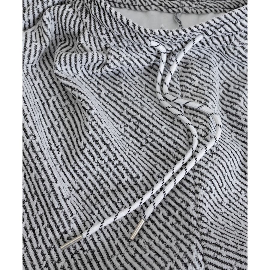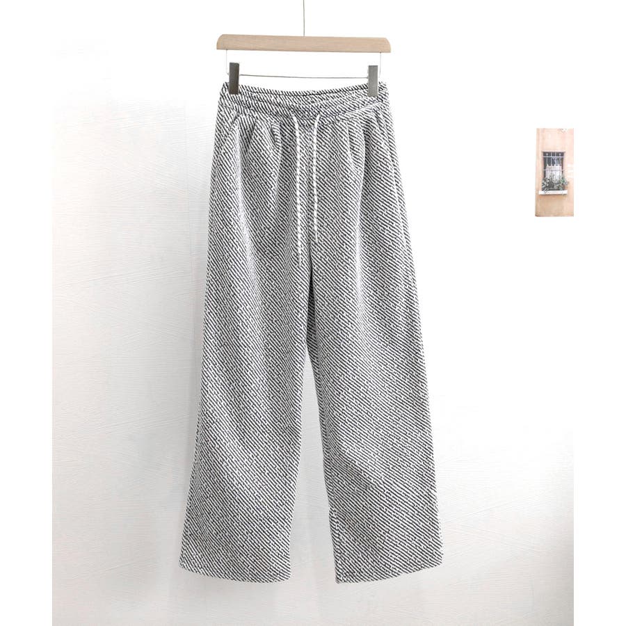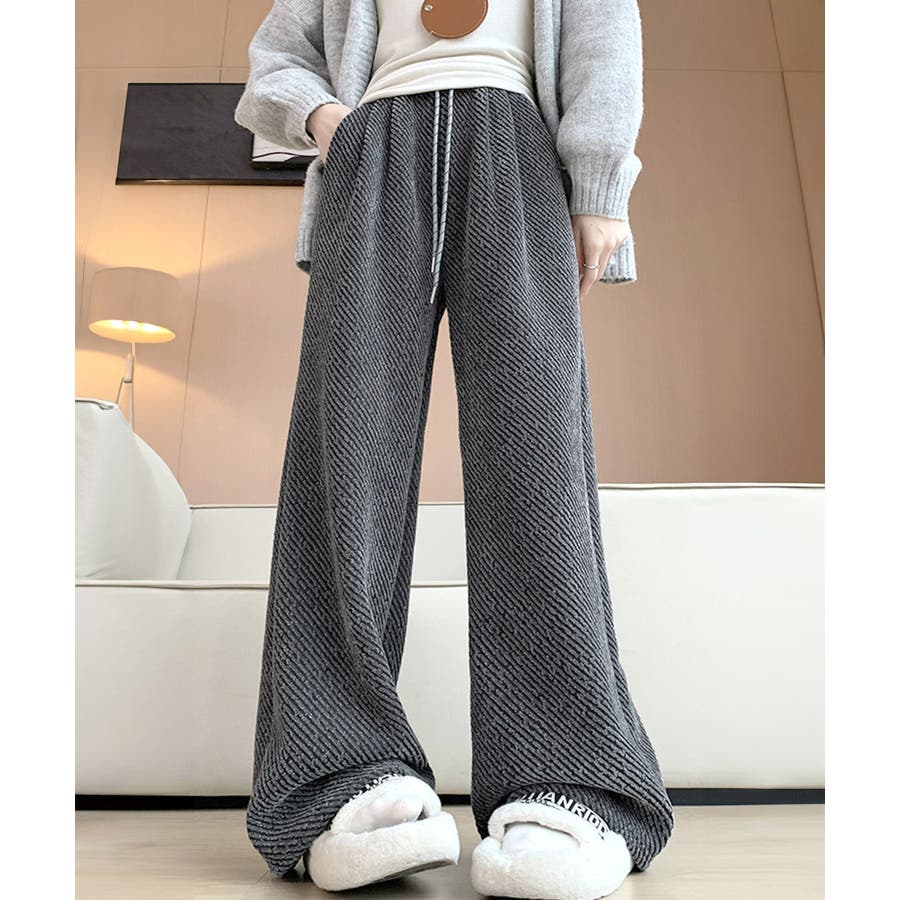 斜めストライプ柄がスタイリッシュな印象を与え、コーディネートにアクセントを加えるワイドパンツ。