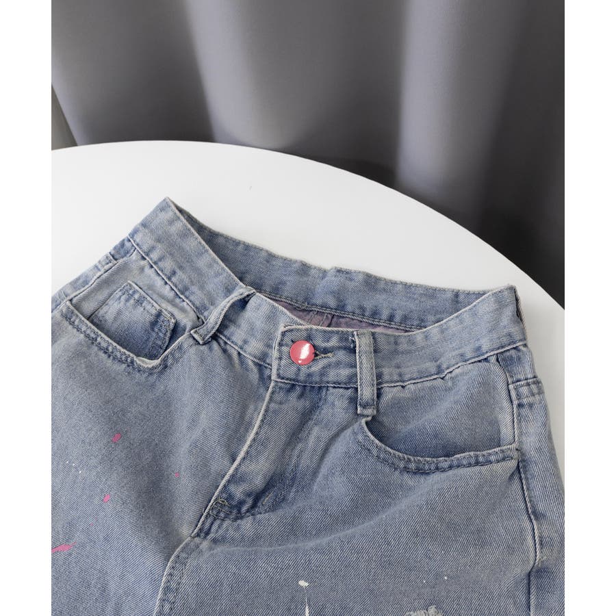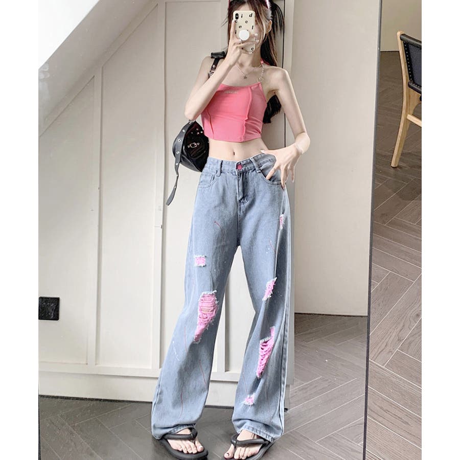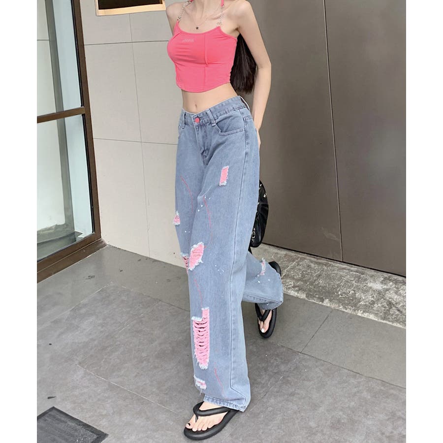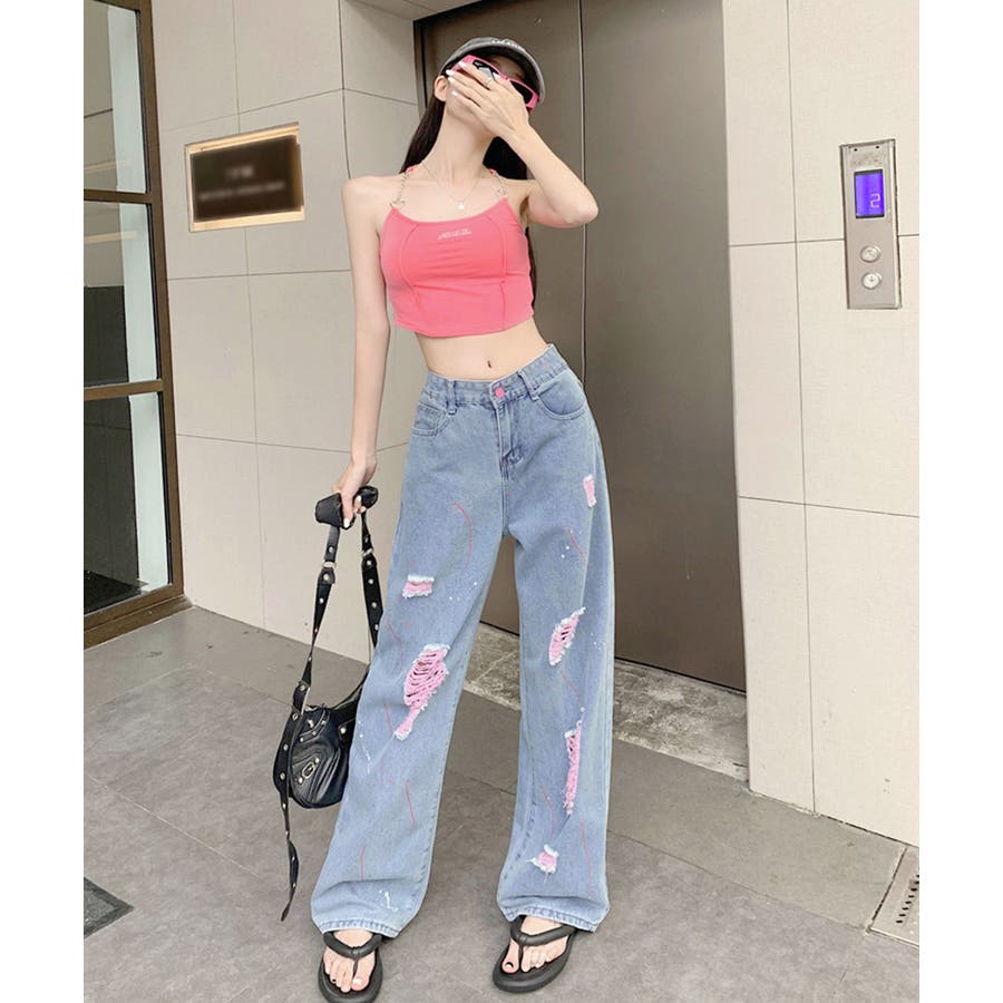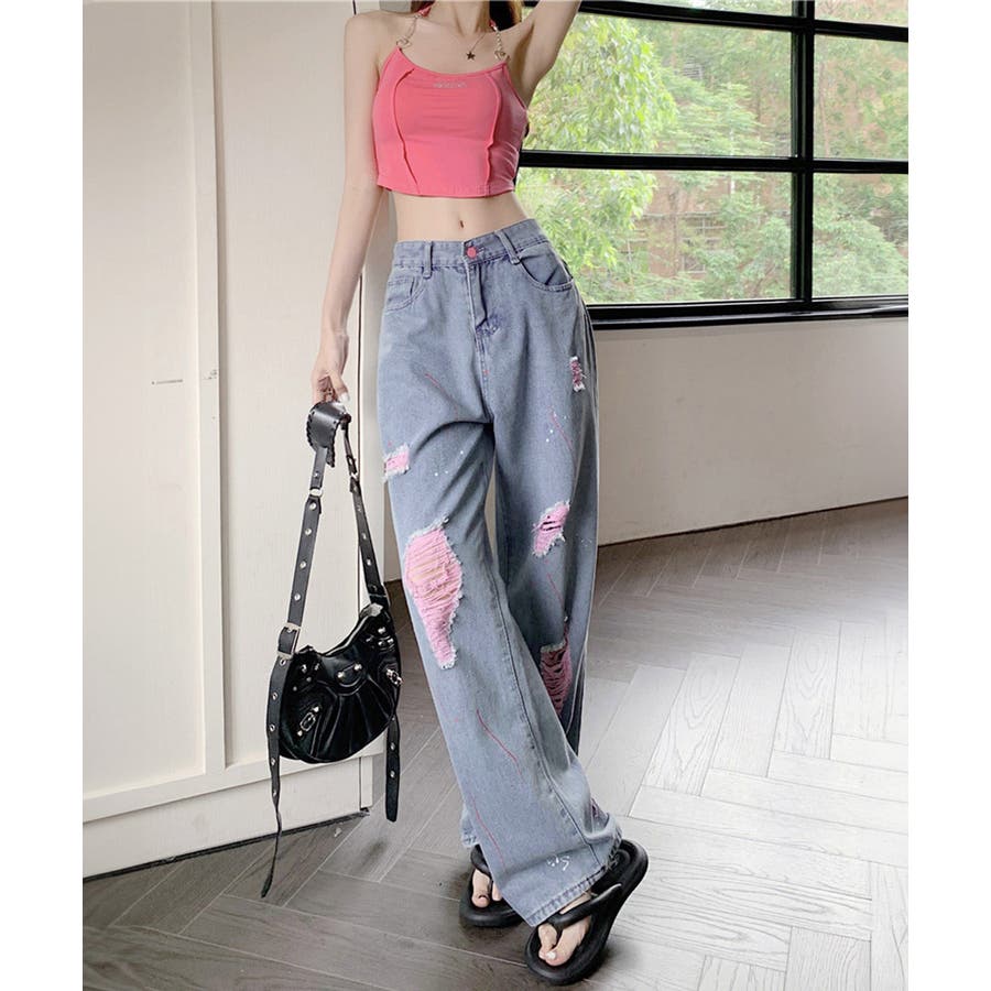 ストレートパンツ夏 ストリート お洒落 クラッシュジーンズ