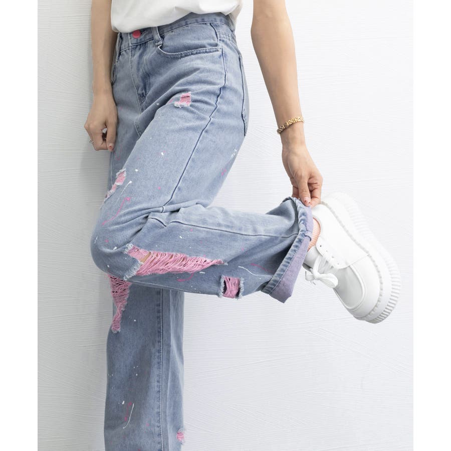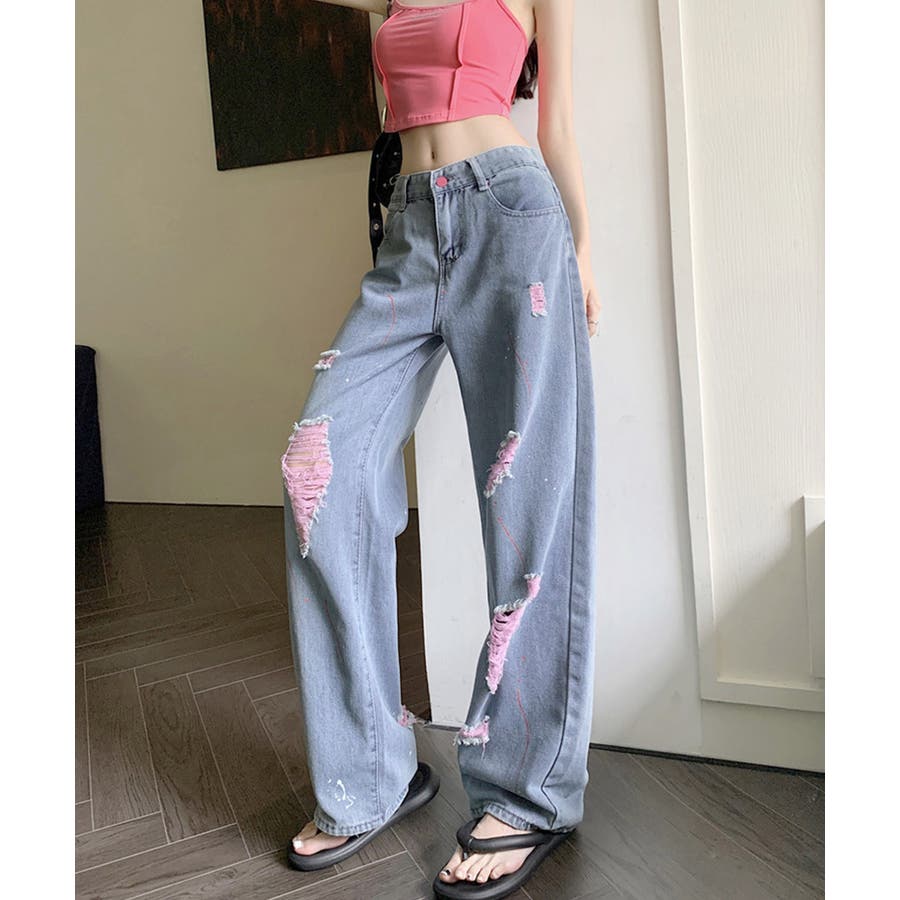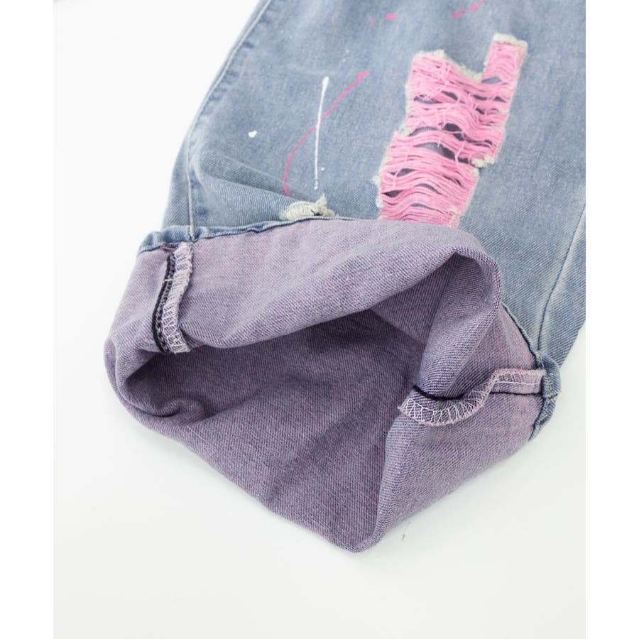 鮮やかなピンクカラーと絶妙なダメージ加工が、カジュアルながらもスタイリッシュな印象を演出