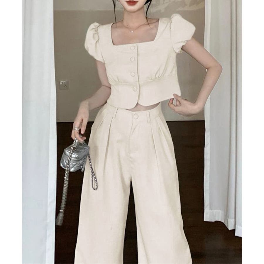 レディース パフスリーブトップススクエアネック 着やせ ハイウエストスラックスパンツ おしゃれ韓国風ツーピース大人可愛い