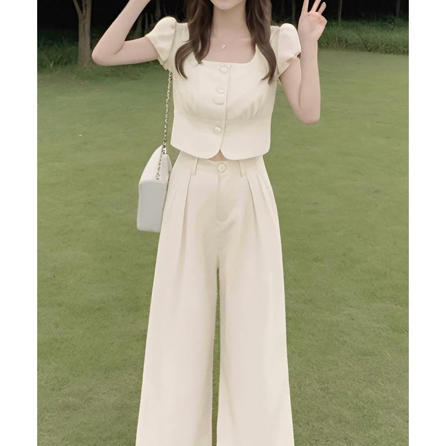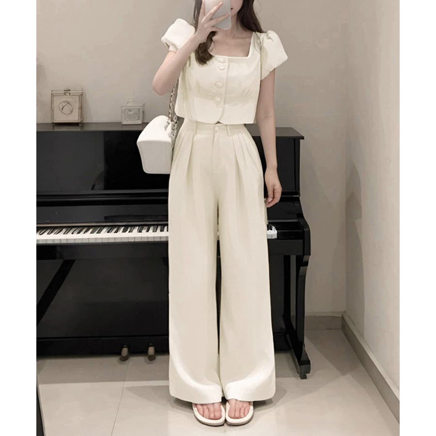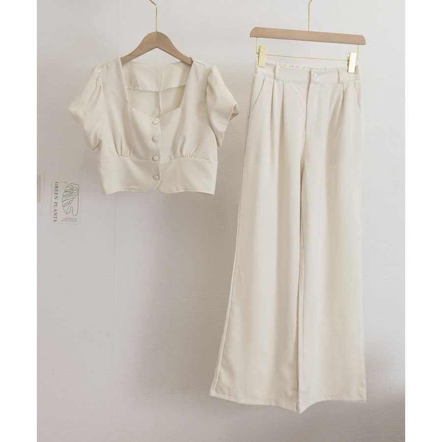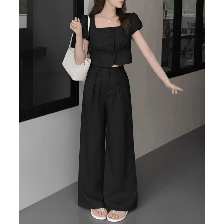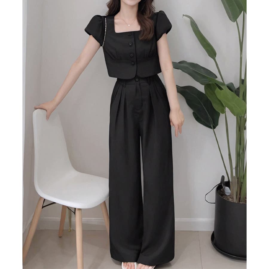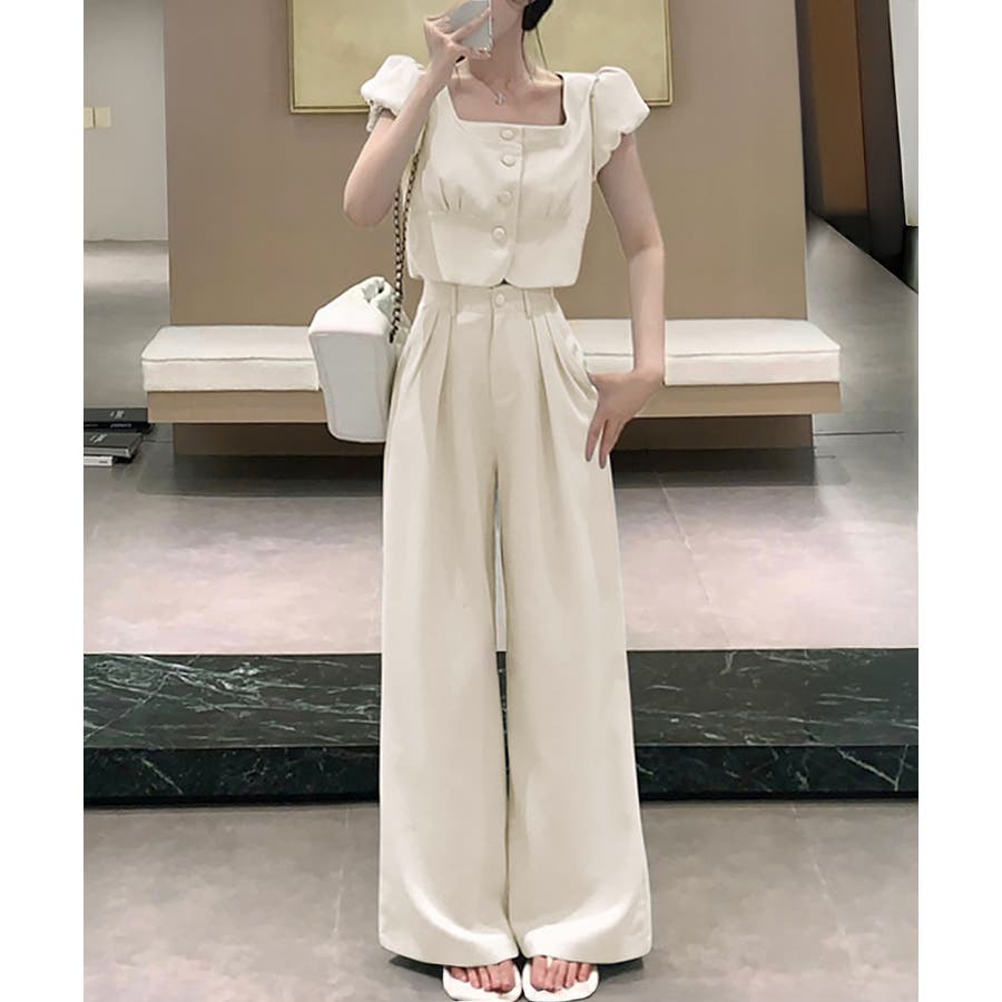 半袖のスクエアネックトップスとタック入りのロングパンツがセットになった、おしゃれな上下2点セットアップ