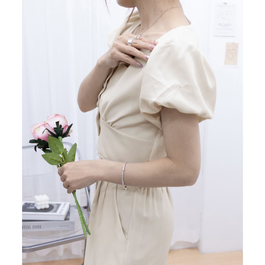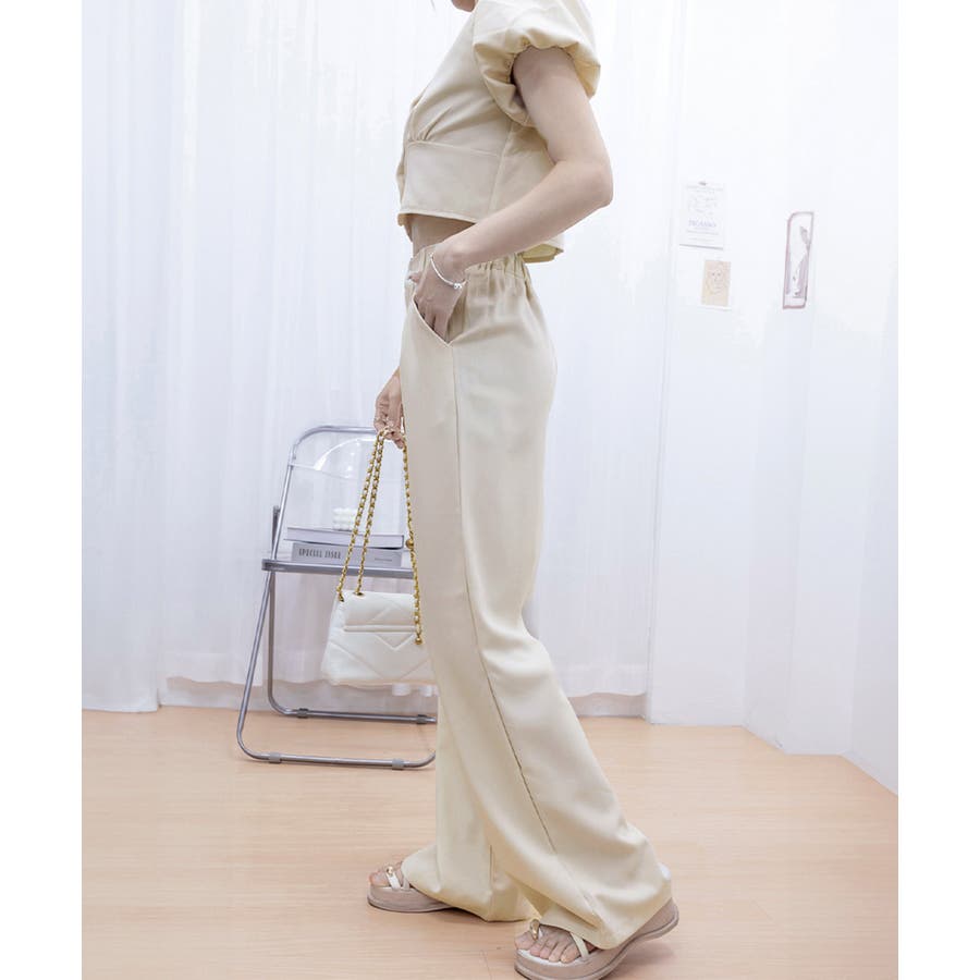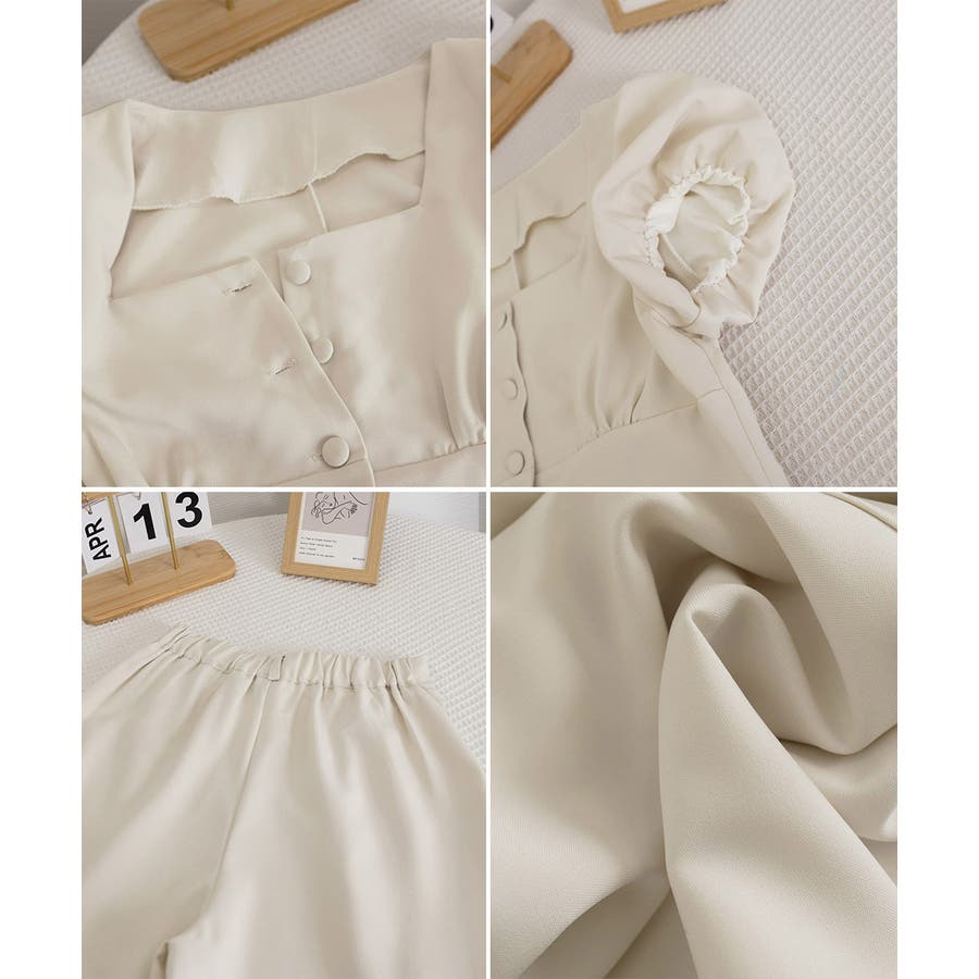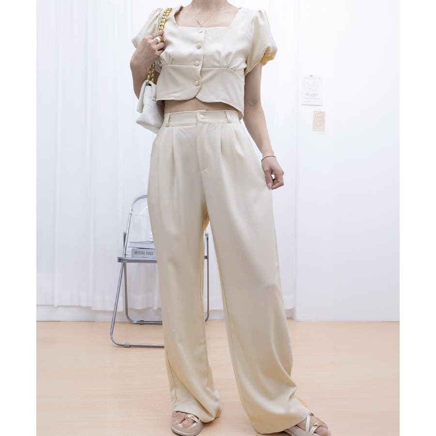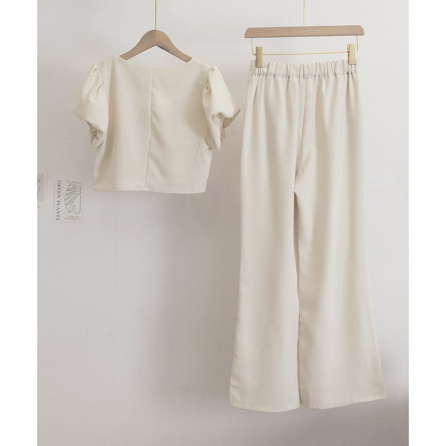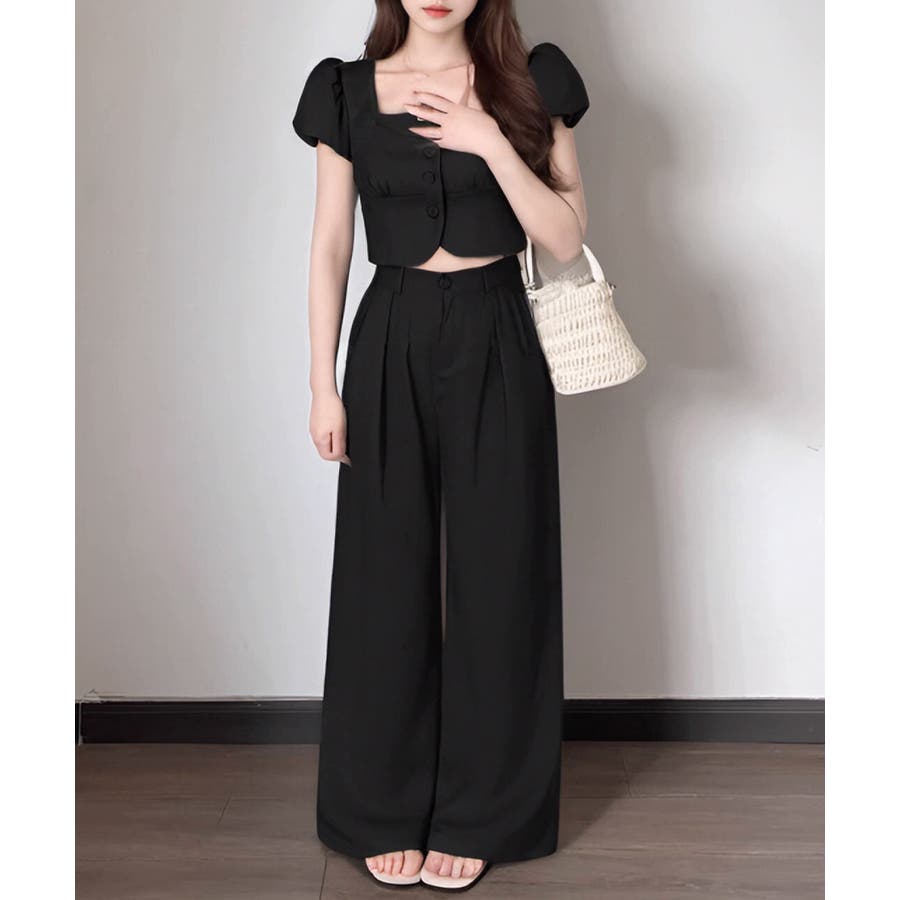 半袖のスクエアネックトップスとタック入りのロングパンツがセットになった、おしゃれな上下2点セットアップ