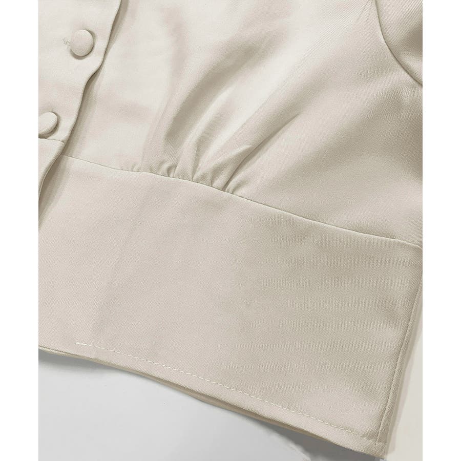 トップスはパフ袖とクロップド丈のデザインで、女性らしいシルエットを演出