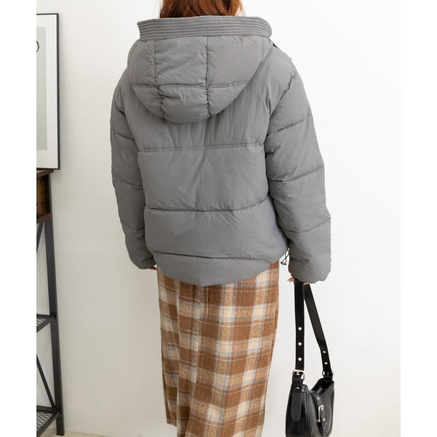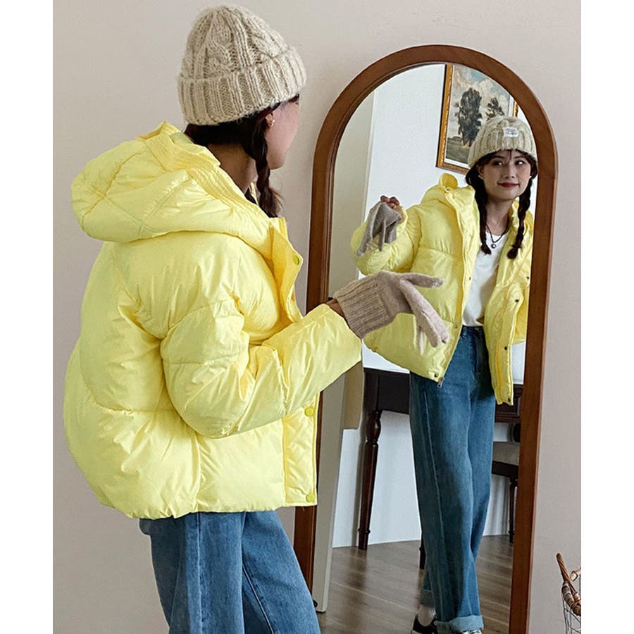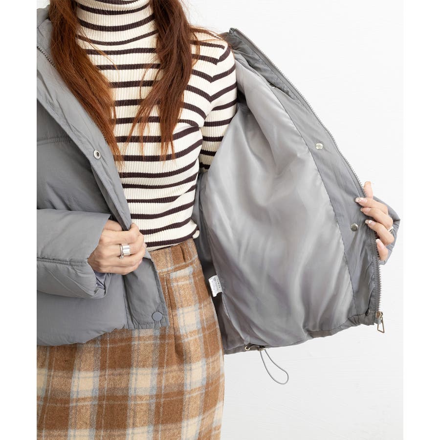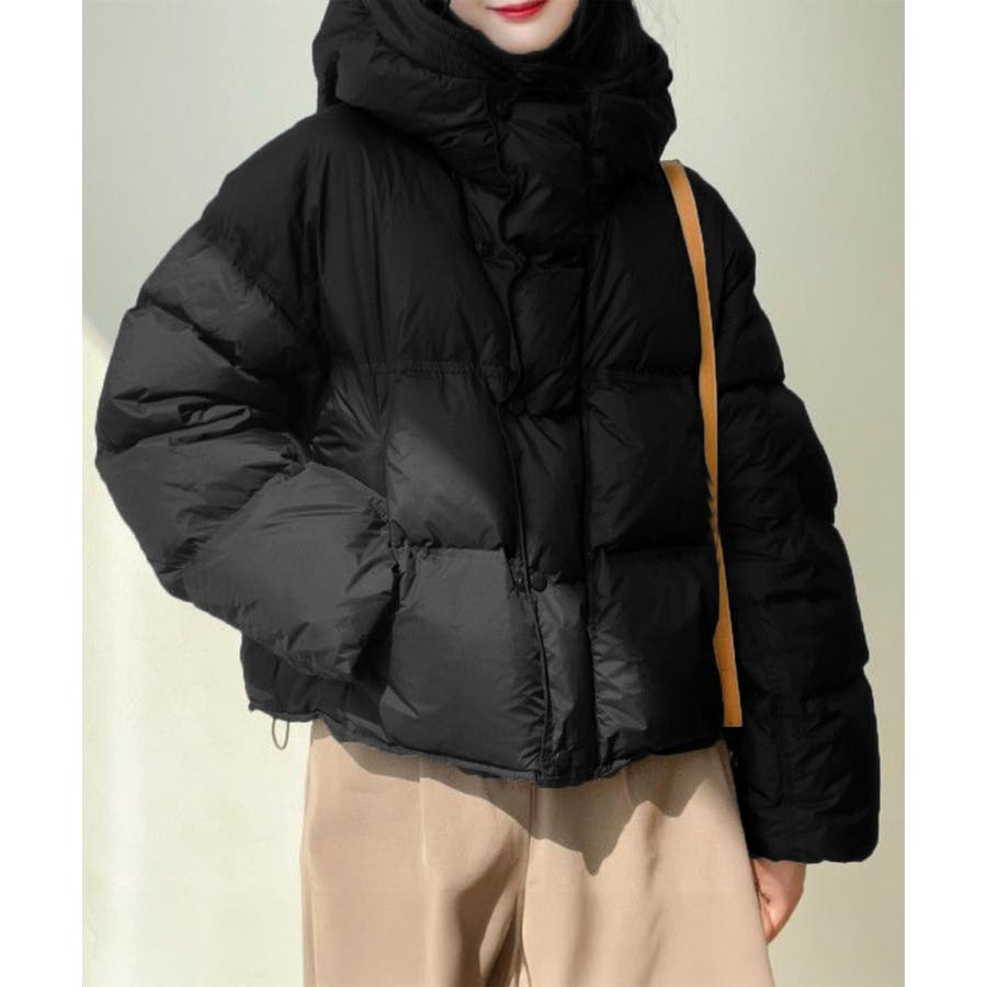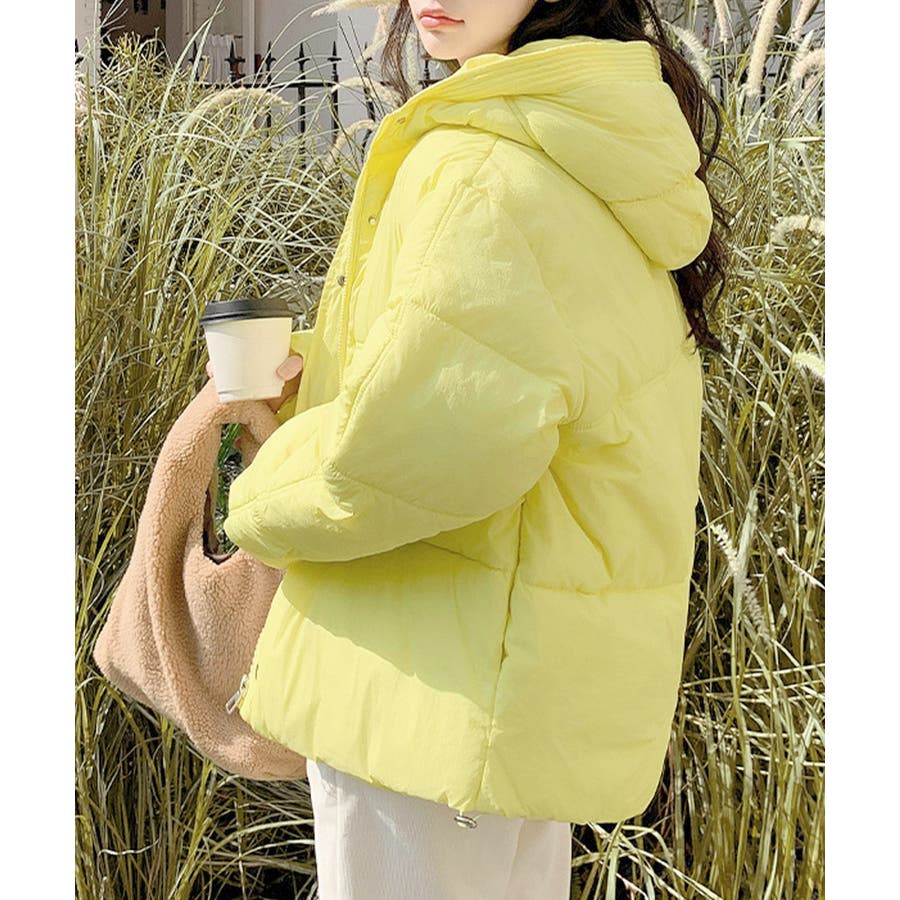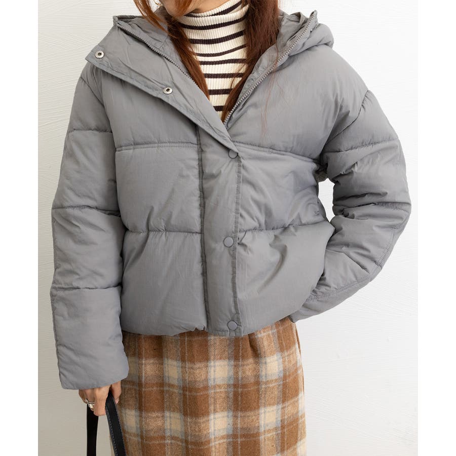 軽量で暖かい中綿素材を使用したフード付きのショート丈ダウンジャケット。