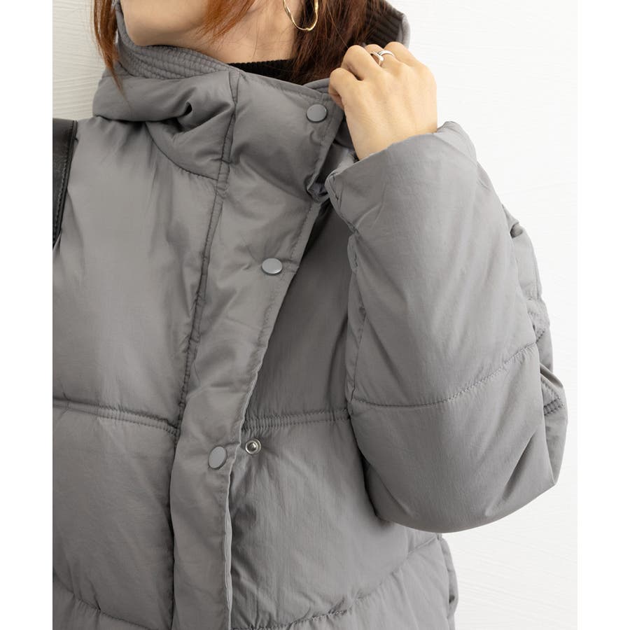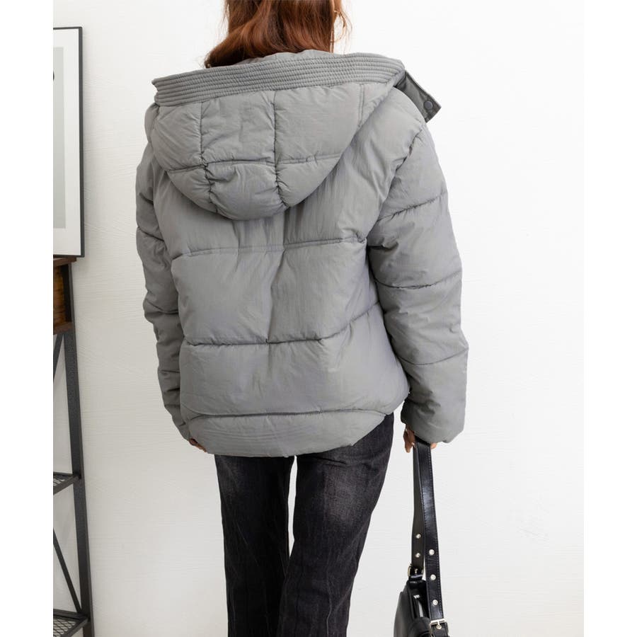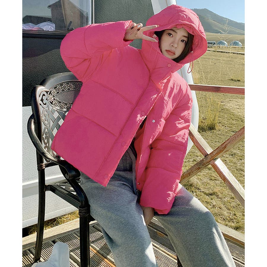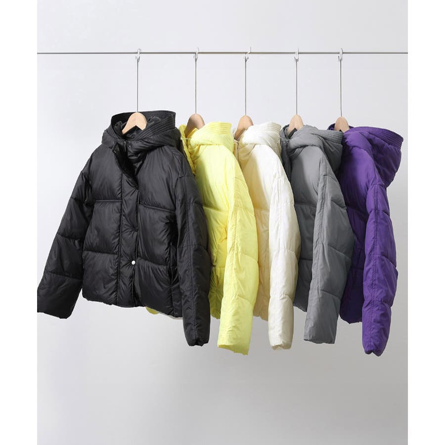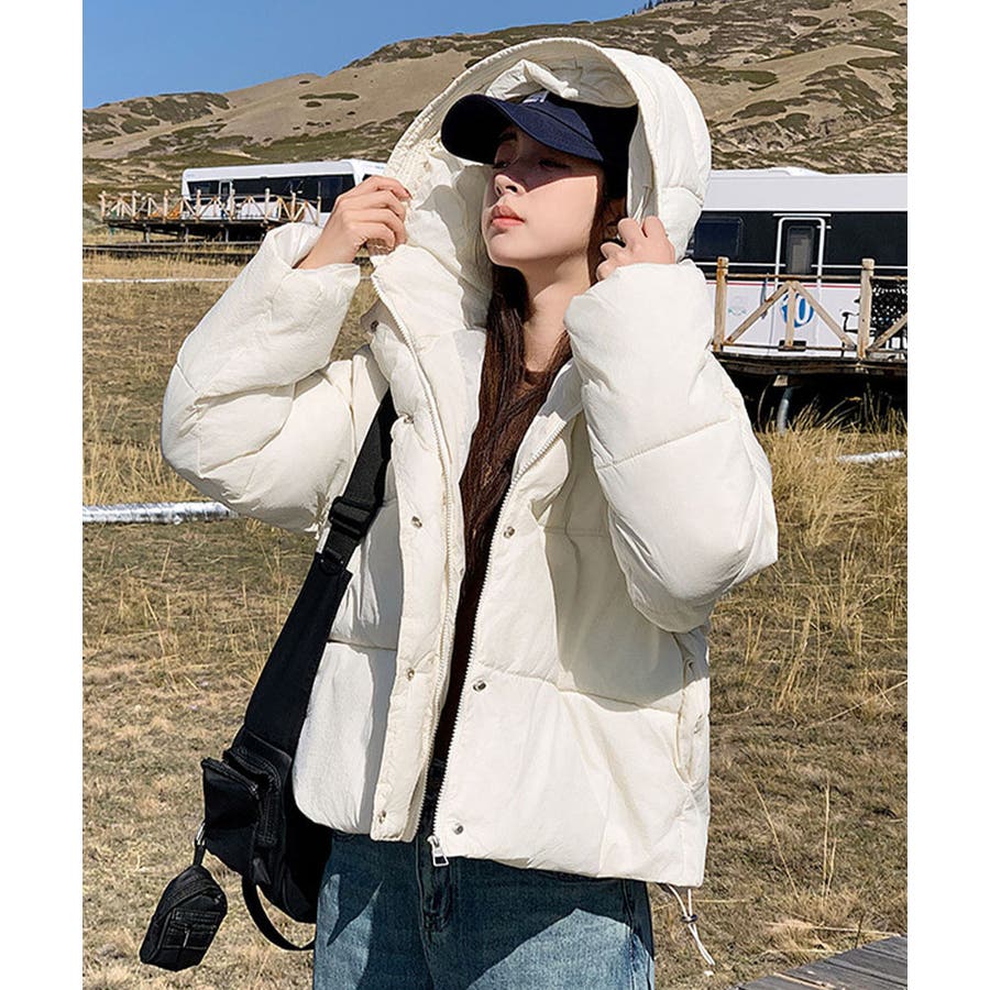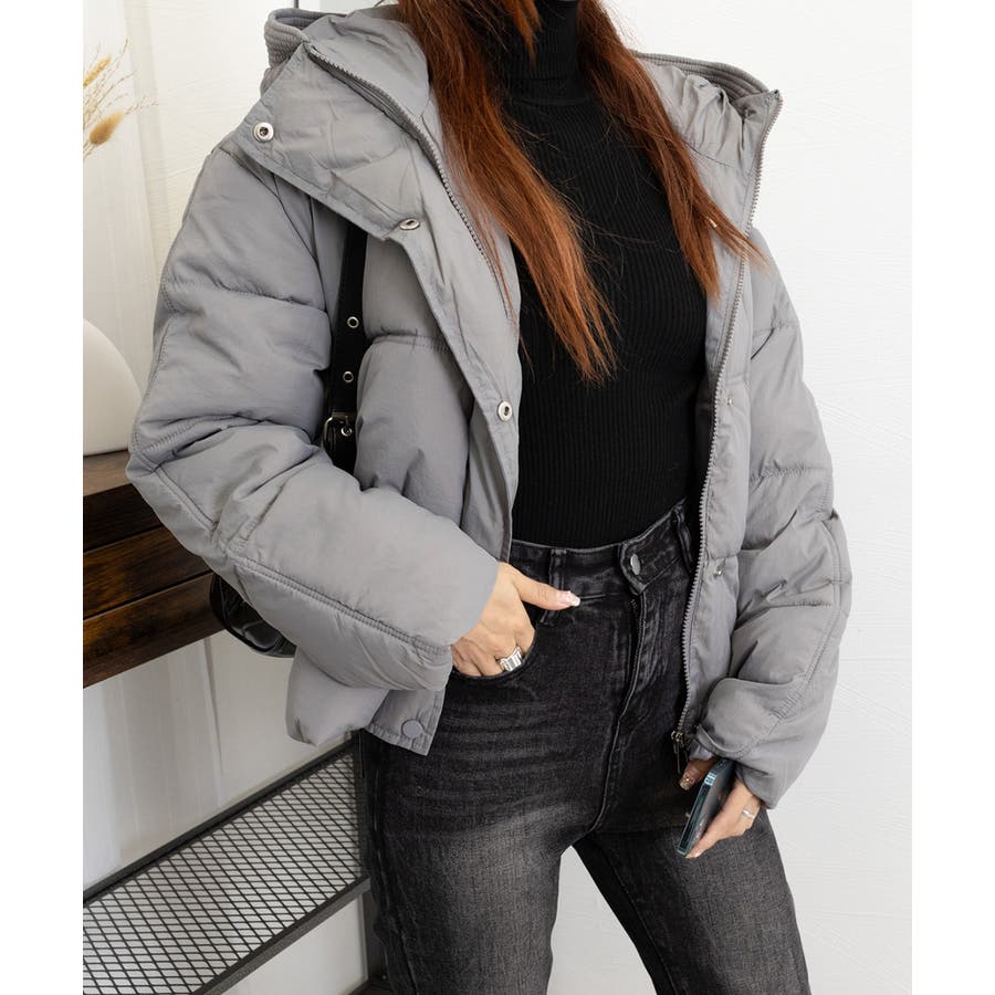 軽量で暖かい中綿素材を使用したフード付きのショート丈ダウンジャケット。