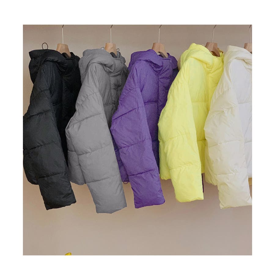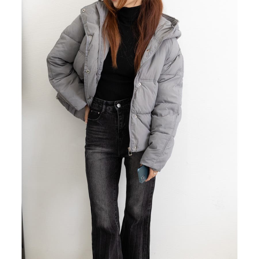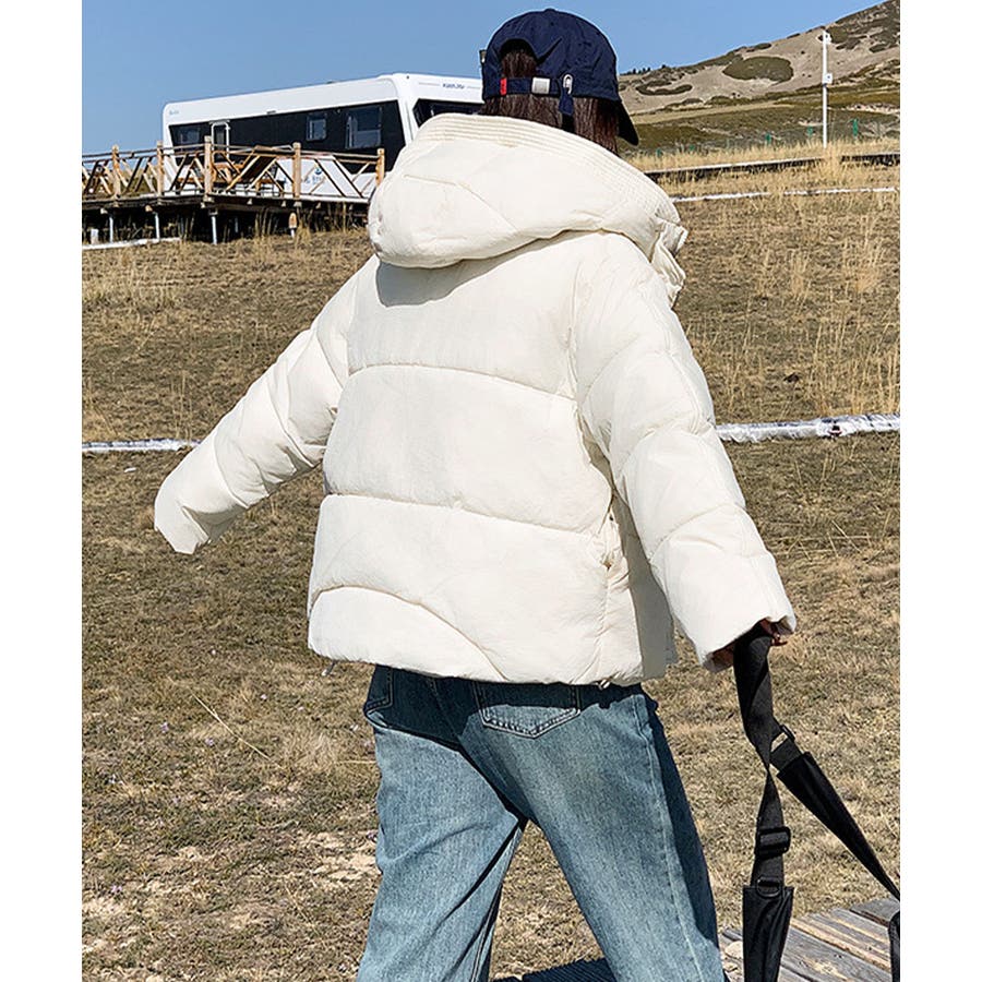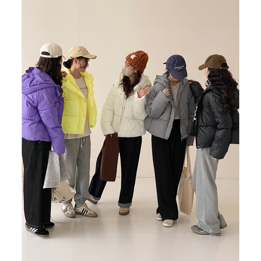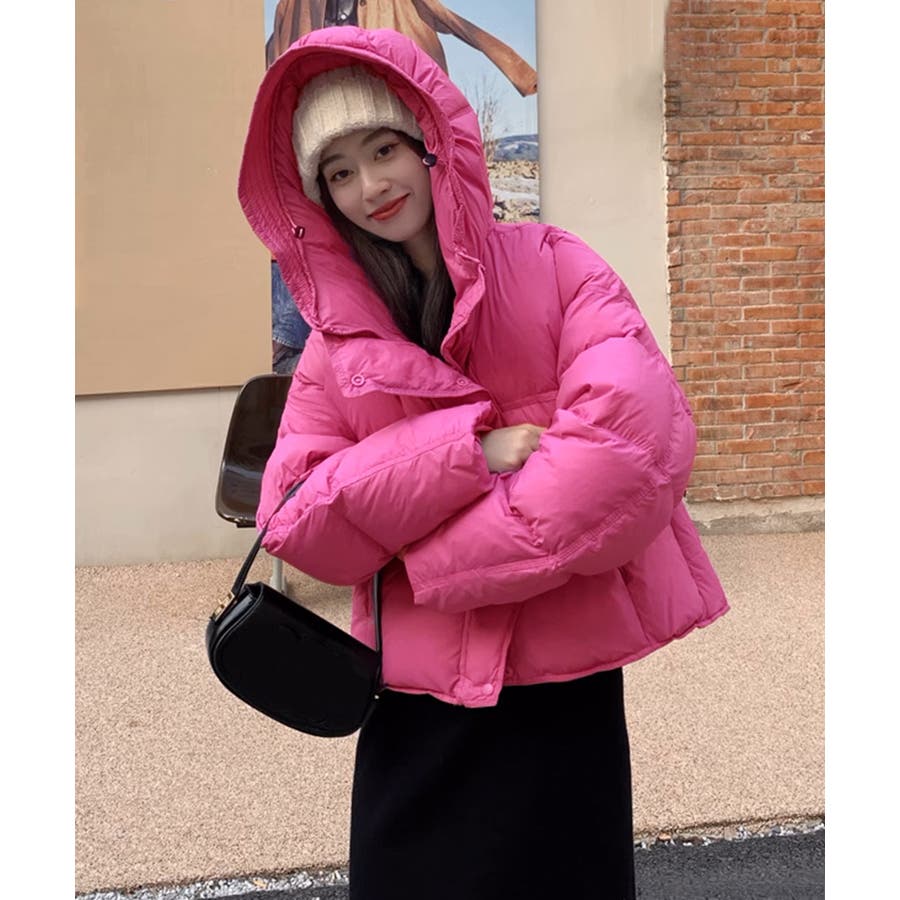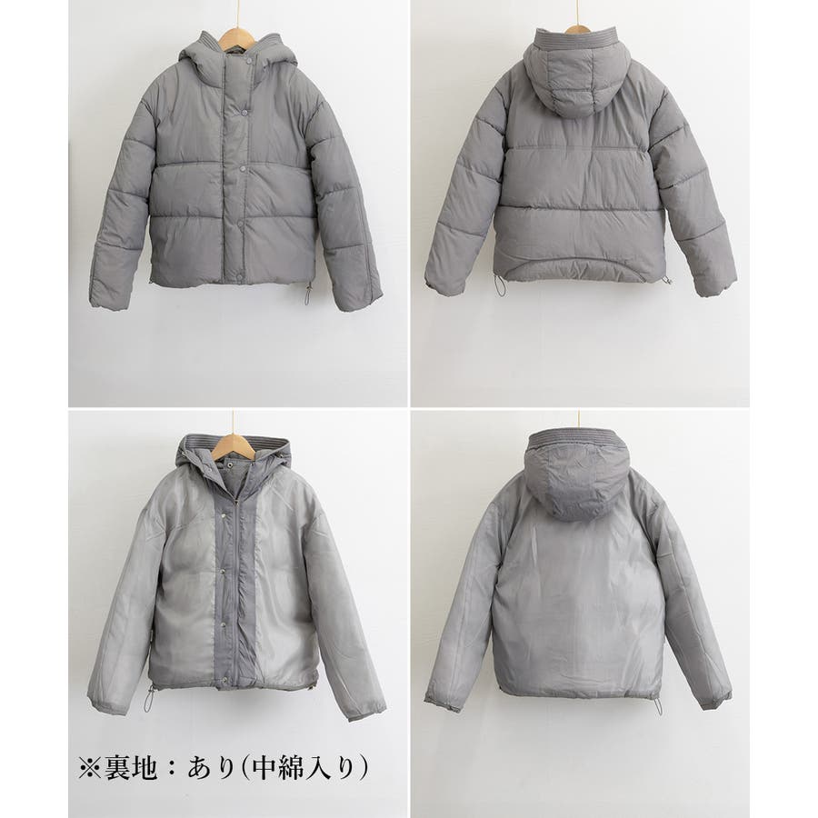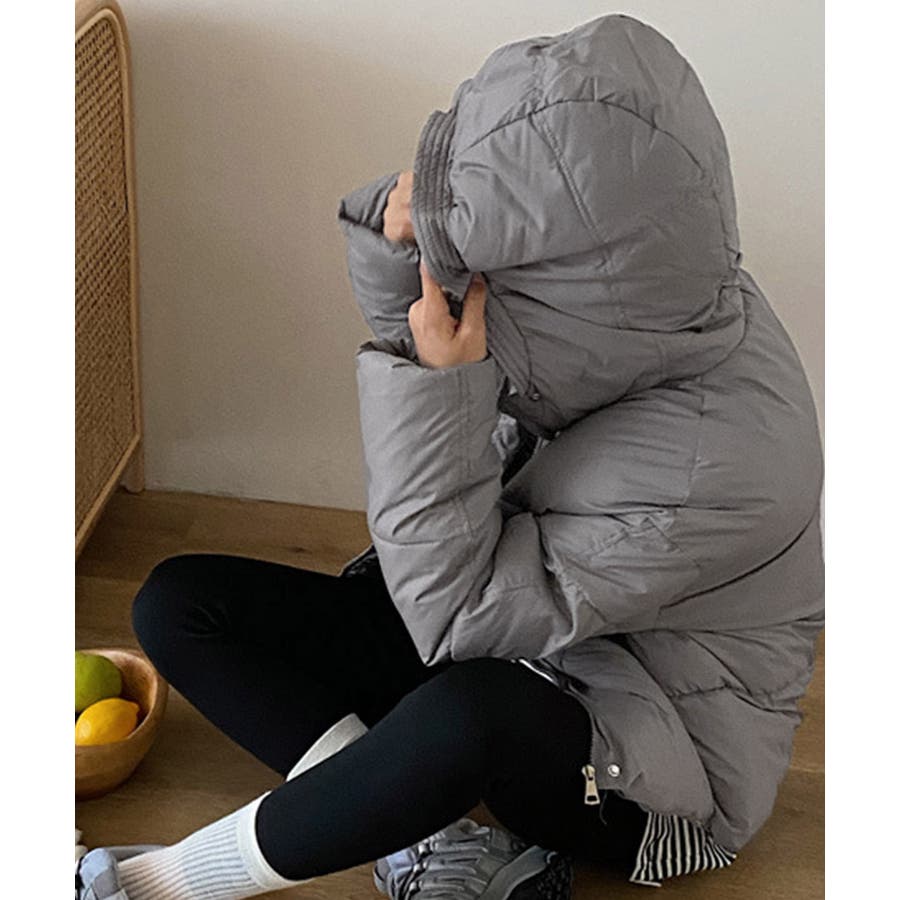 軽量で暖かい中綿素材を使用したフード付きのショート丈ダウンジャケット。