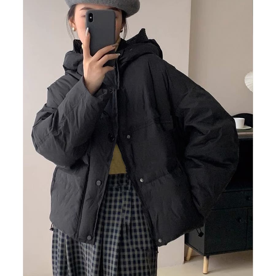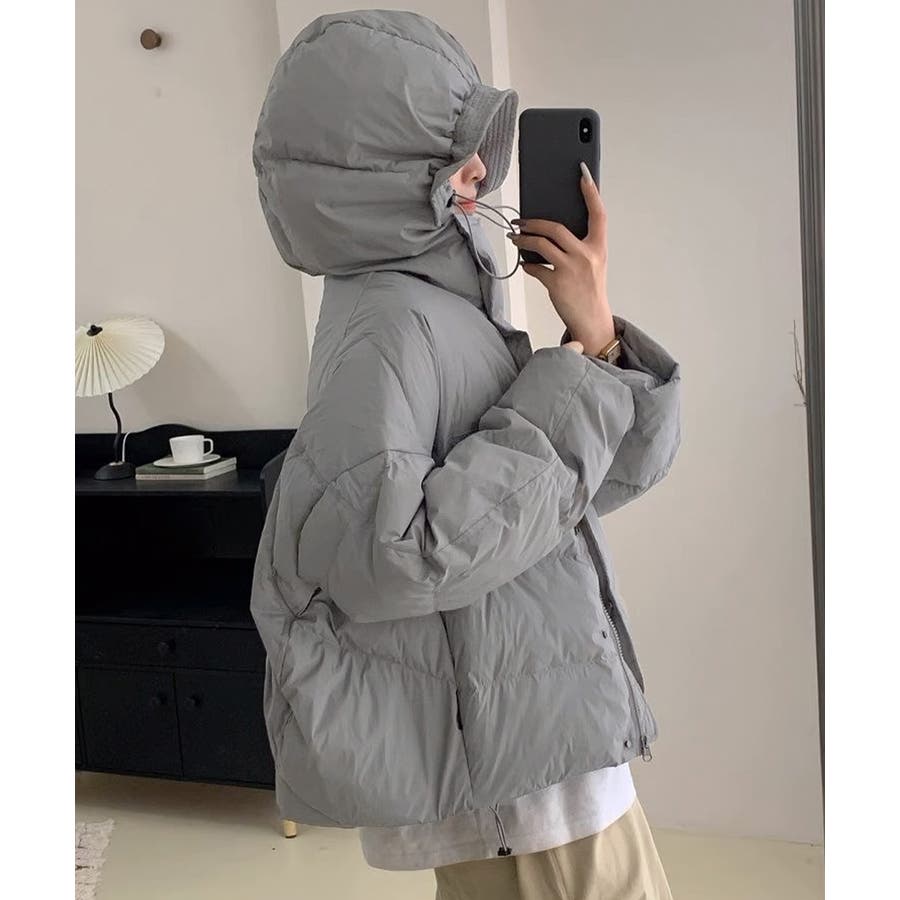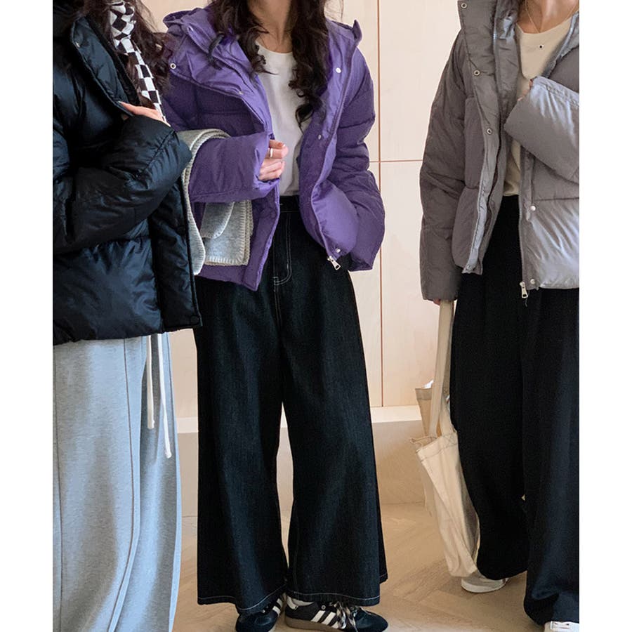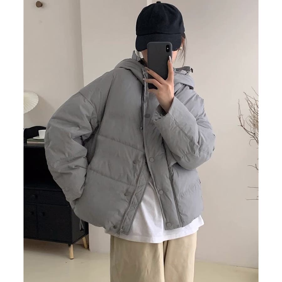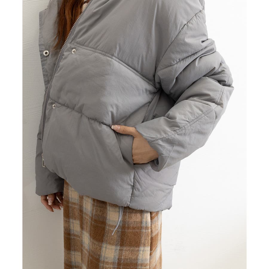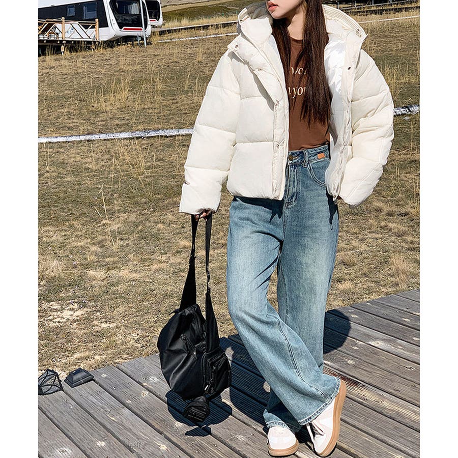 軽量で暖かい中綿素材を使用したフード付きのショート丈ダウンジャケット。