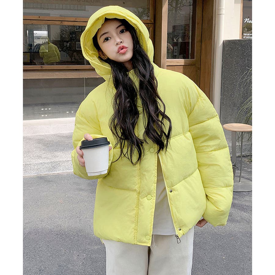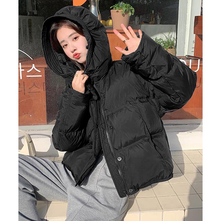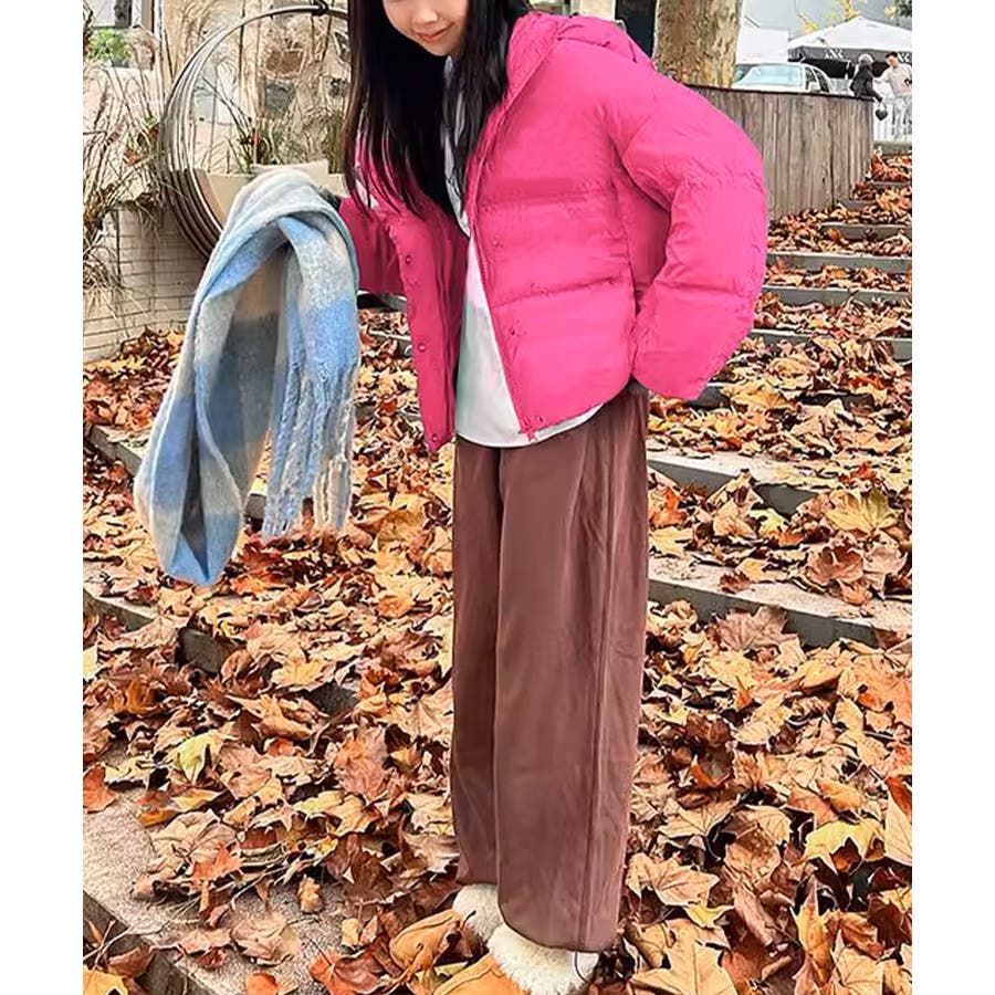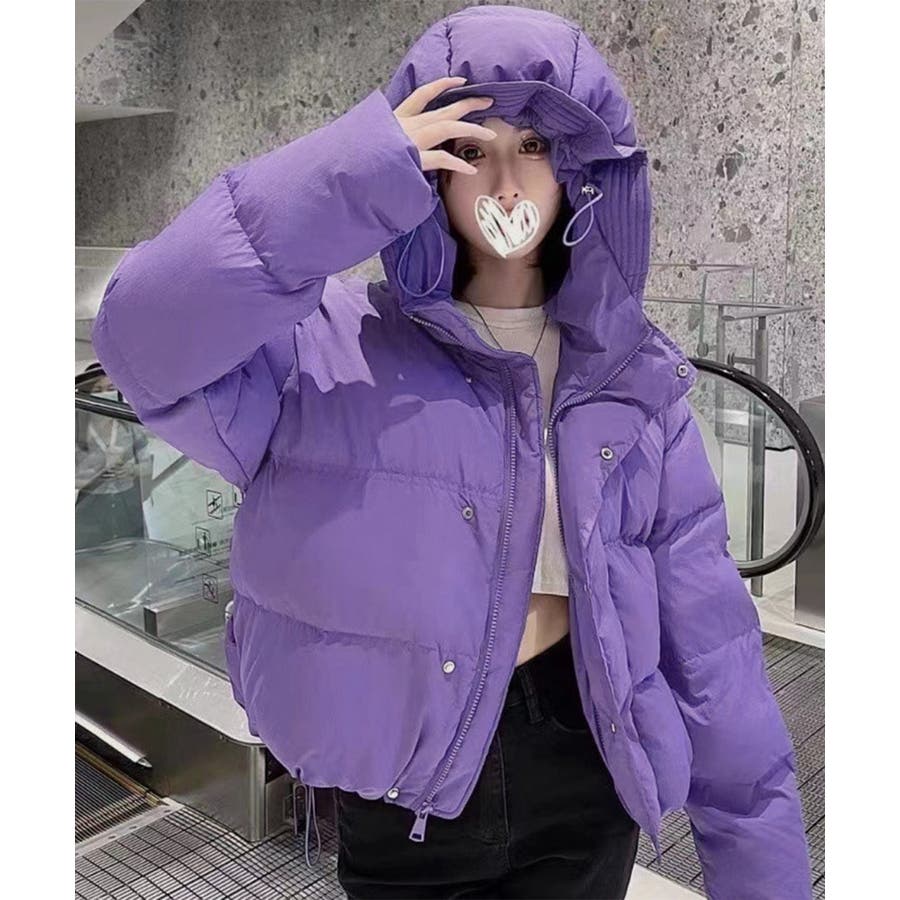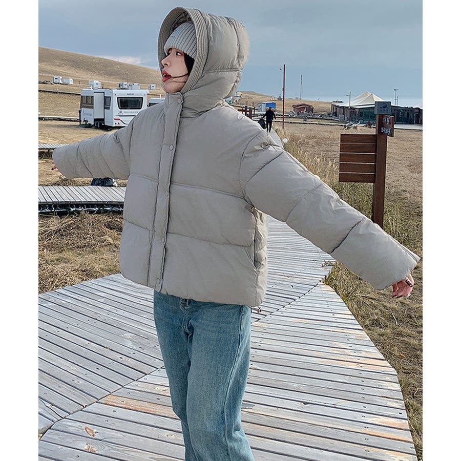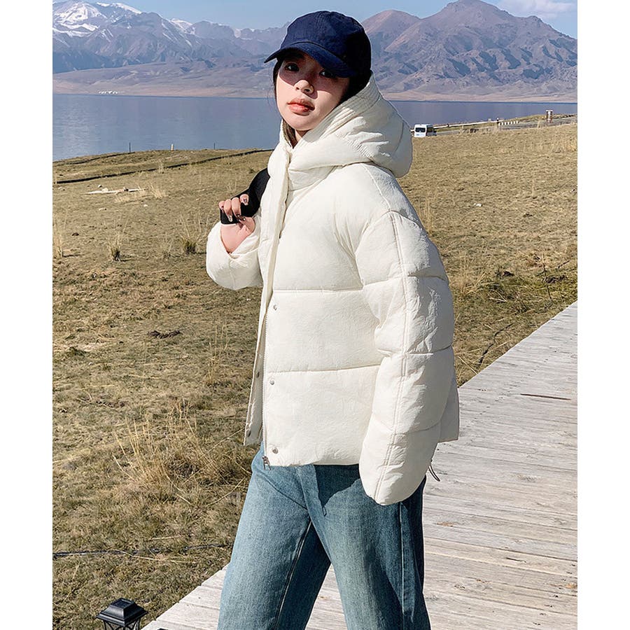 軽量で暖かい中綿素材を使用したフード付きのショート丈ダウンジャケット。