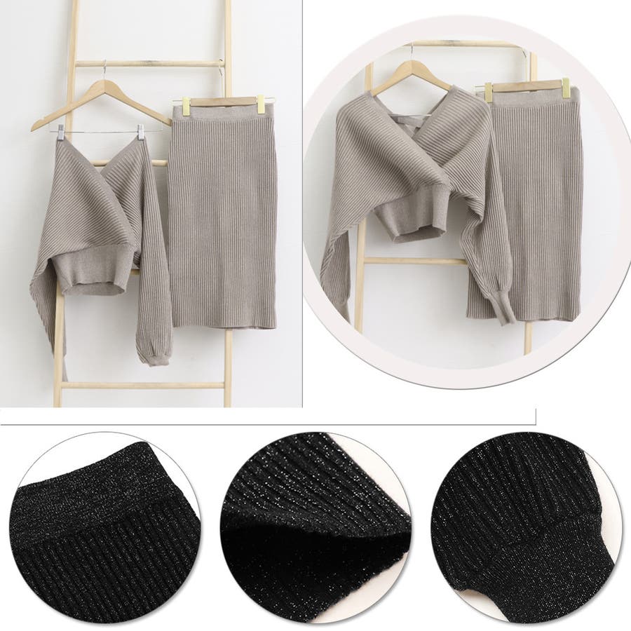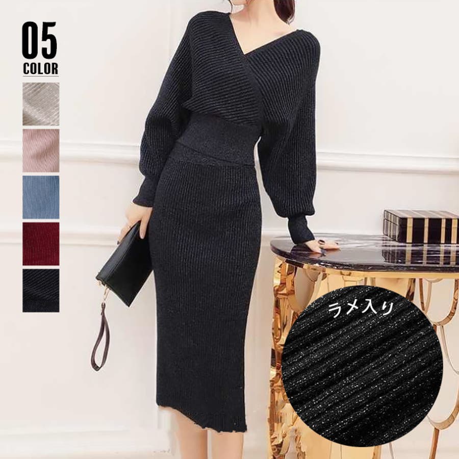 ラメの繊細な輝きでオトナエレガンスを演出、カシュクールトップスにペンシルスカートのリブ生地の上下2点セットアップ