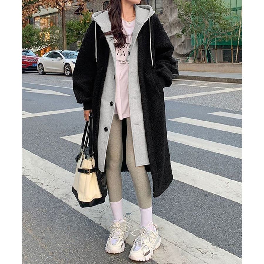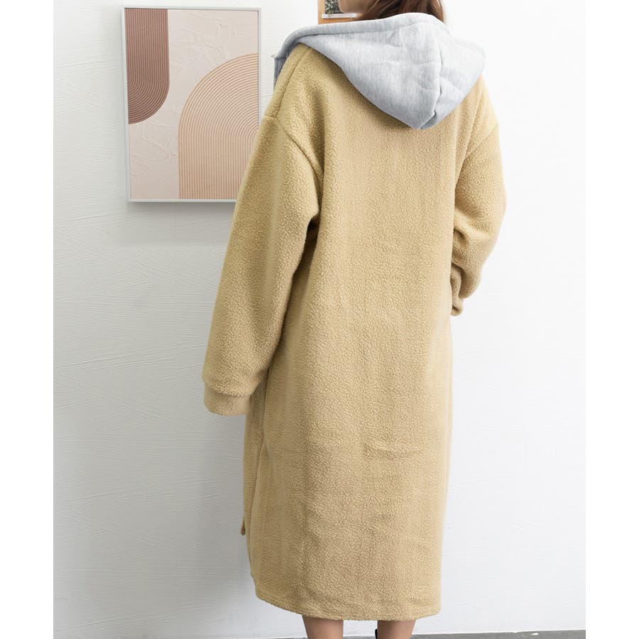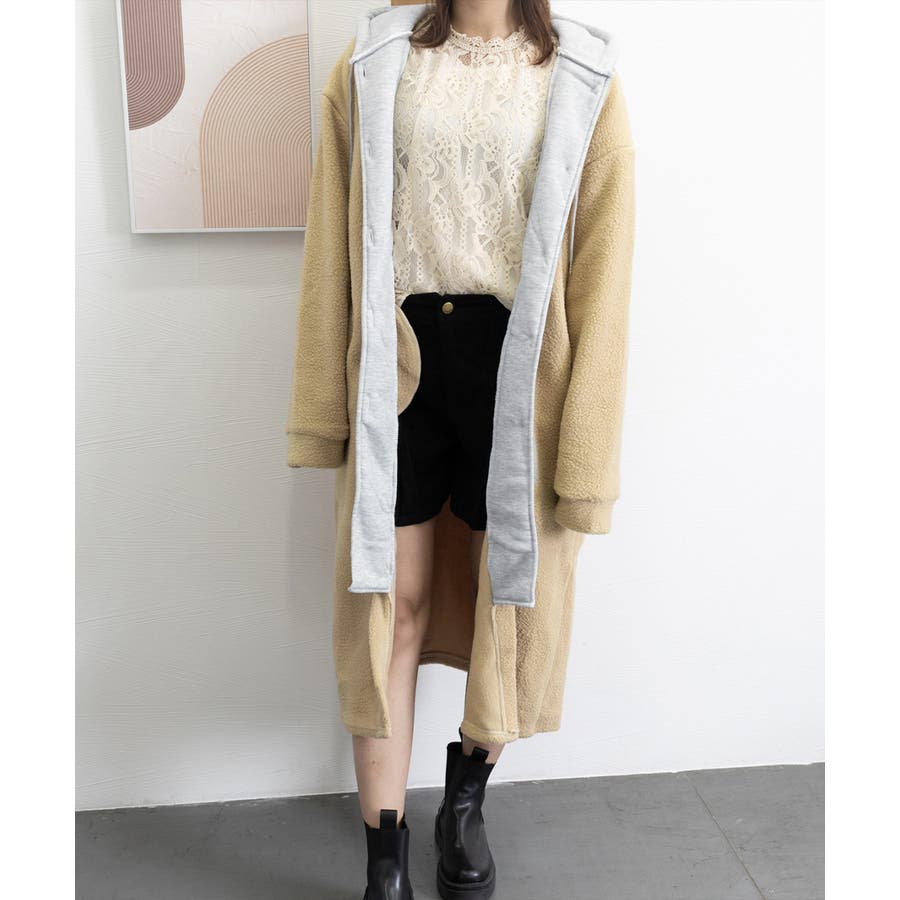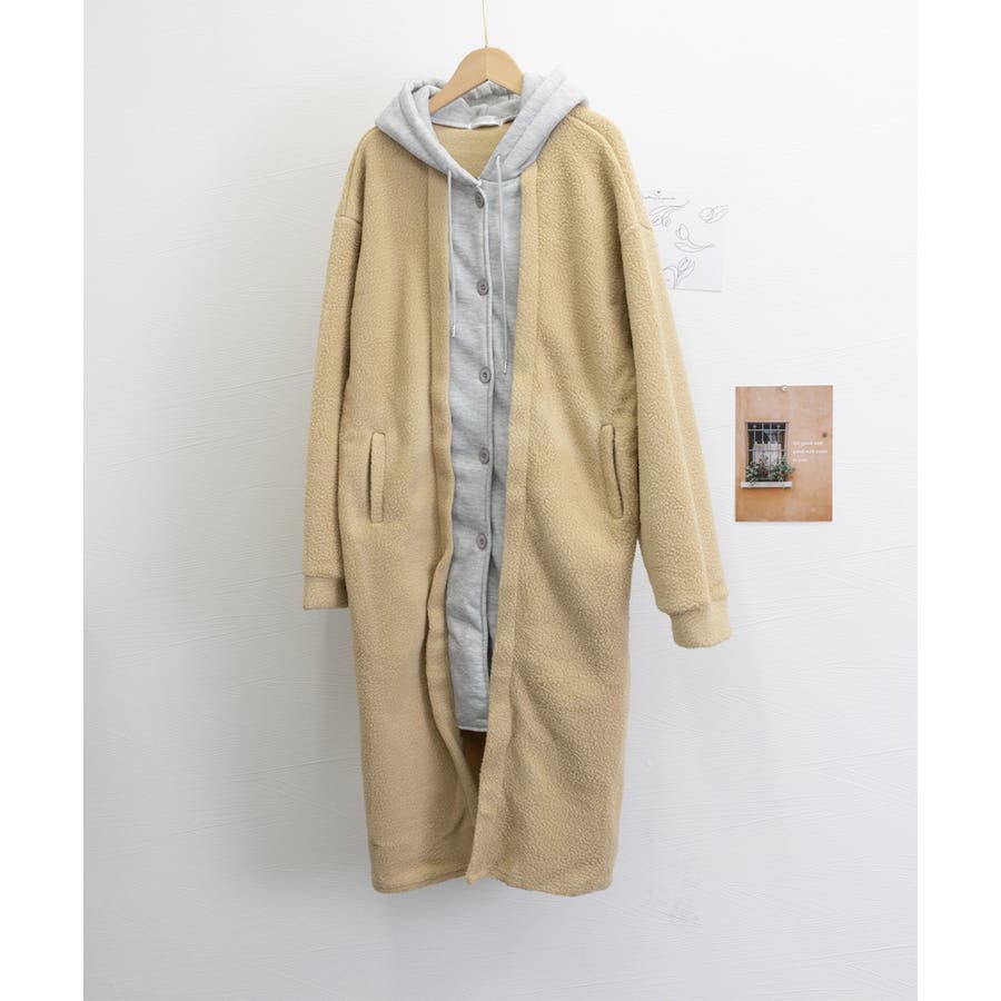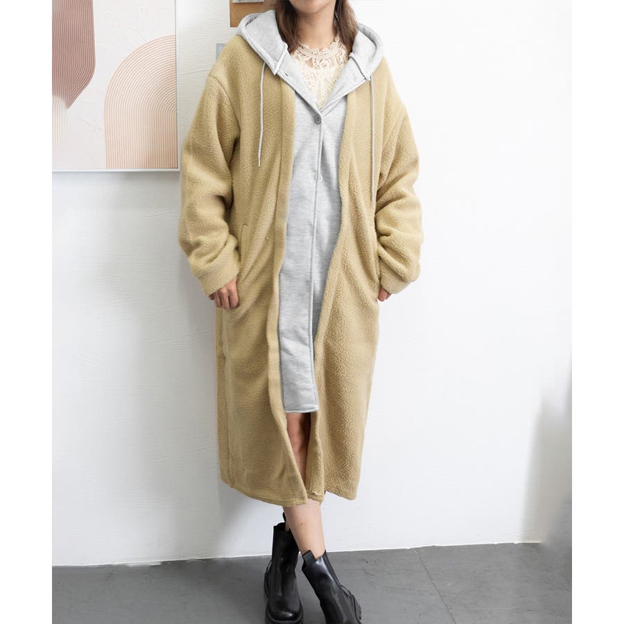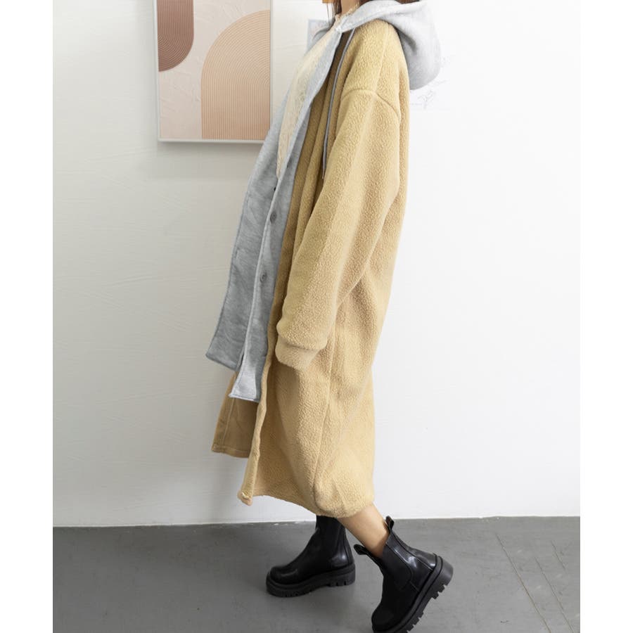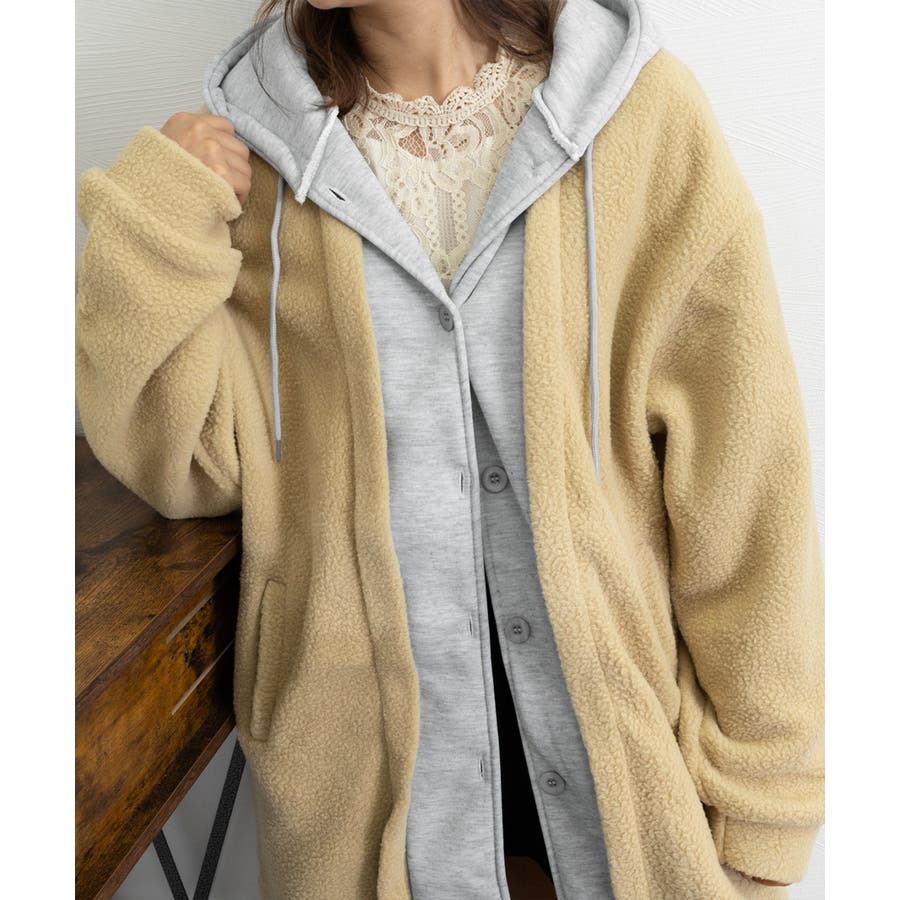 まるで中にパーカーを着ているかのようなレイヤードスタイルのボアロングコート