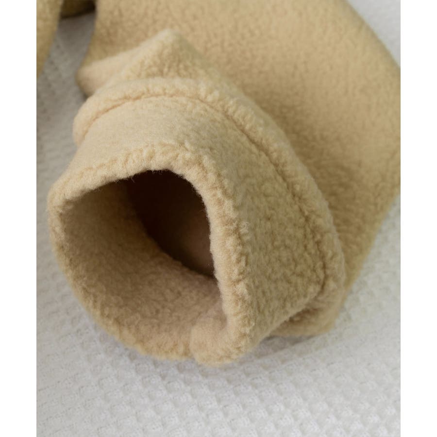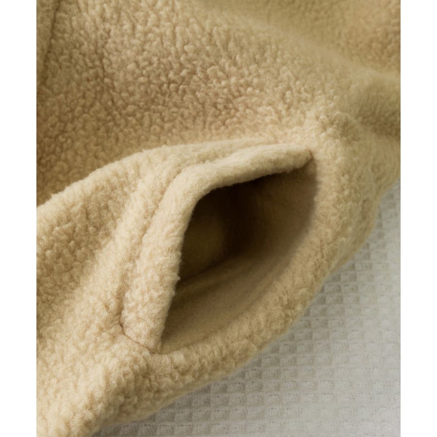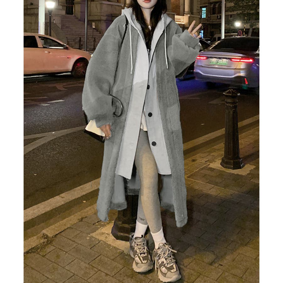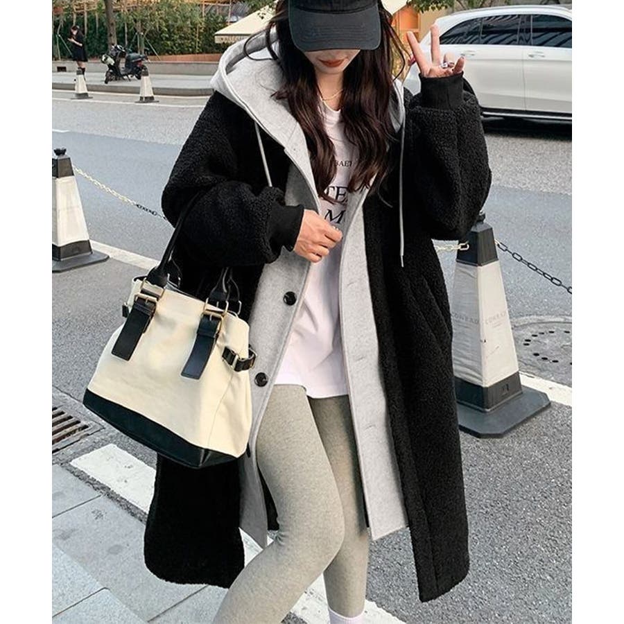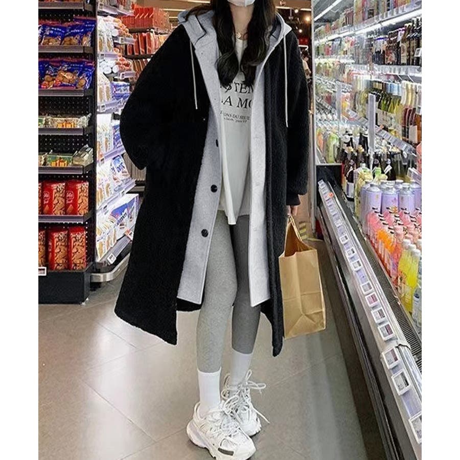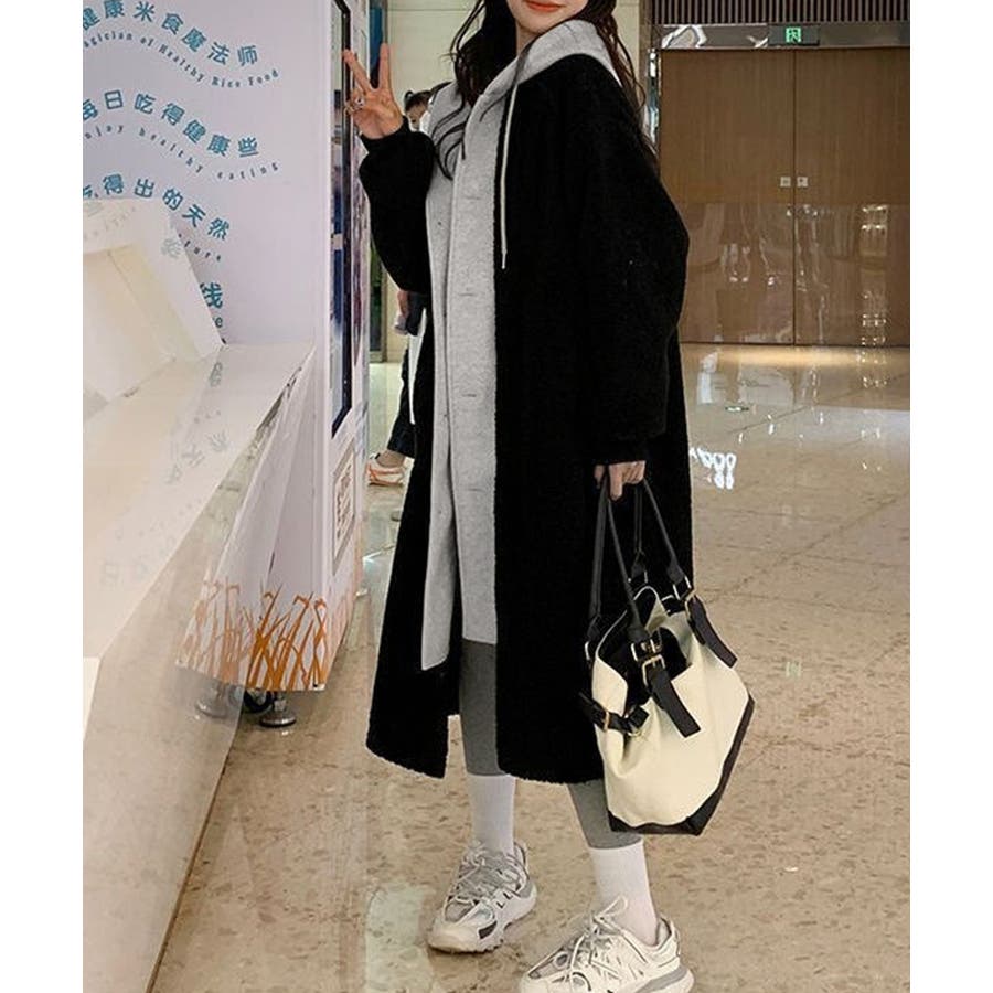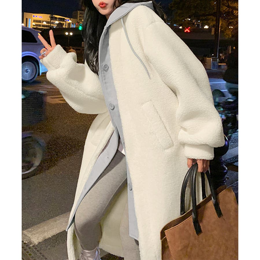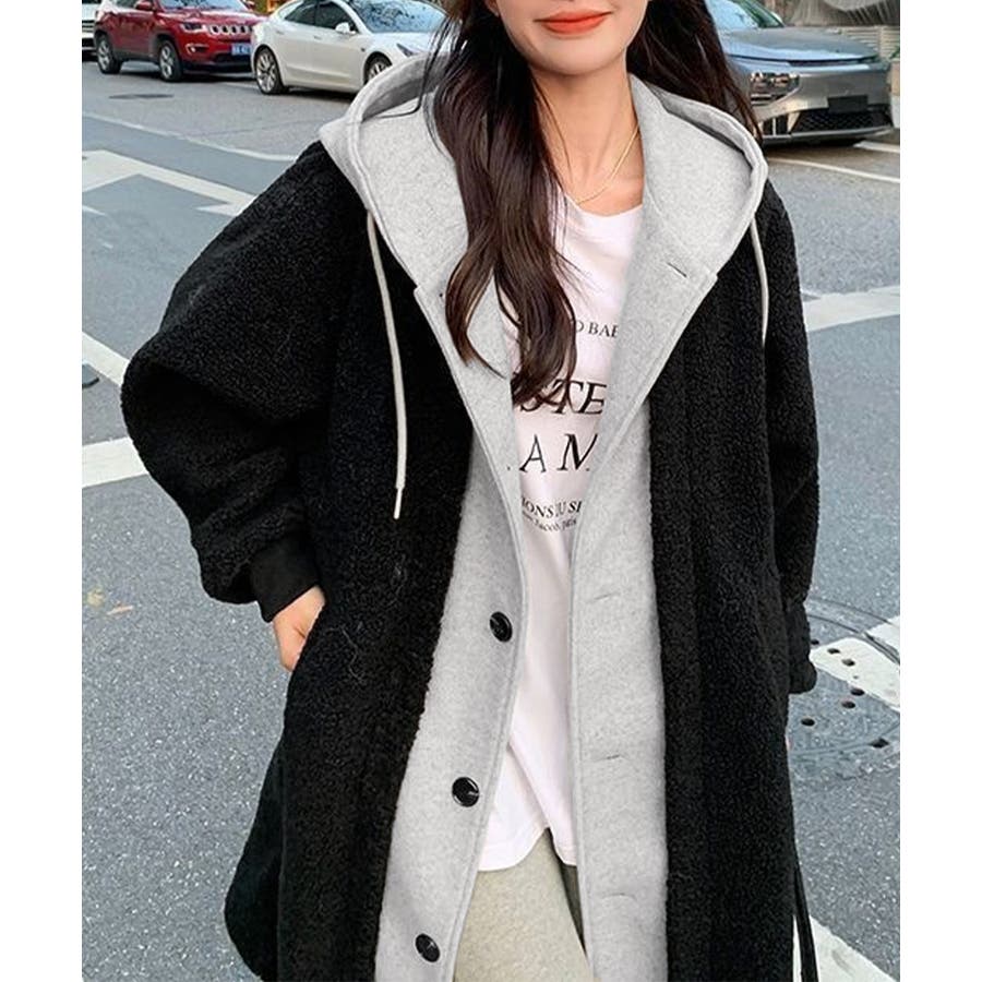 まるで中にパーカーを着ているかのようなレイヤードスタイルのボアロングコート