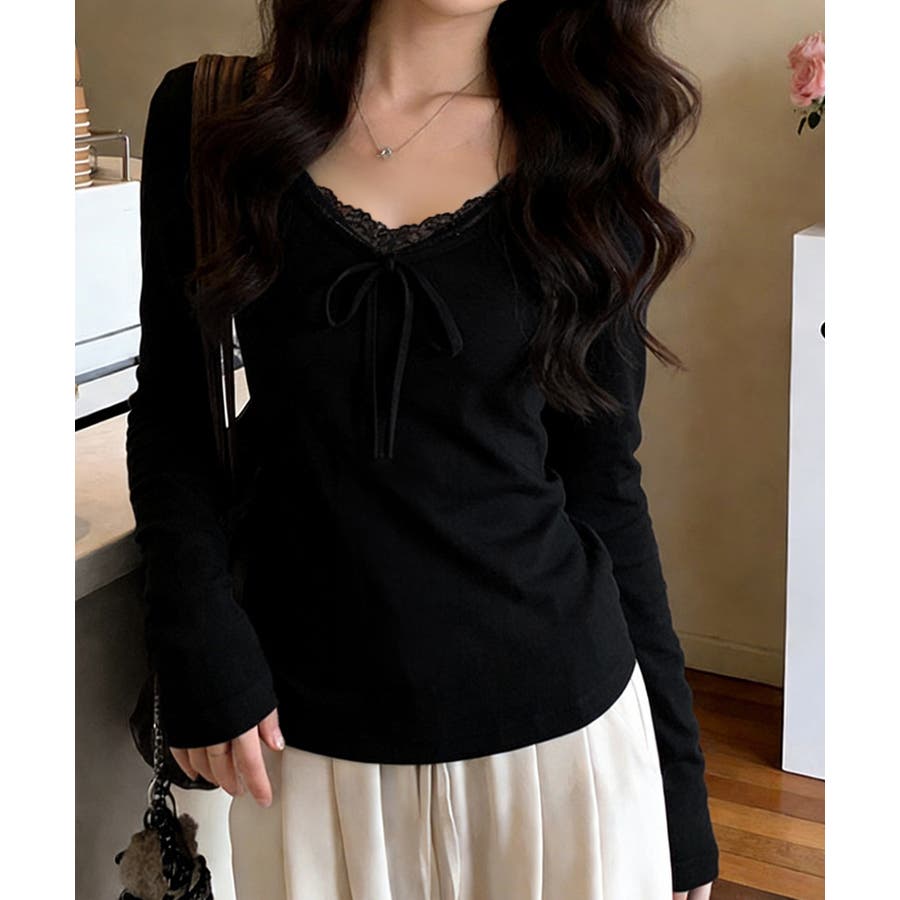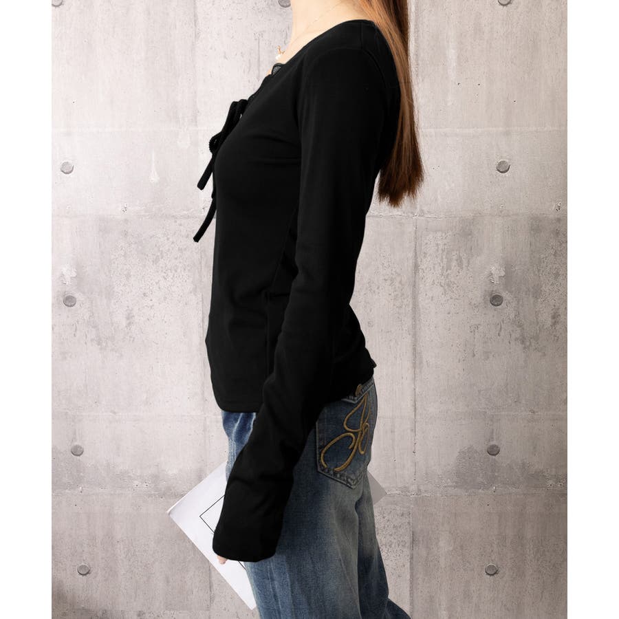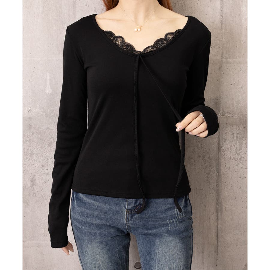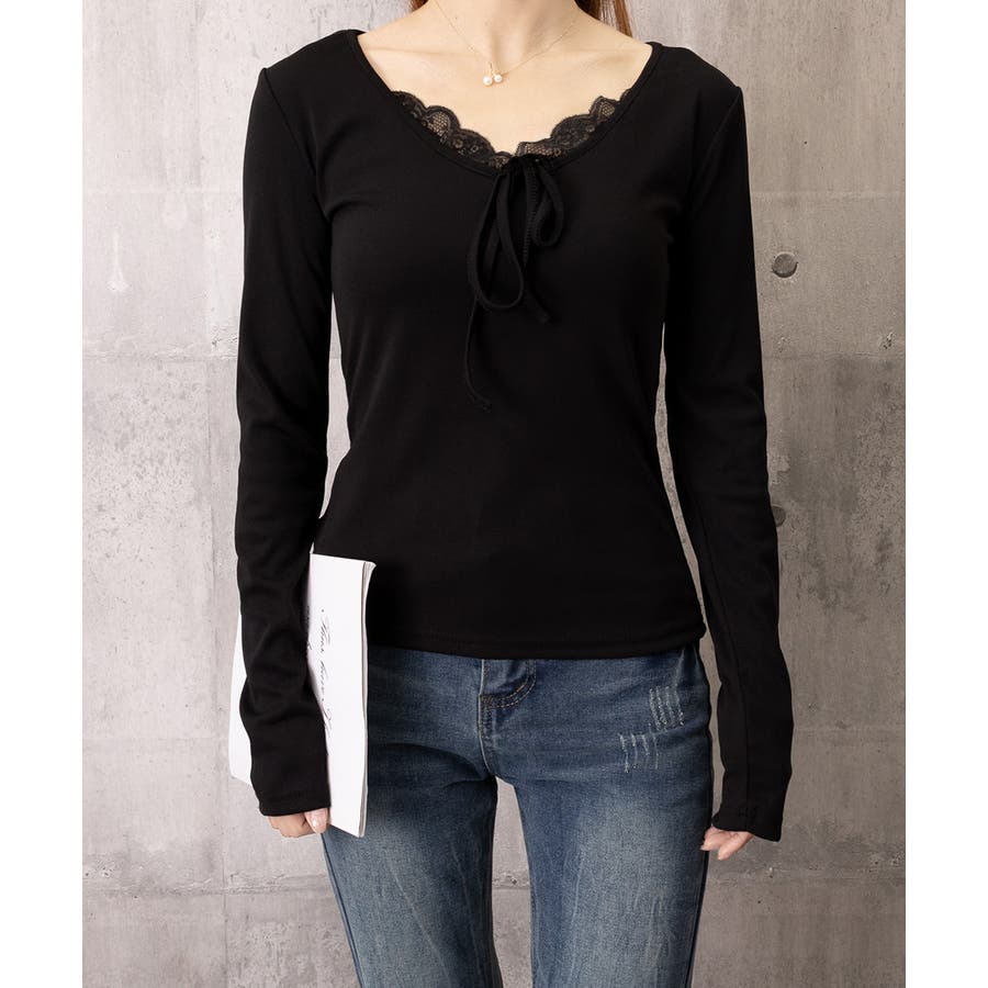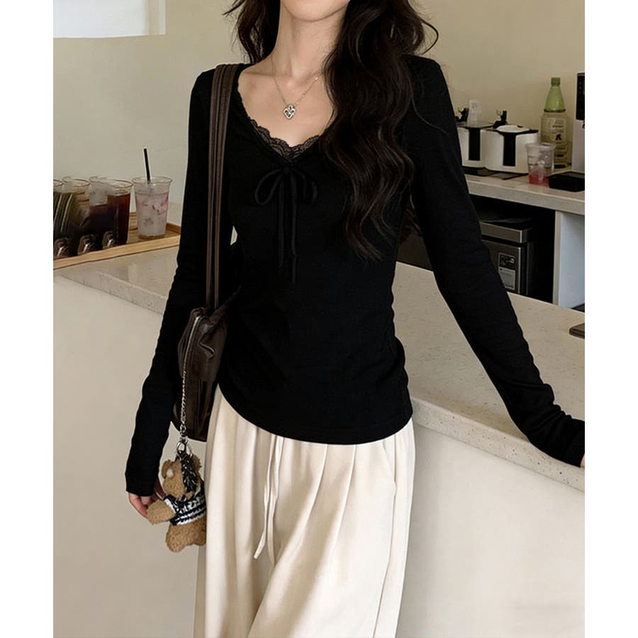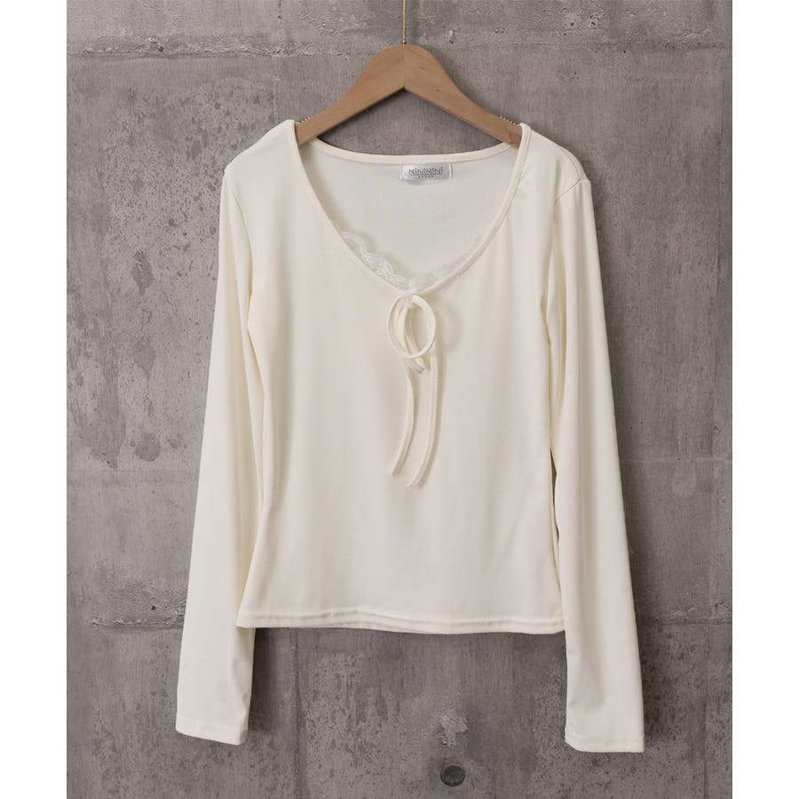 レースのネックラインとフロントリボンが可愛らしい、フェミニンな長袖トップス。