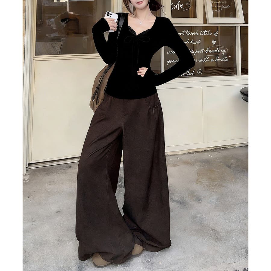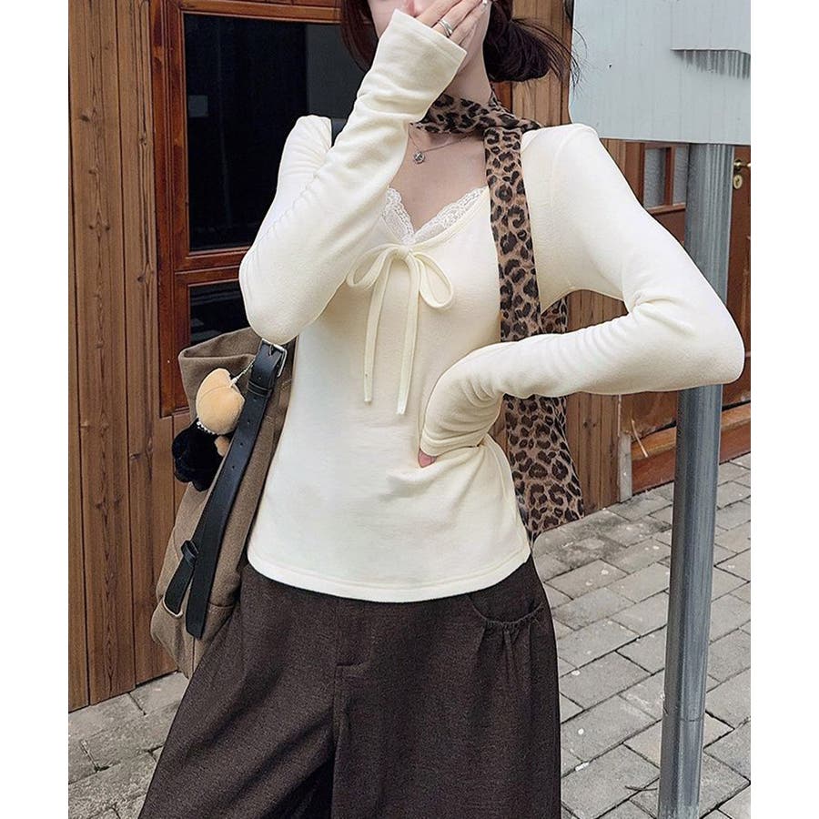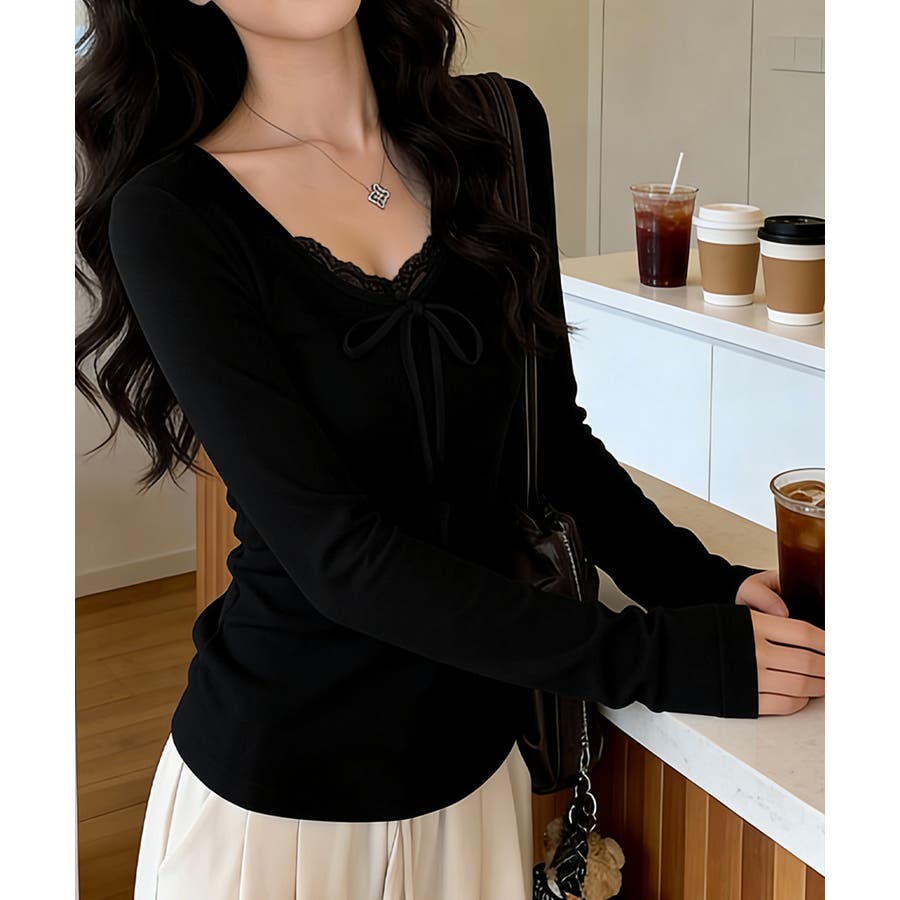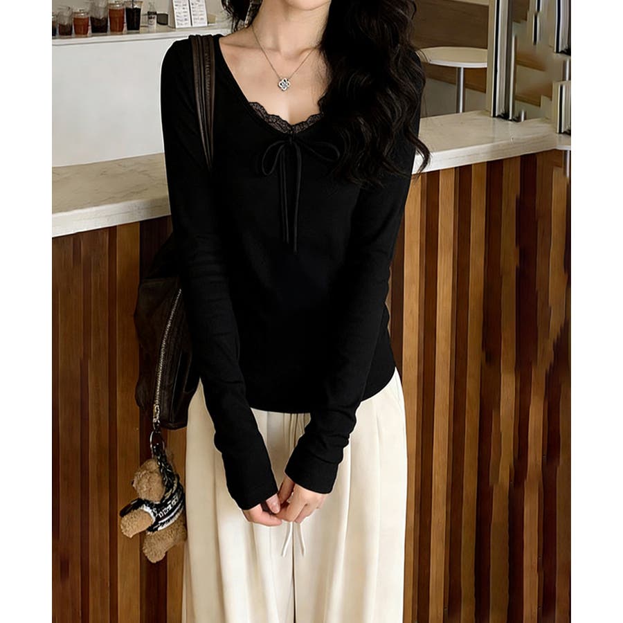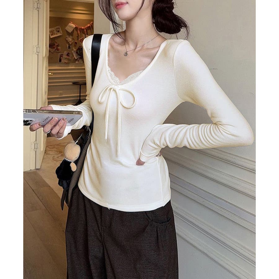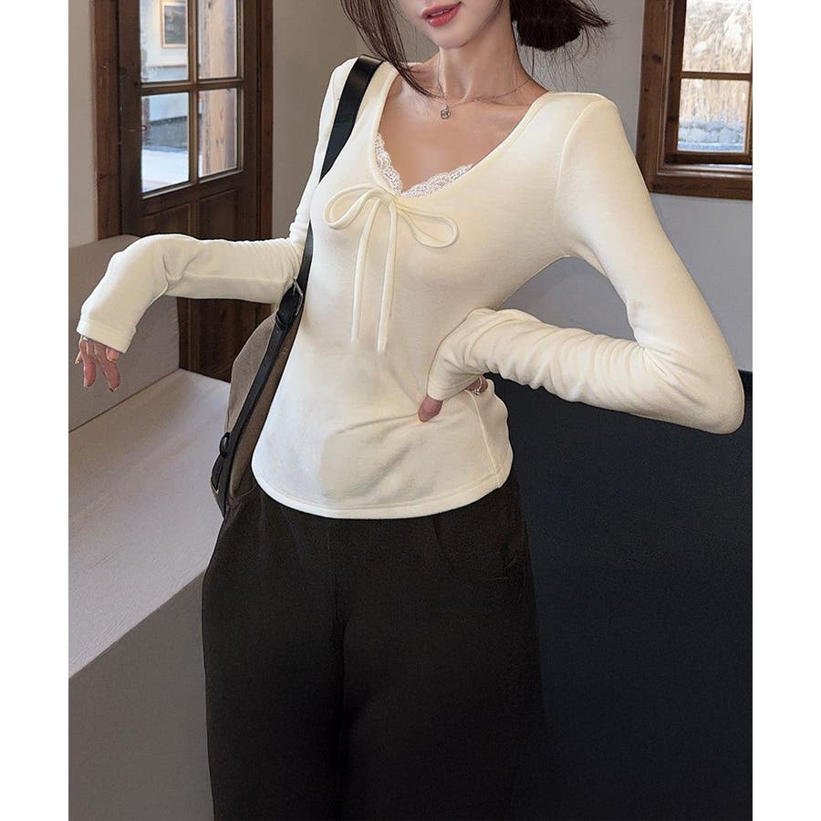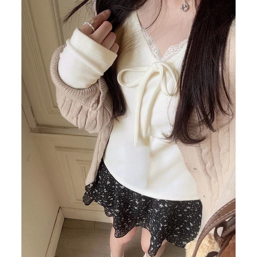 レースのネックラインとフロントリボンが可愛らしい、フェミニンな長袖トップス。