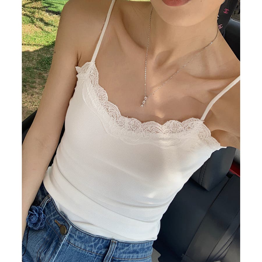 リブキャミソールは、胸元のレースがさりげないアクセントに。