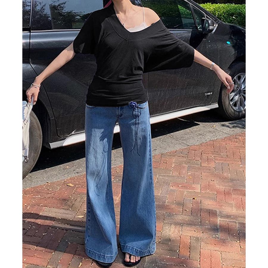 オフショルトップス カットソーゆったり 韓国風t体型カバー
