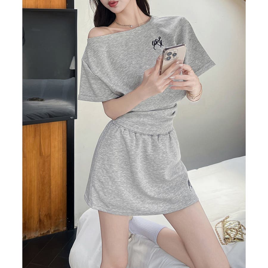 韓国風のオフショルトップスとミニスカートがセットになった、夏にぴったりのガーリーなセットアップ。