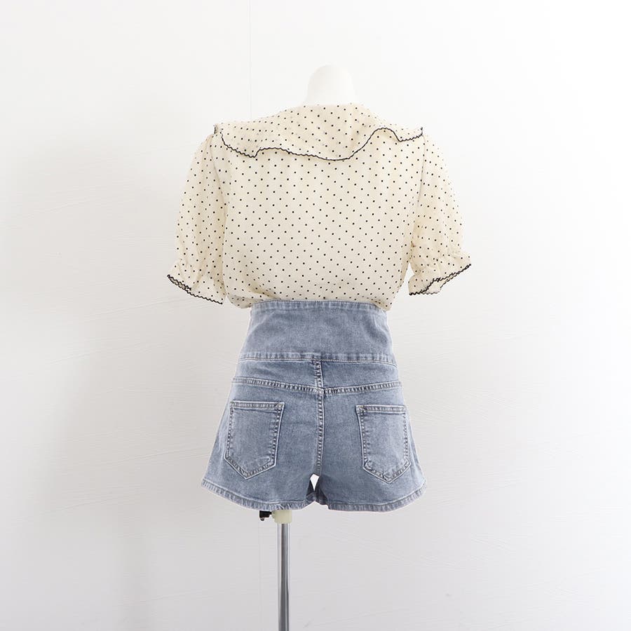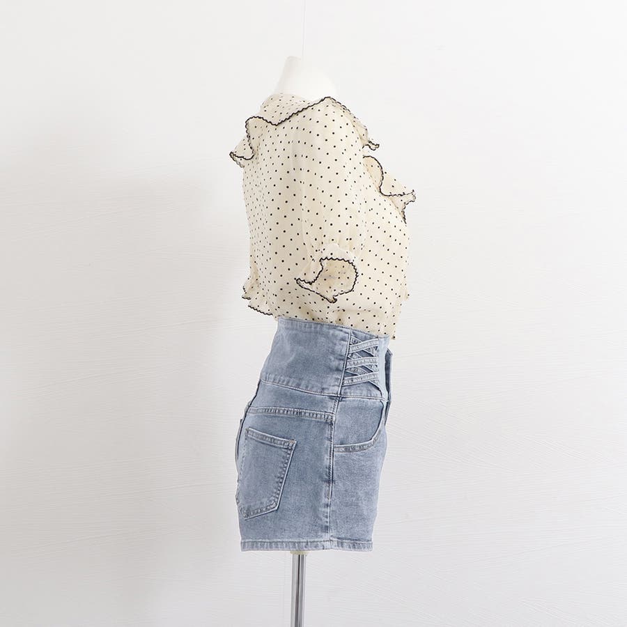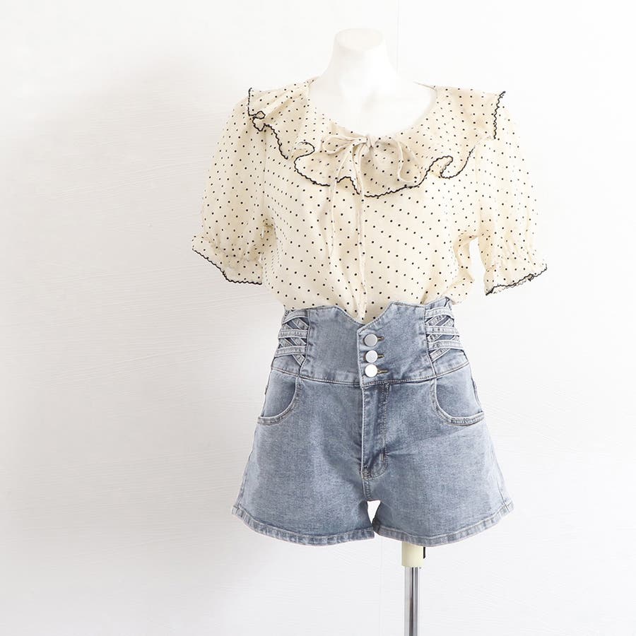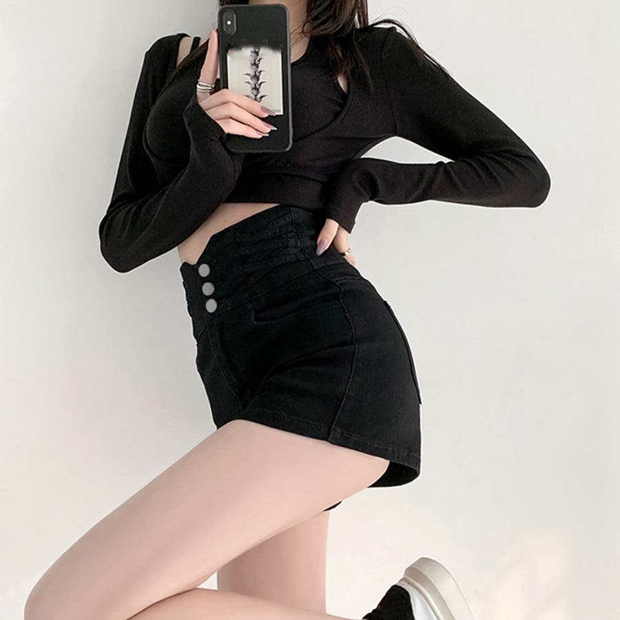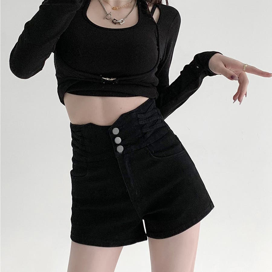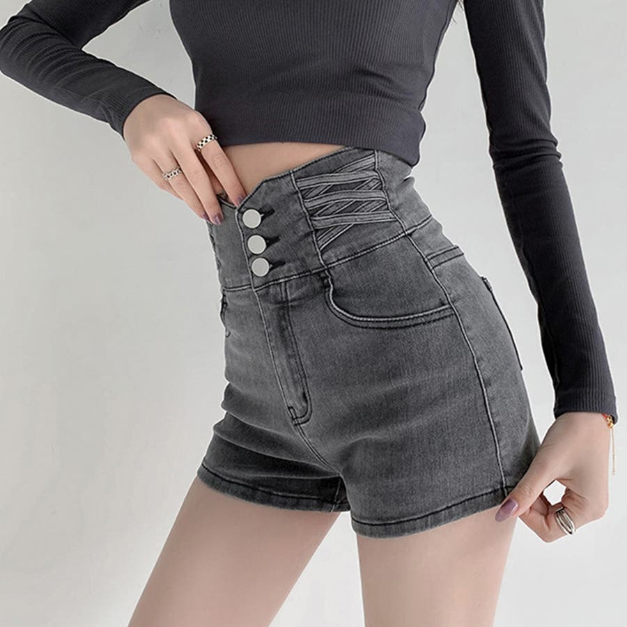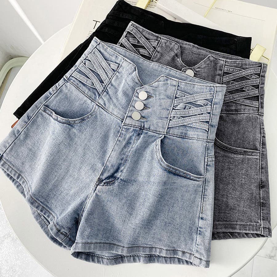 3連ボダンとクロスさせたループがアクセントのデニムショートパンツ