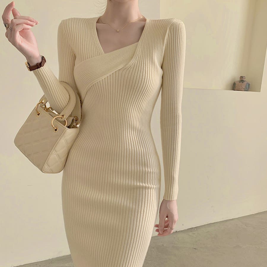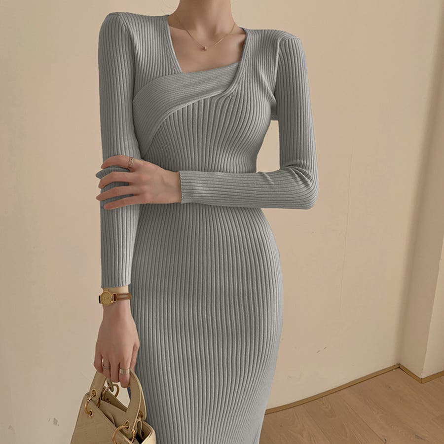タイトなシルエットで女性らしさをアピールできるリブニットワンピース
