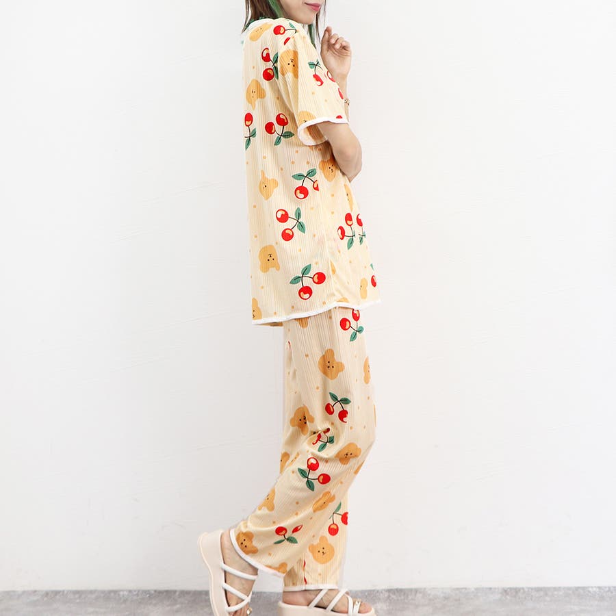 大ぶりに散りばめられた華やかな柄物が大人可愛いガーリーテイストのパジャマセット