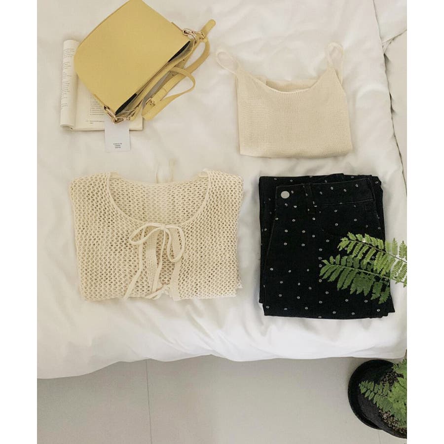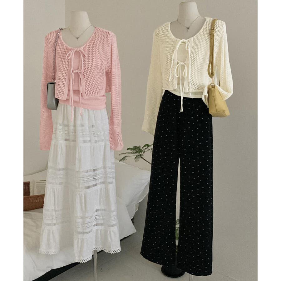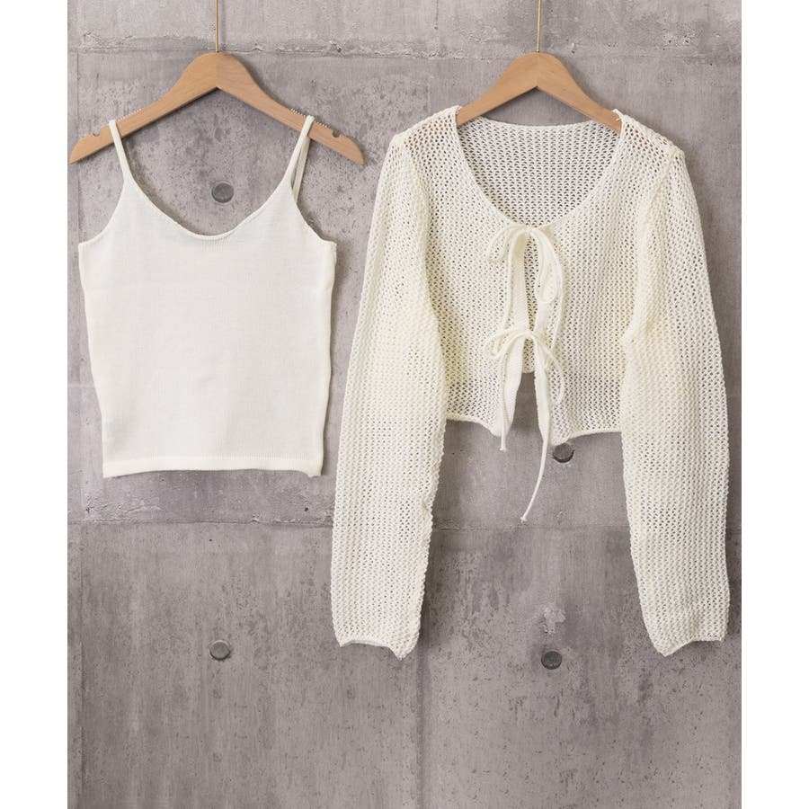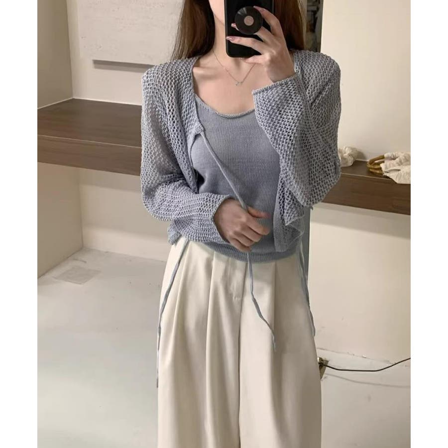 軽やかなメッシュ素材のカーディガンとシンプルなキャミソールのレイヤードで、抜け感のあるフェミニンスタイルに仕上がる。