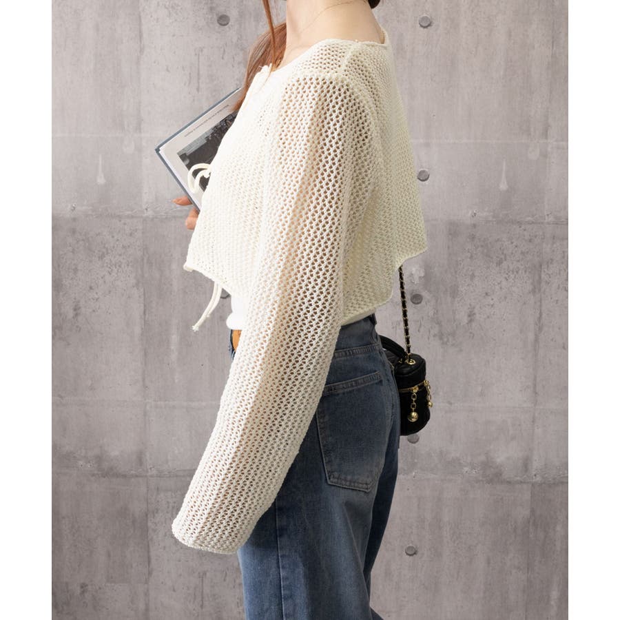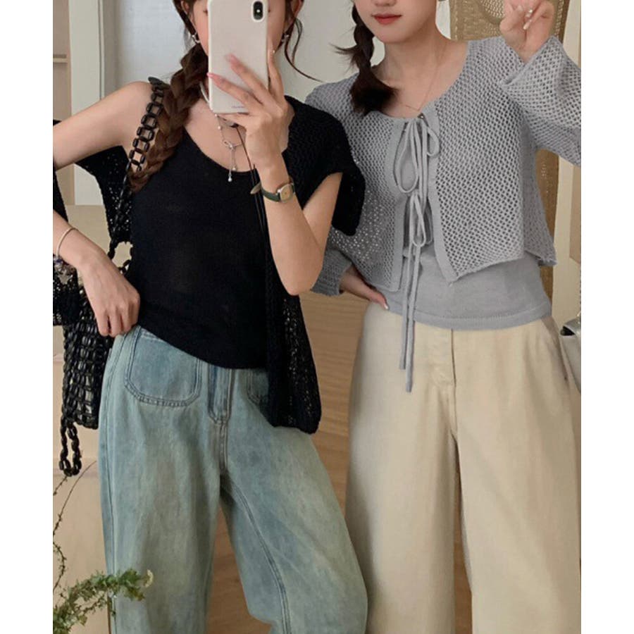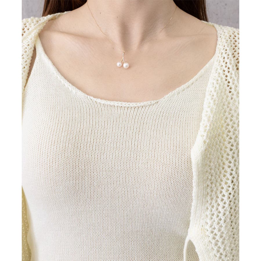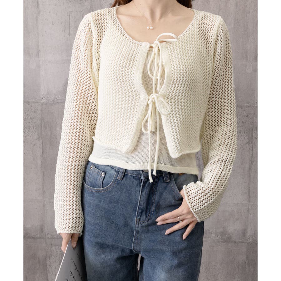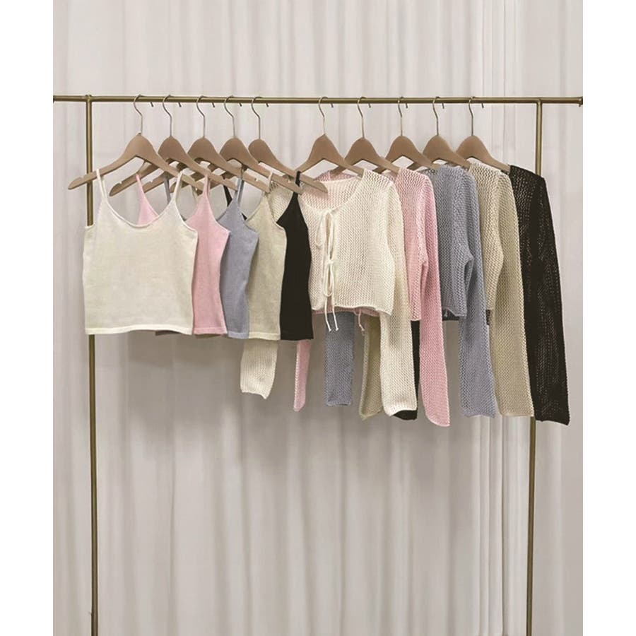軽やかなメッシュ素材のカーディガンとシンプルなキャミソールのレイヤードで、抜け感のあるフェミニンスタイルに仕上がる。