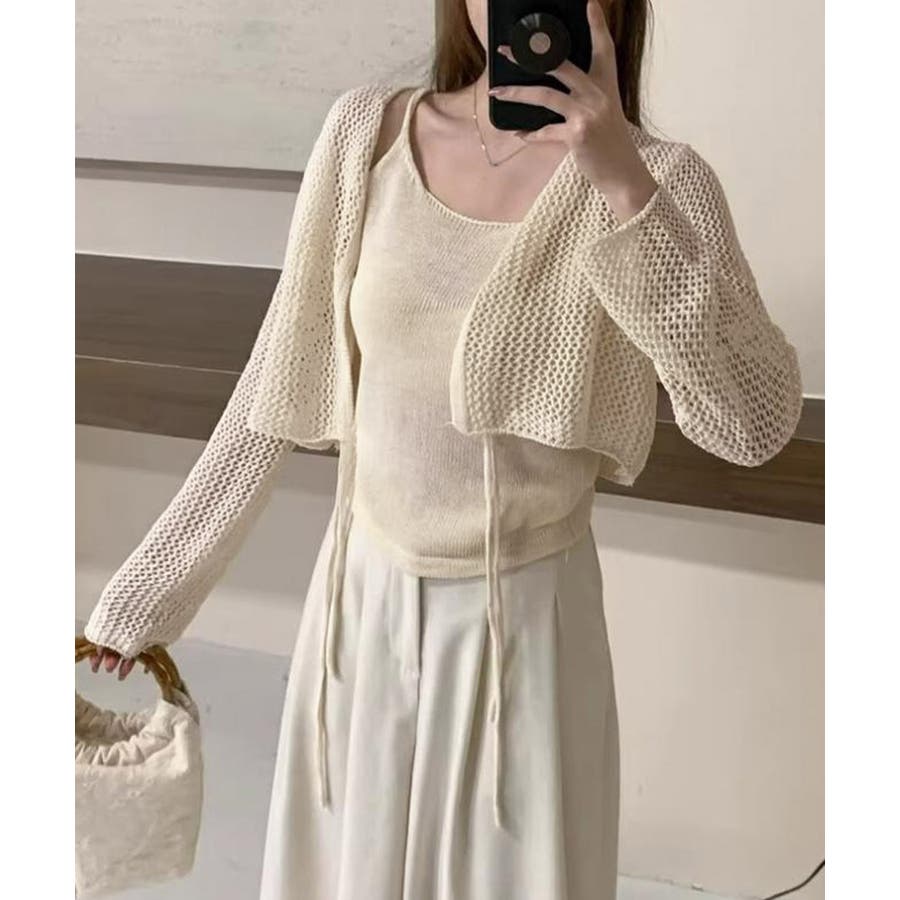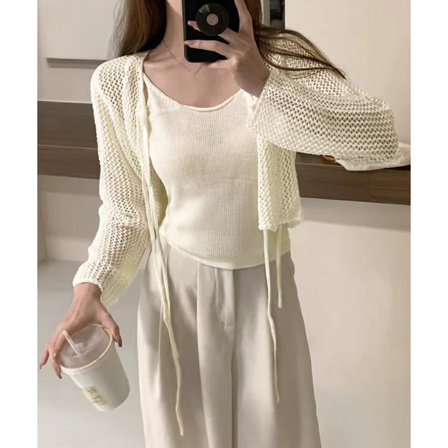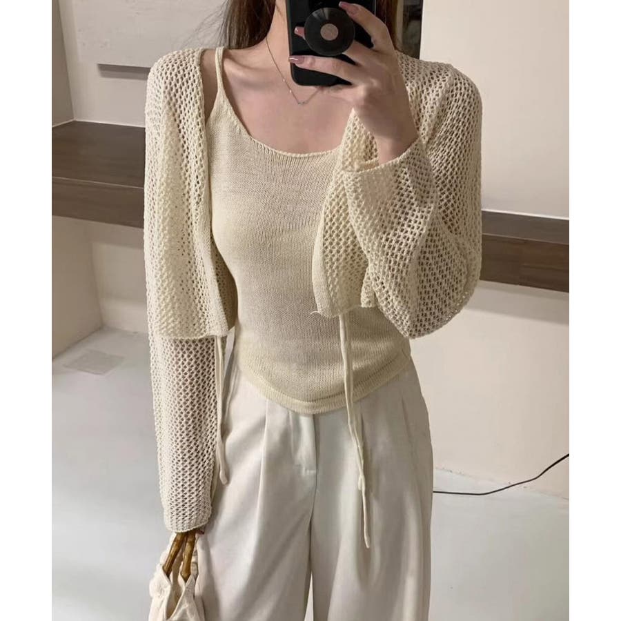 Uネックニットキャミ 透かし編みカーディガン 薄手ニットアンサンブル