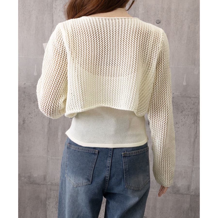メッシュニット春服 2枚重ね着トップス ショート丈羽織り黒