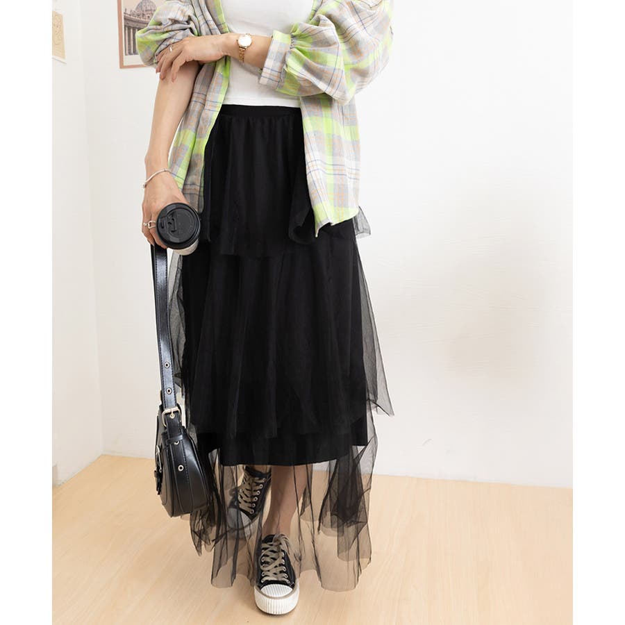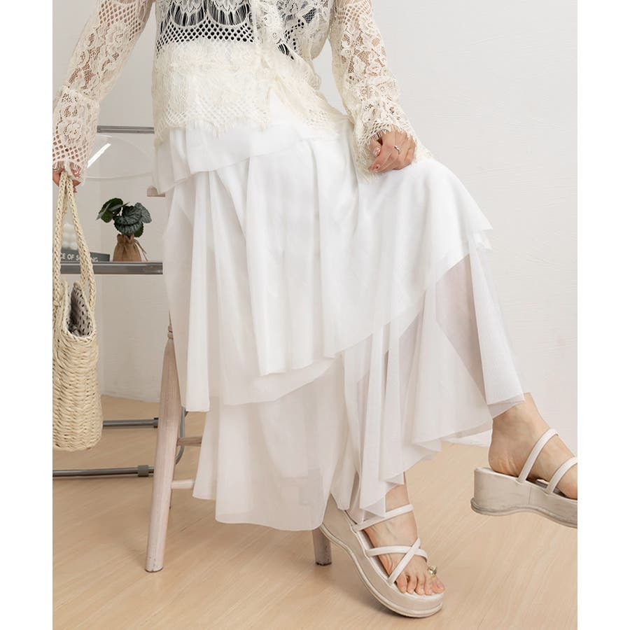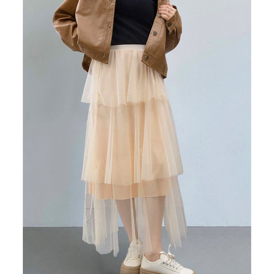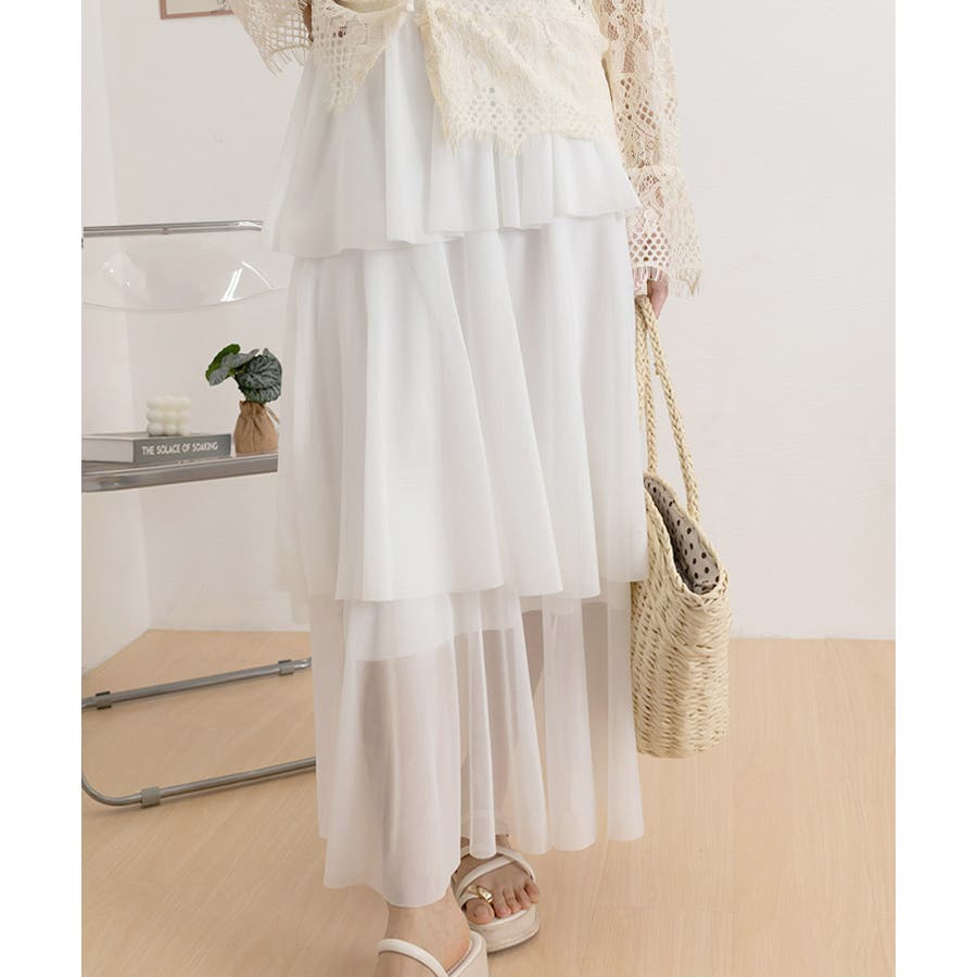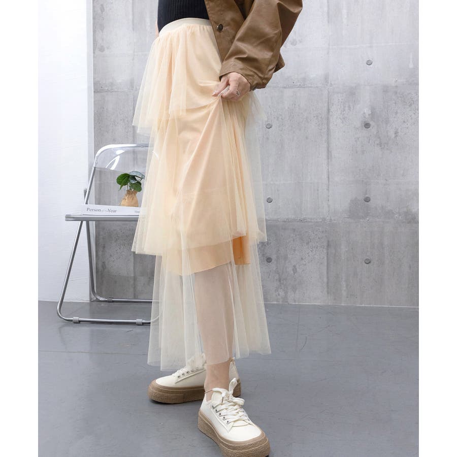 軽やかなチュール素材がエアリーなシルエットを演出するティアードスカート