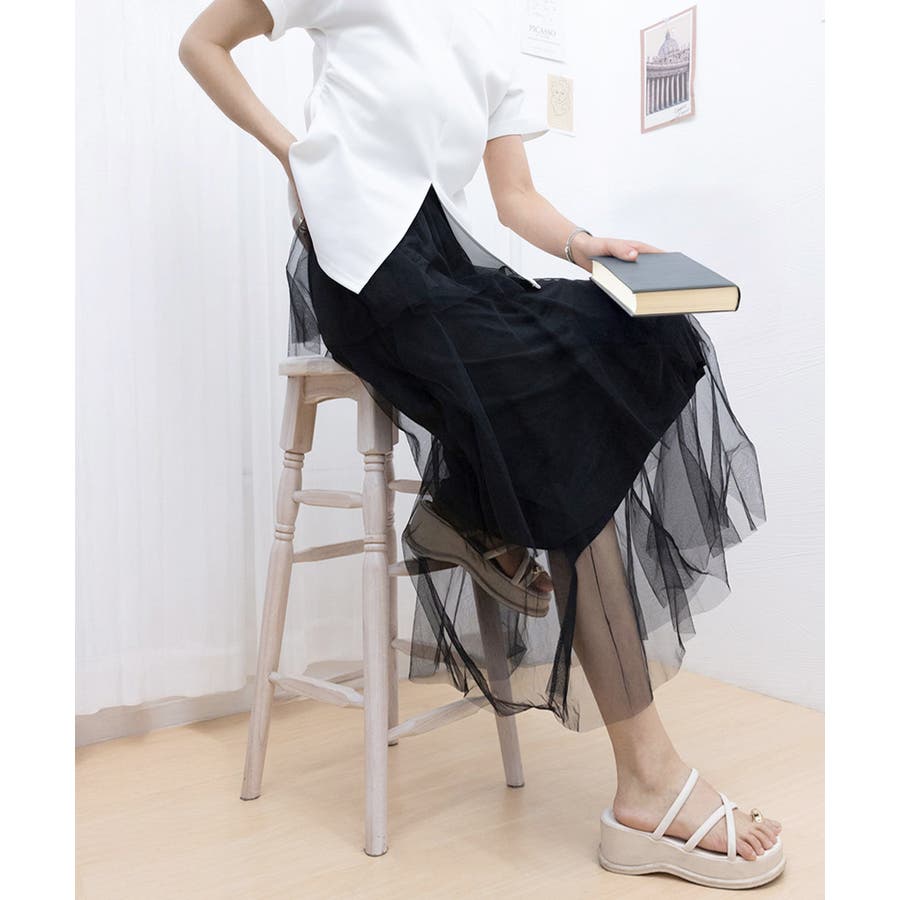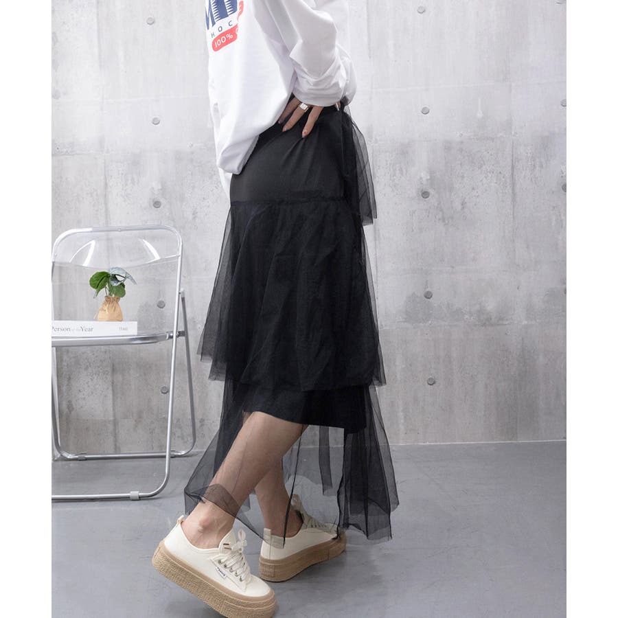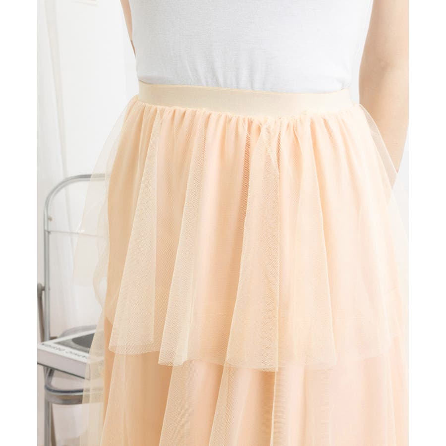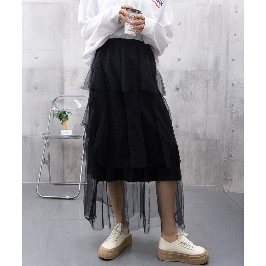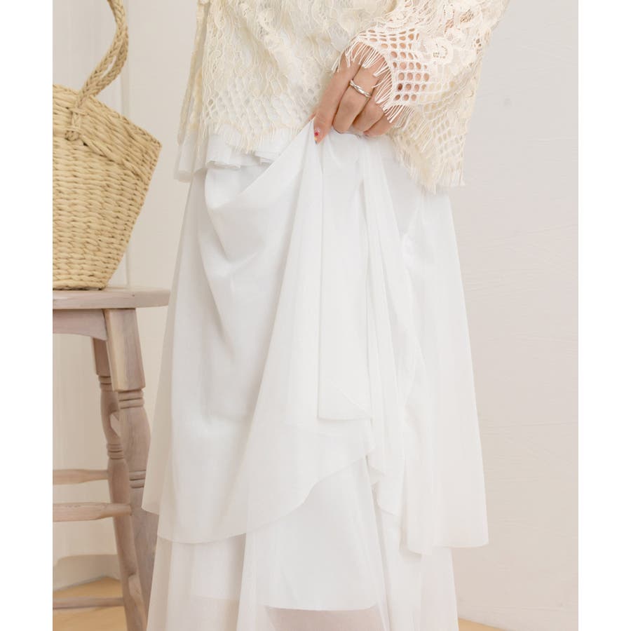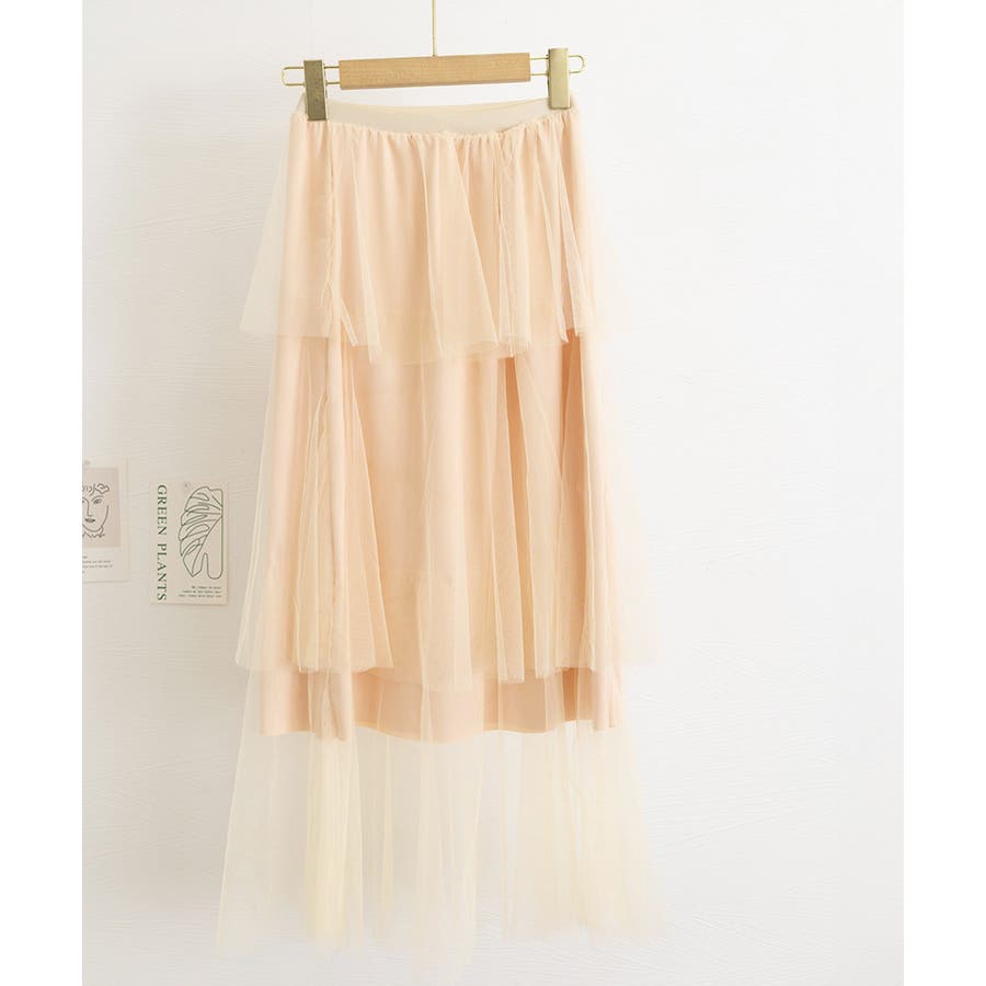 軽やかなチュール素材がエアリーなシルエットを演出するティアードスカート
