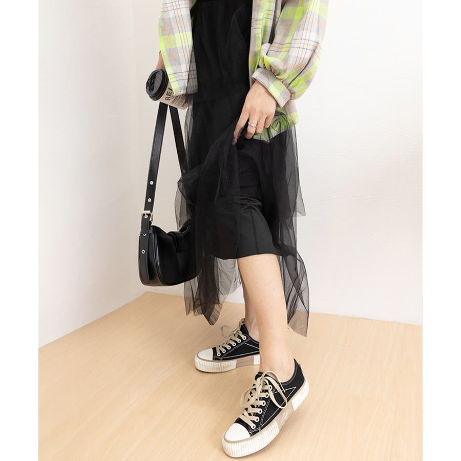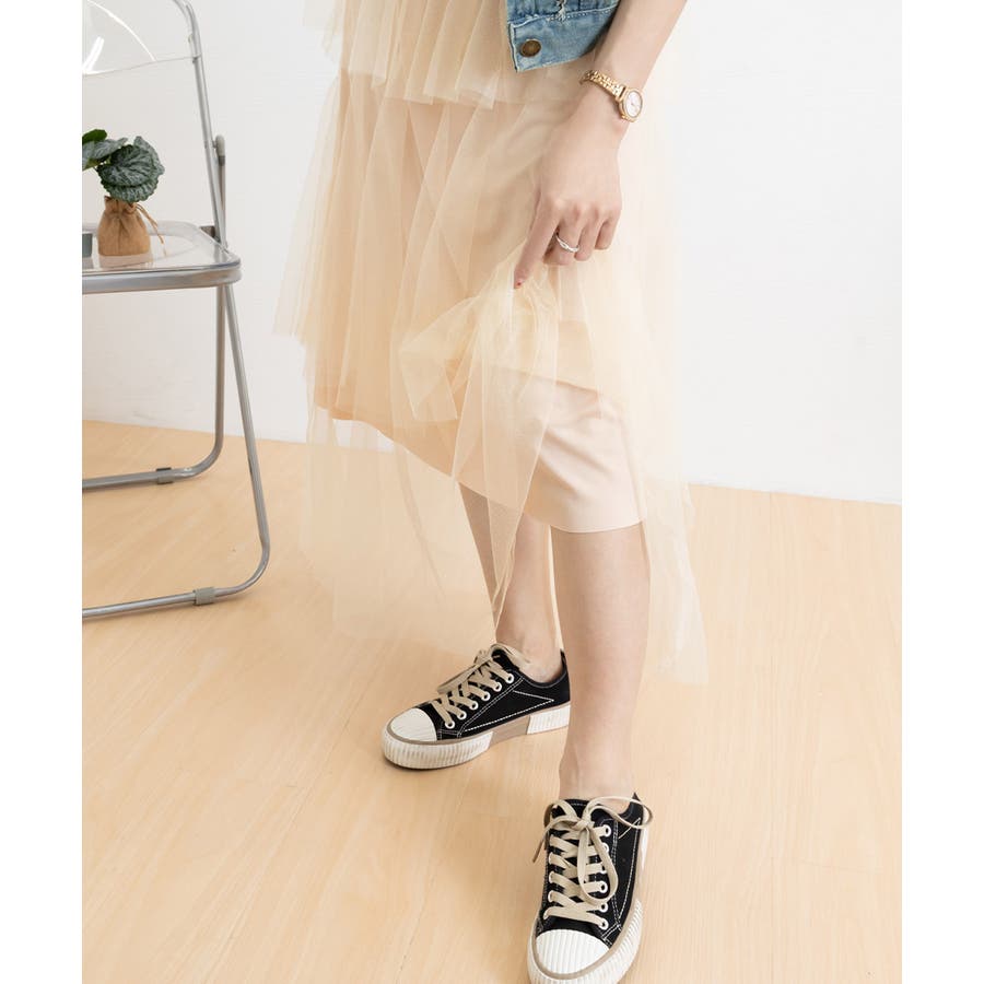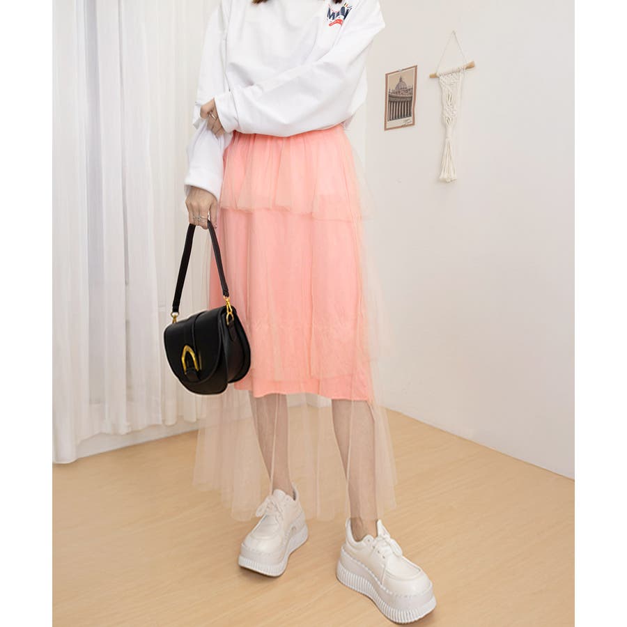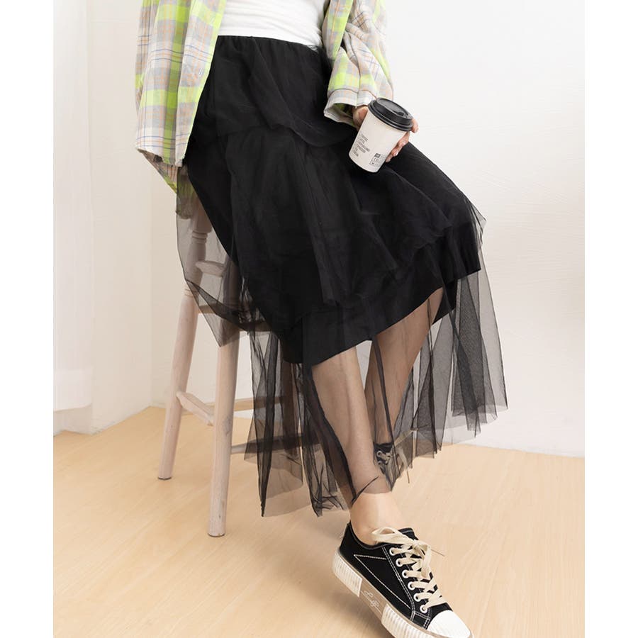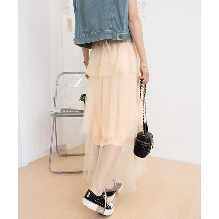 軽やかなチュール素材がエアリーなシルエットを演出するティアードスカート
