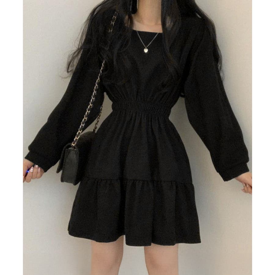 スクエアネック長袖 韓国風ワンピース黒 ガーリーワンピース