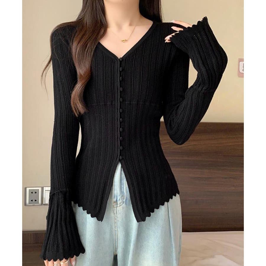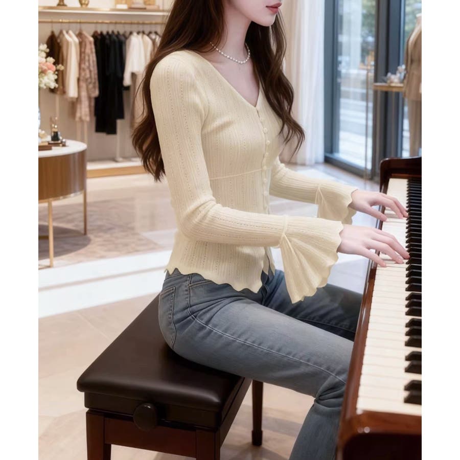 韓国風前開きニットトップスレディース 薄手ニットカーディガンVネック フロントボ…