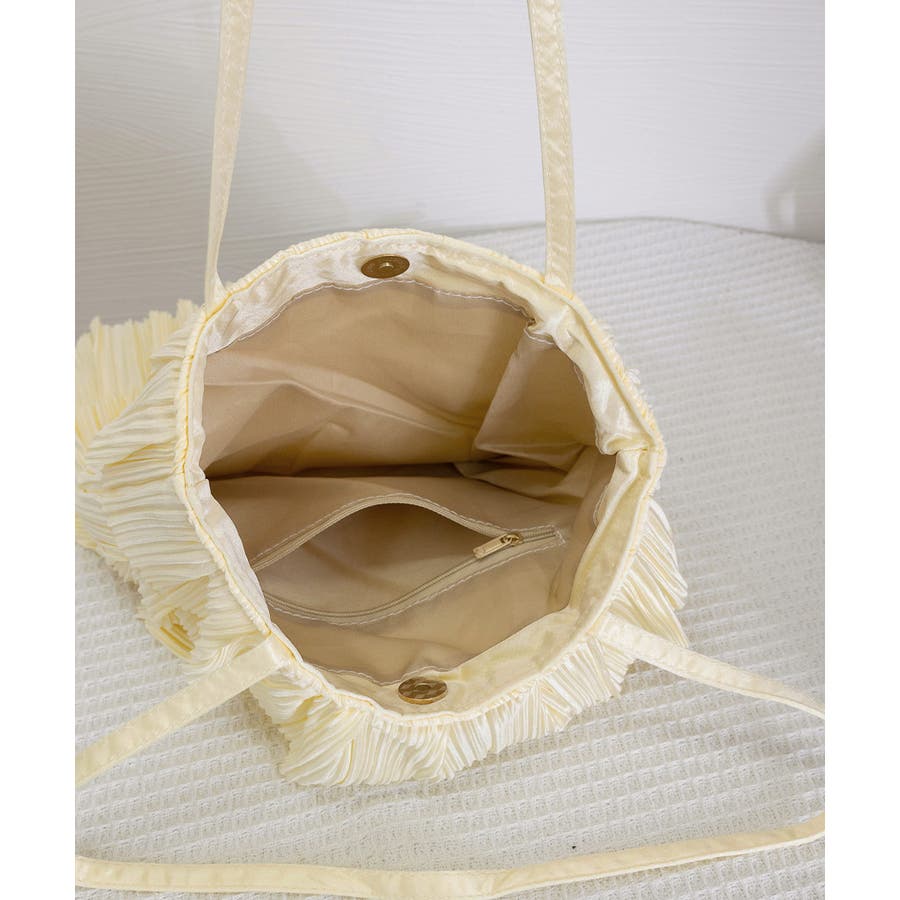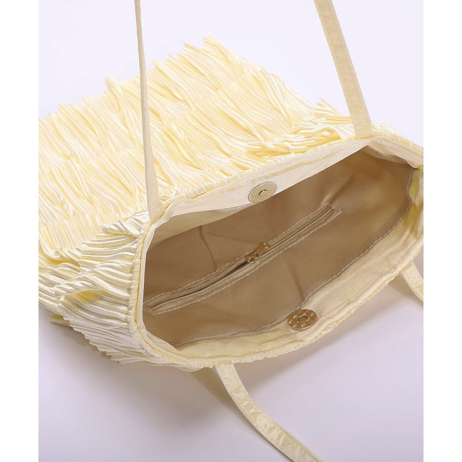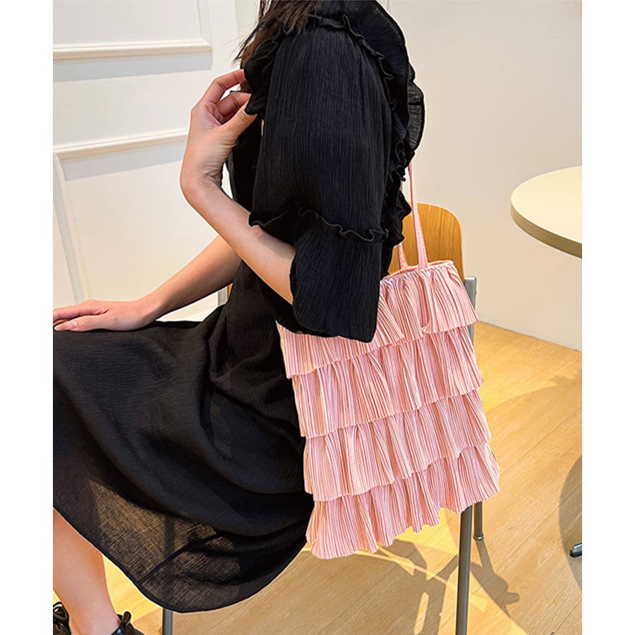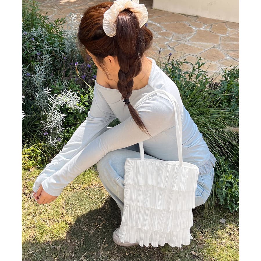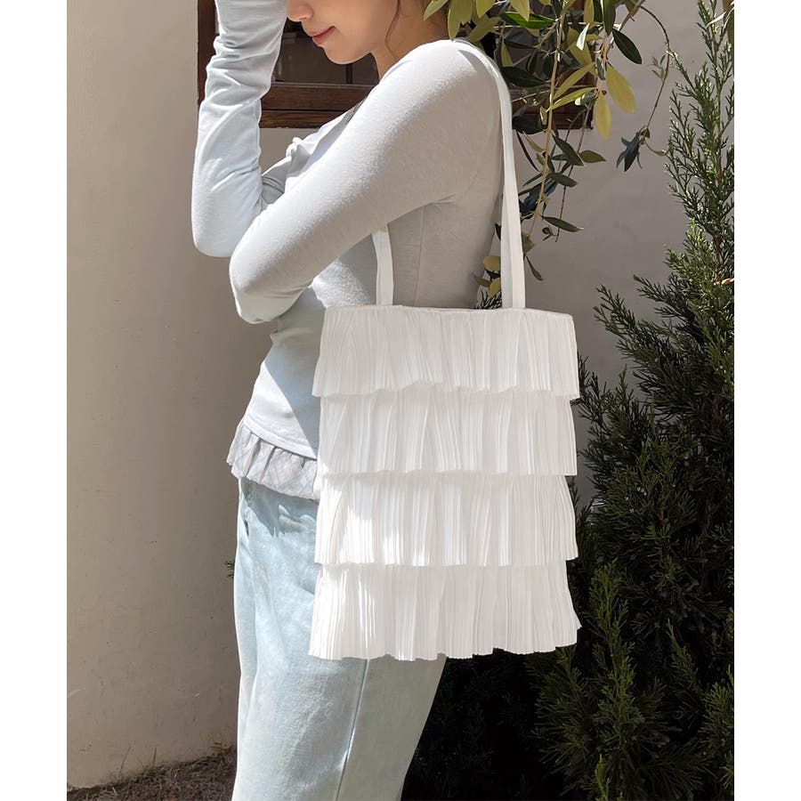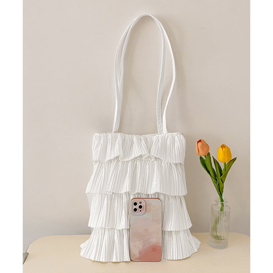 華やかなフリルが目を引くプリーツデザイントートバッグ。