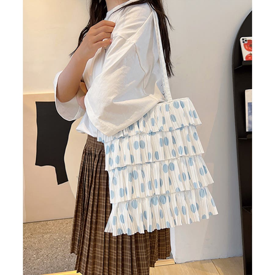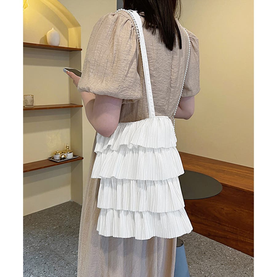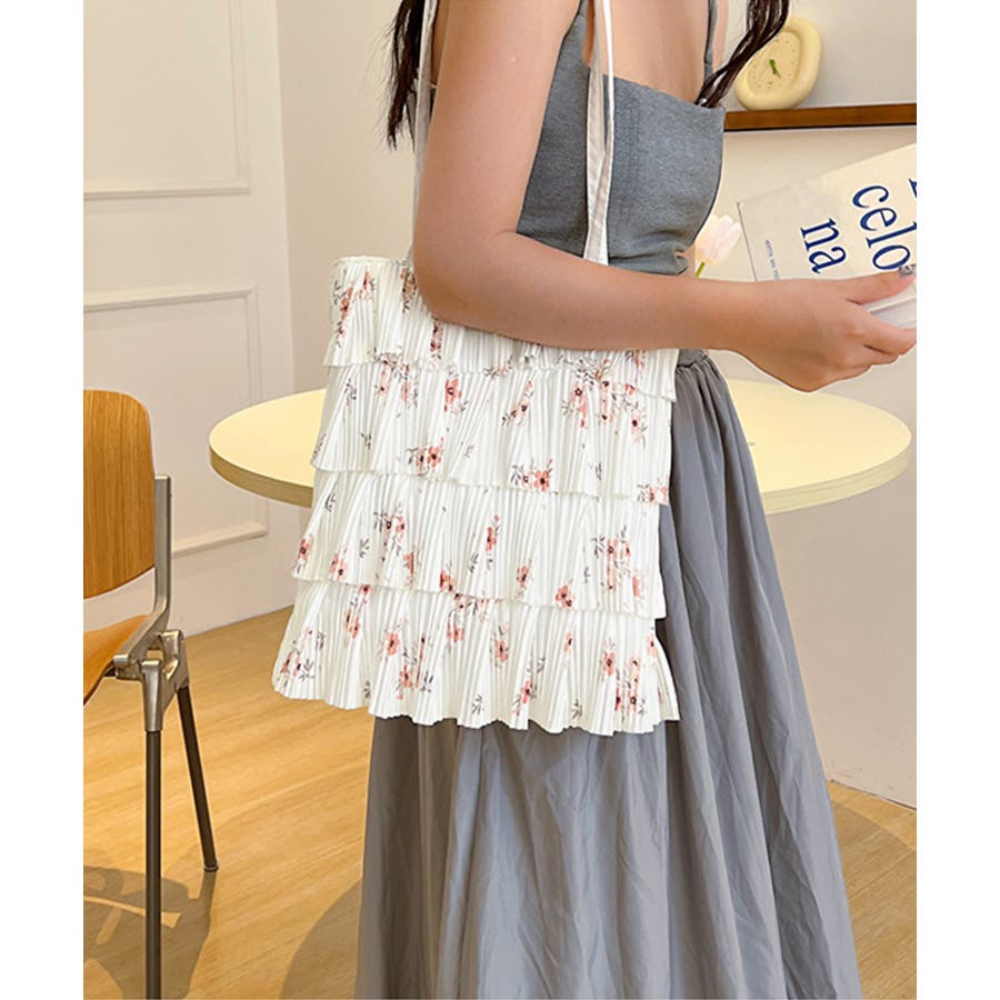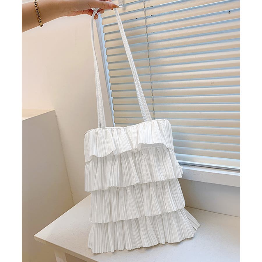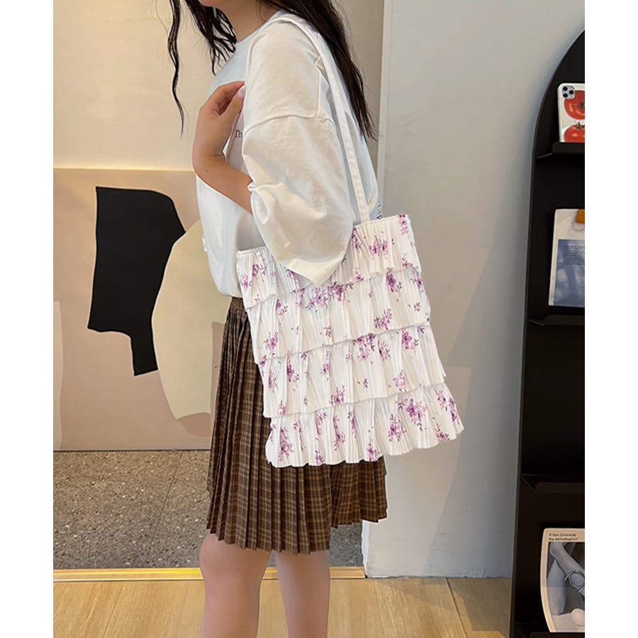 華やかなフリルが目を引くプリーツデザイントートバッグ。