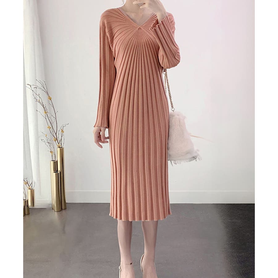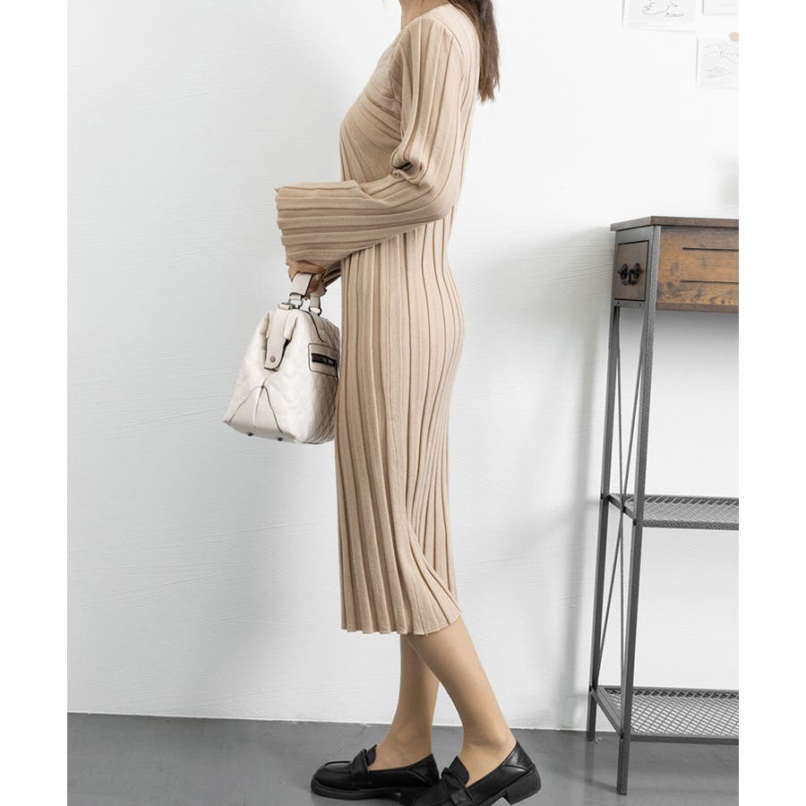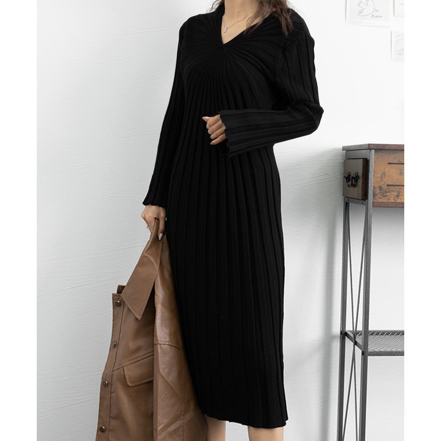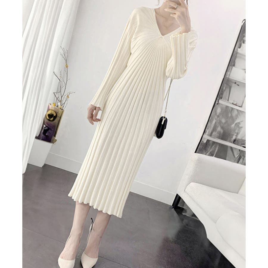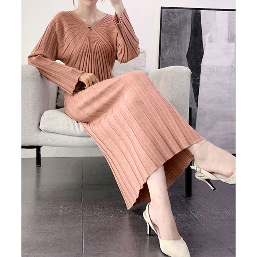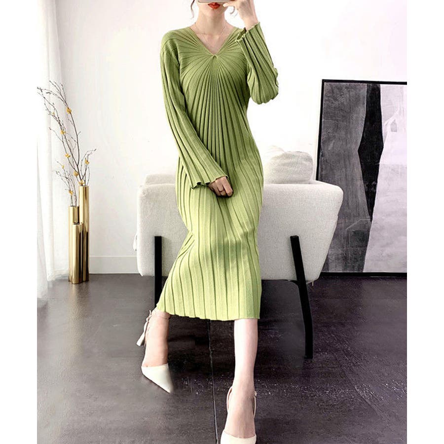 Vネック ワンピース レディース ニットワンピース 秋冬 長袖リブニット ミモレワンピ 膝丈下 フェミニン きれいめ