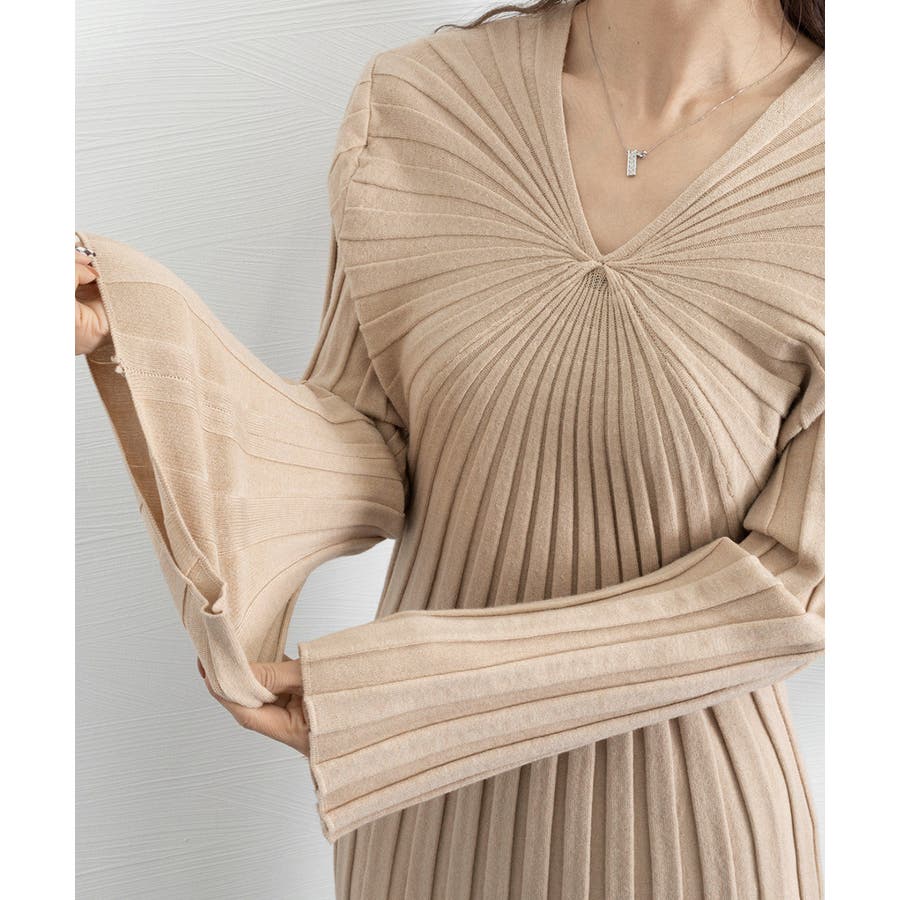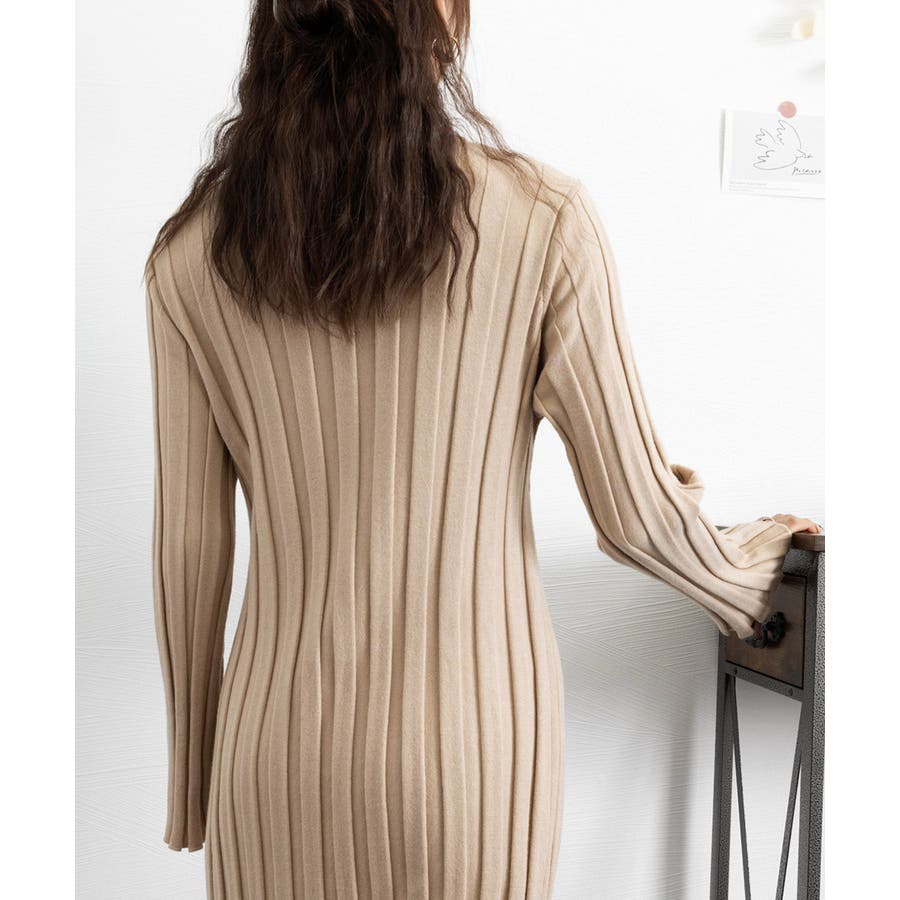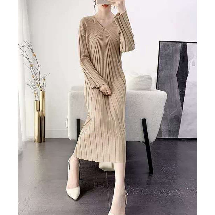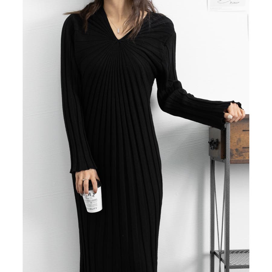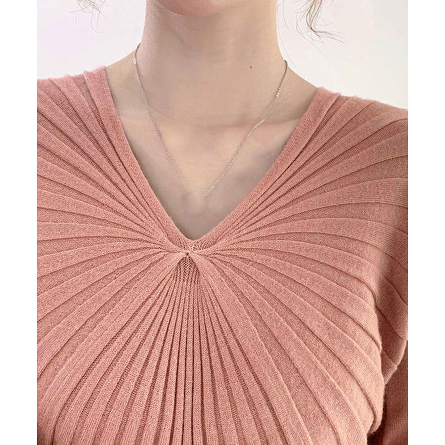 Vネック ワンピース レディース ニットワンピース 秋冬 長袖リブニット ミモレワンピ 膝丈下 フェミニン きれいめ