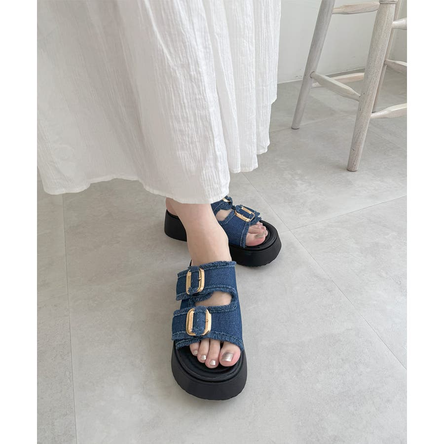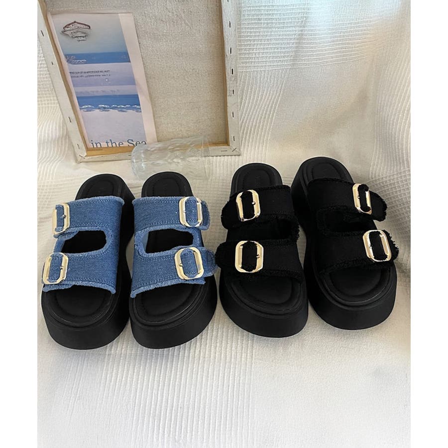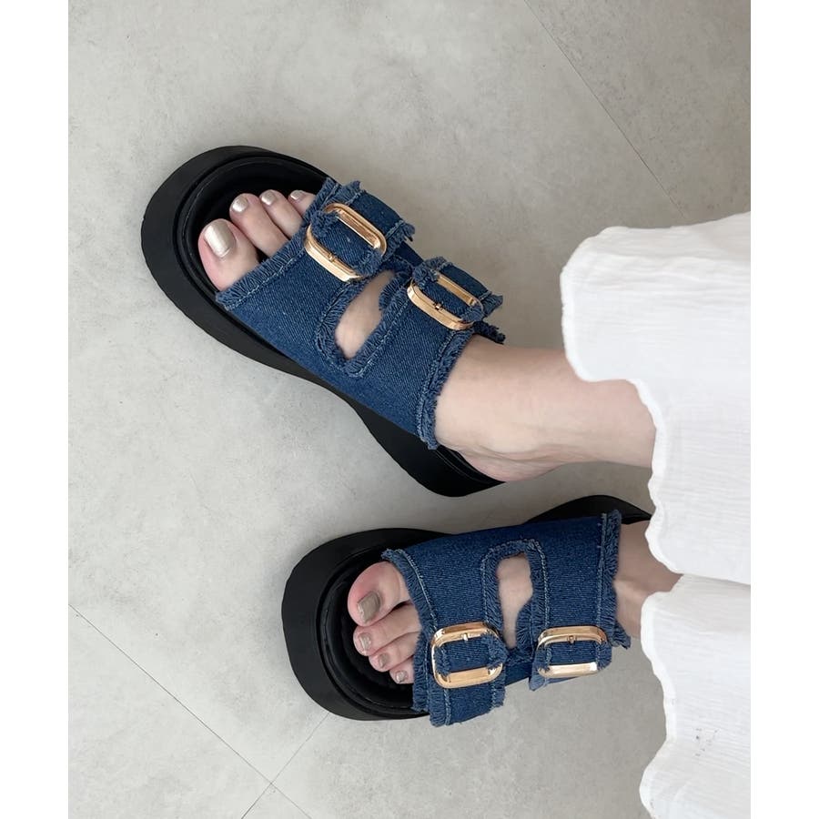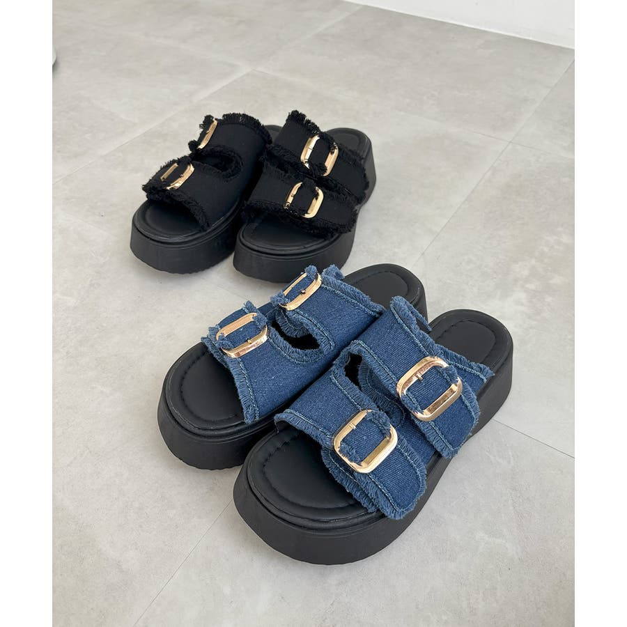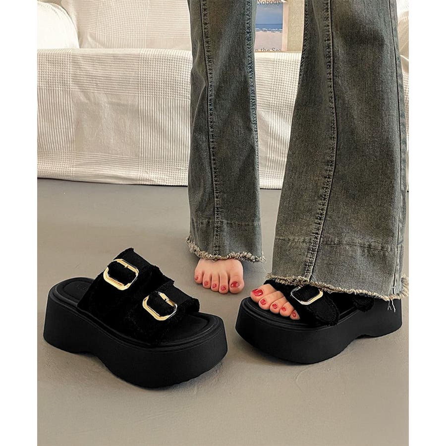 トレンド感溢れるダブルバックルデザインのプラットフォームサンダル。