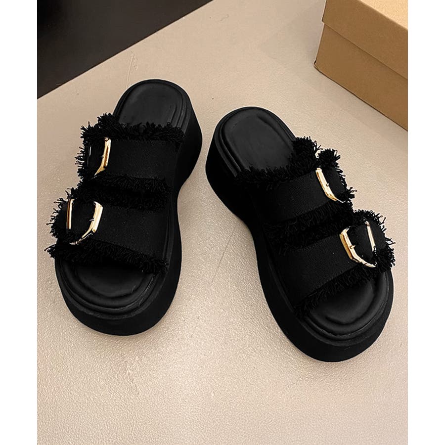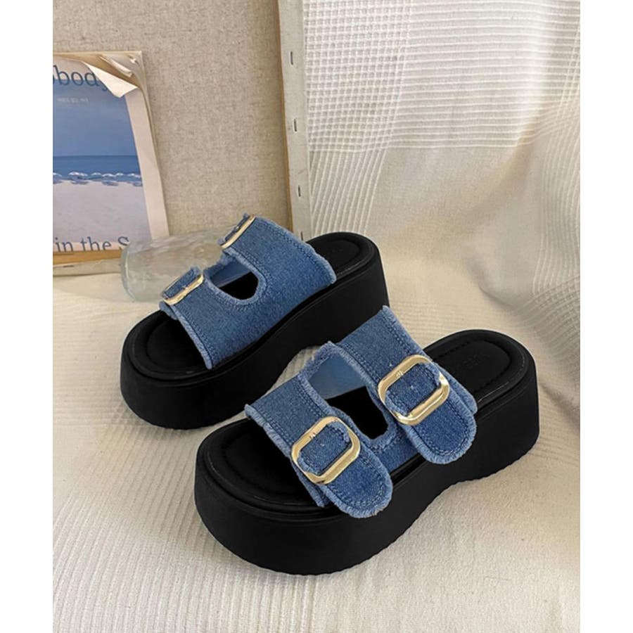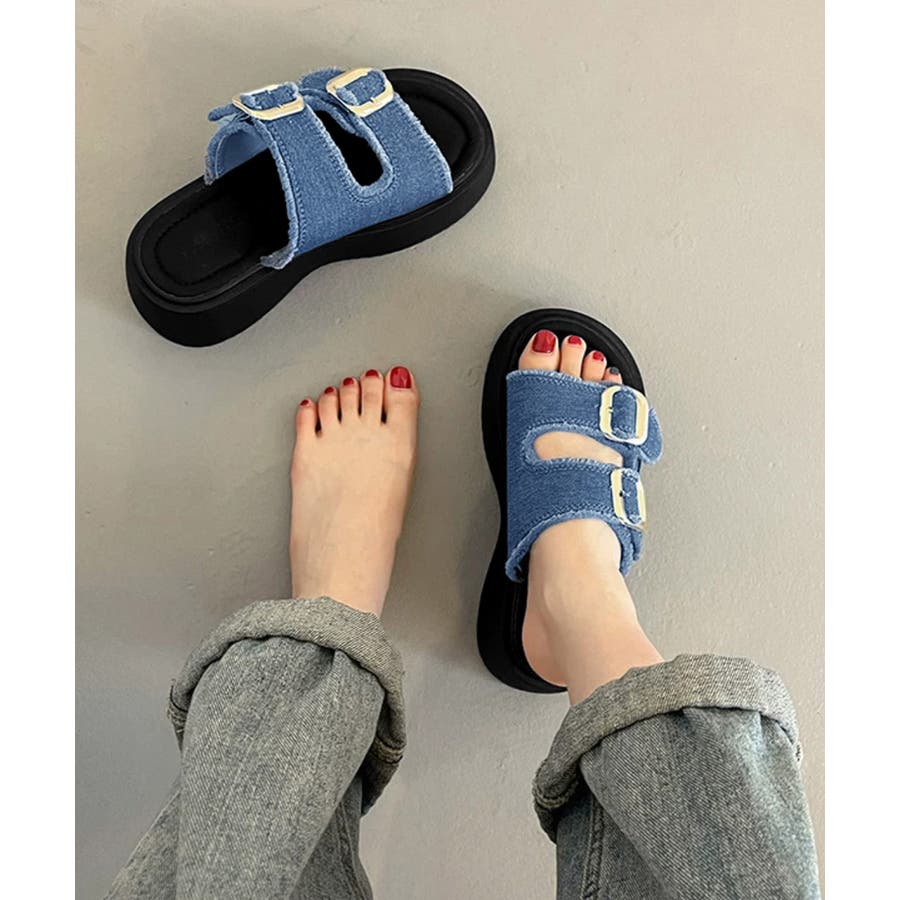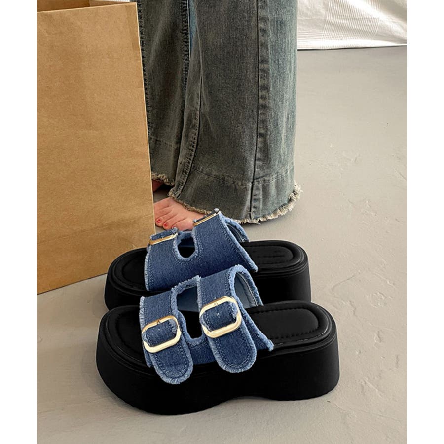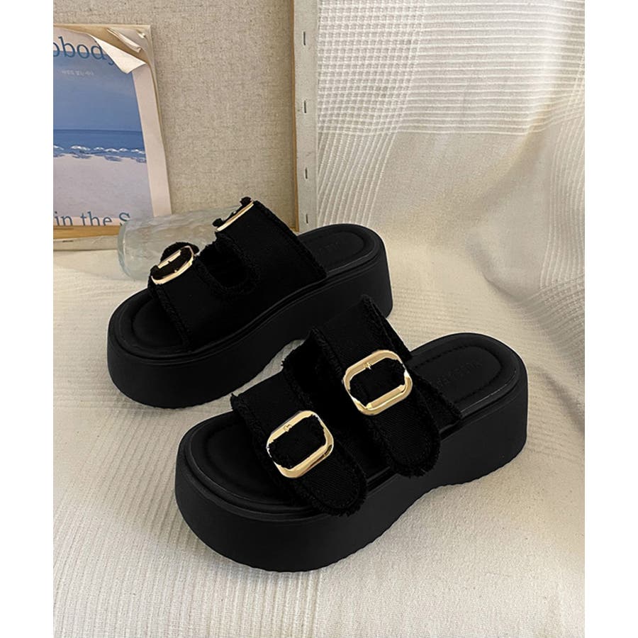 トレンド感溢れるダブルバックルデザインのプラットフォームサンダル。
