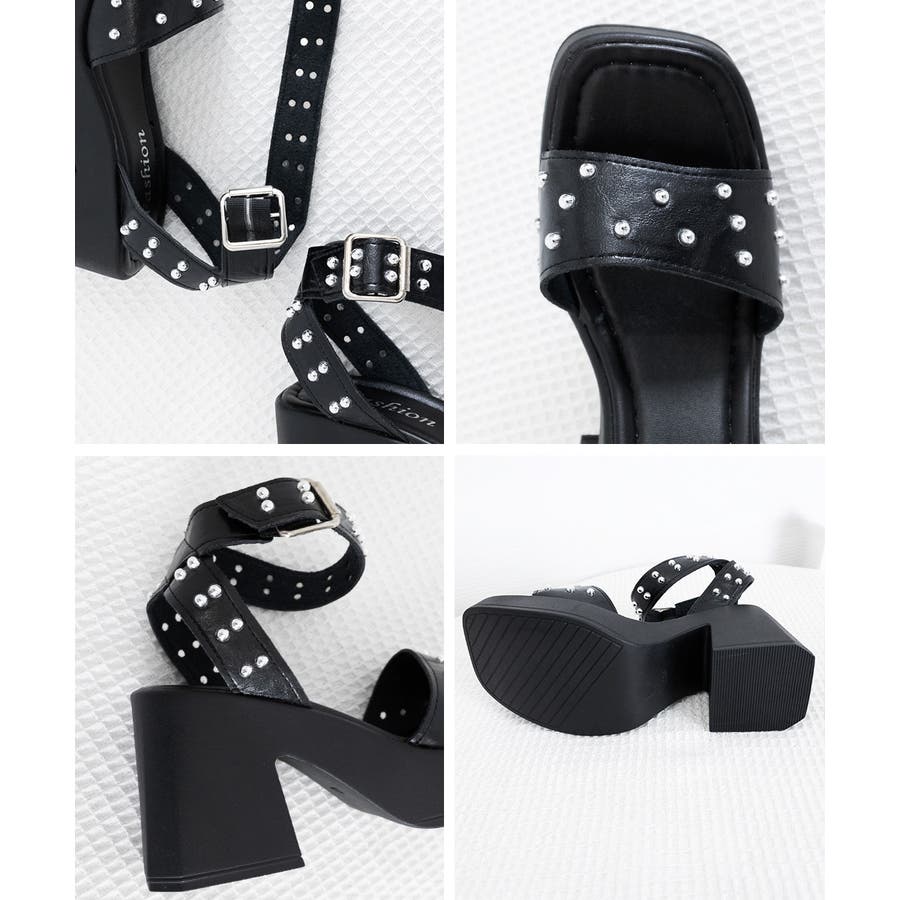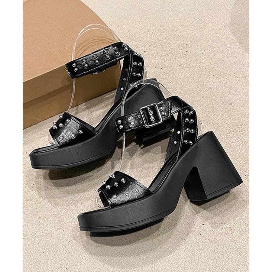 スタッズをあしらった厚底チャンキーヒールサンダル。