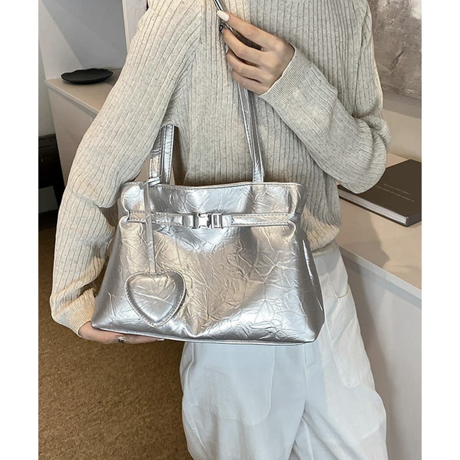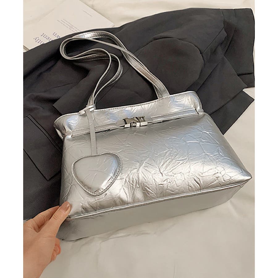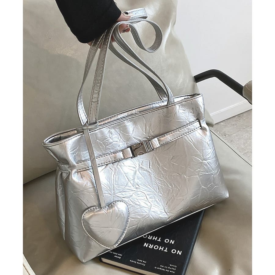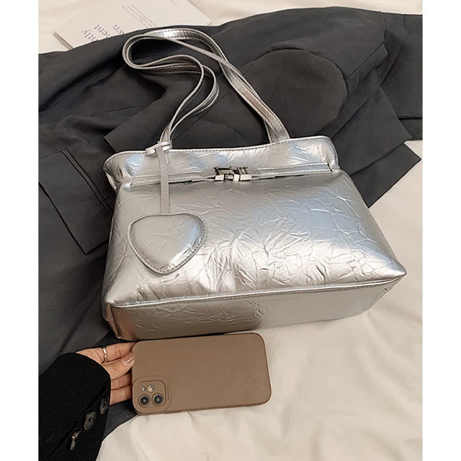 ハート型のチャームが魅力的な、洗練された輝きを放つメタリックトートバッグ