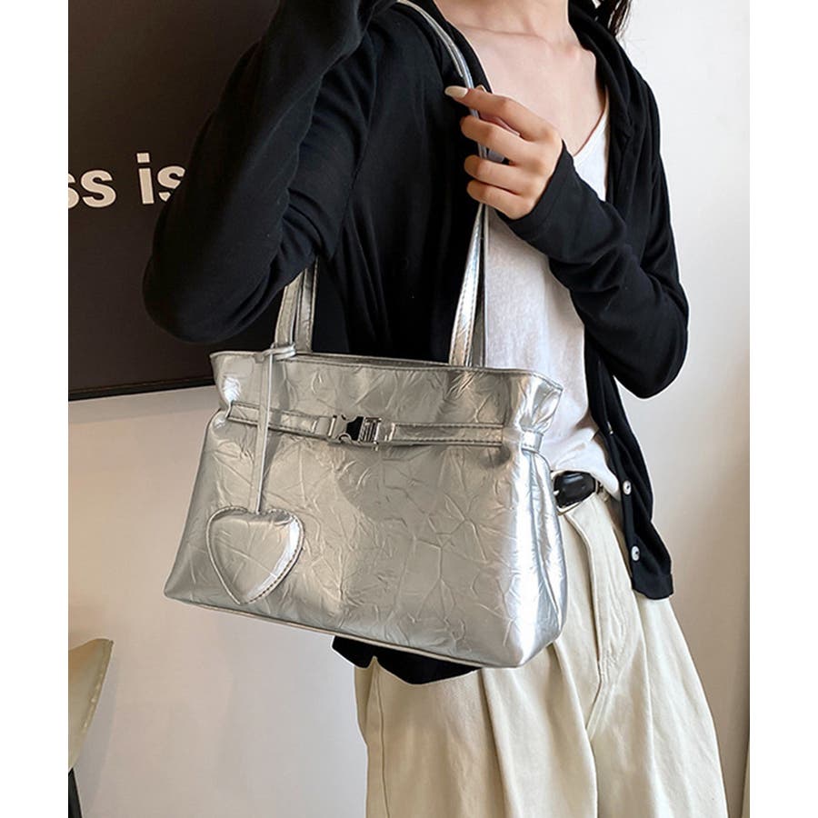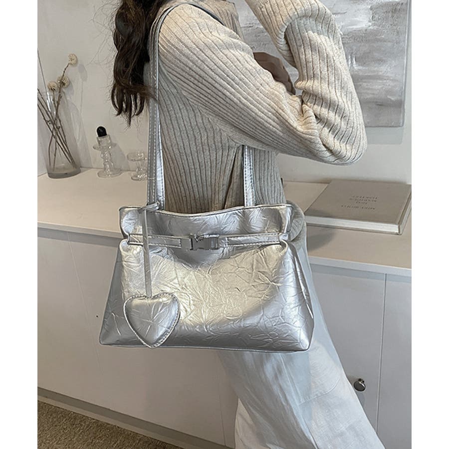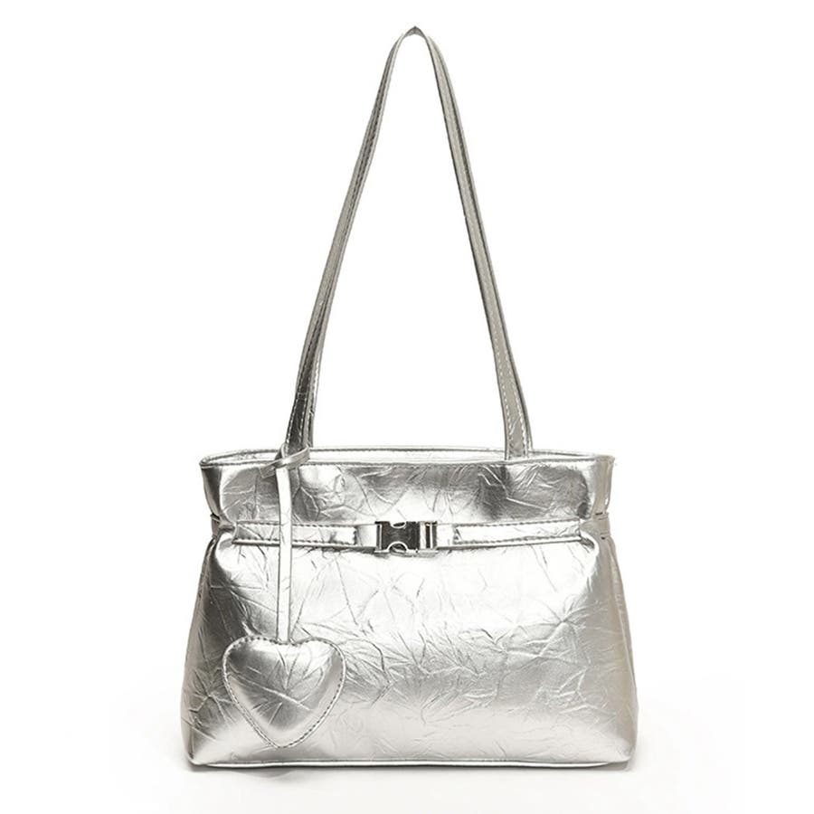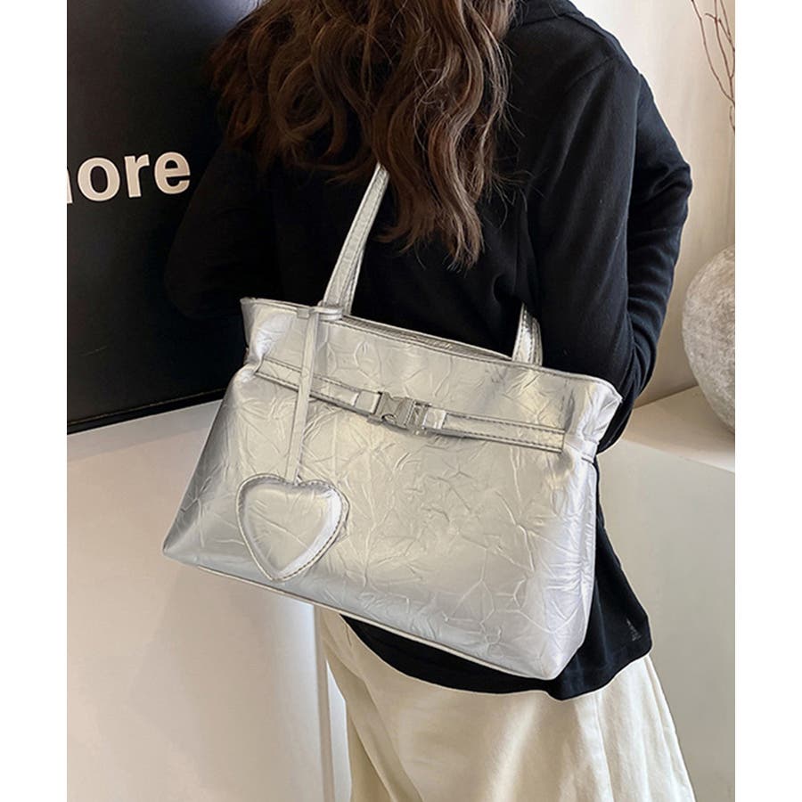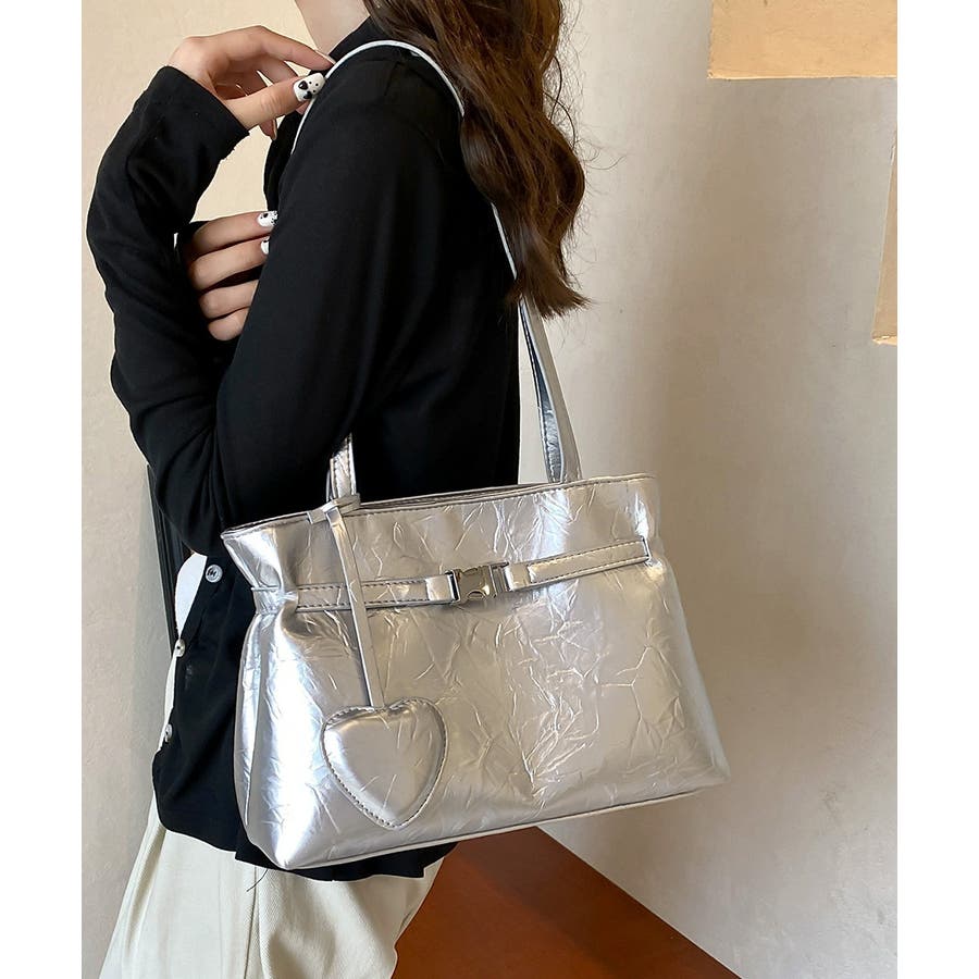 ハート型のチャームが魅力的な、洗練された輝きを放つメタリックトートバッグ