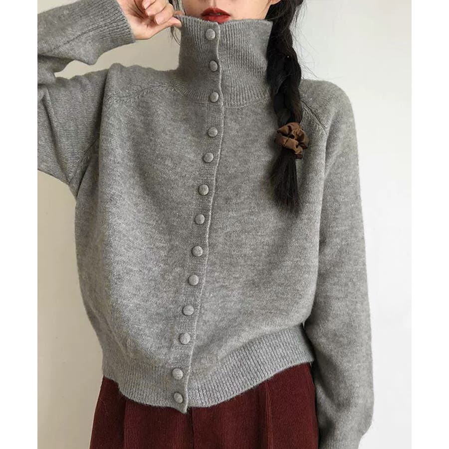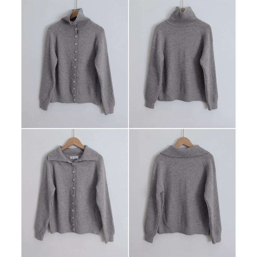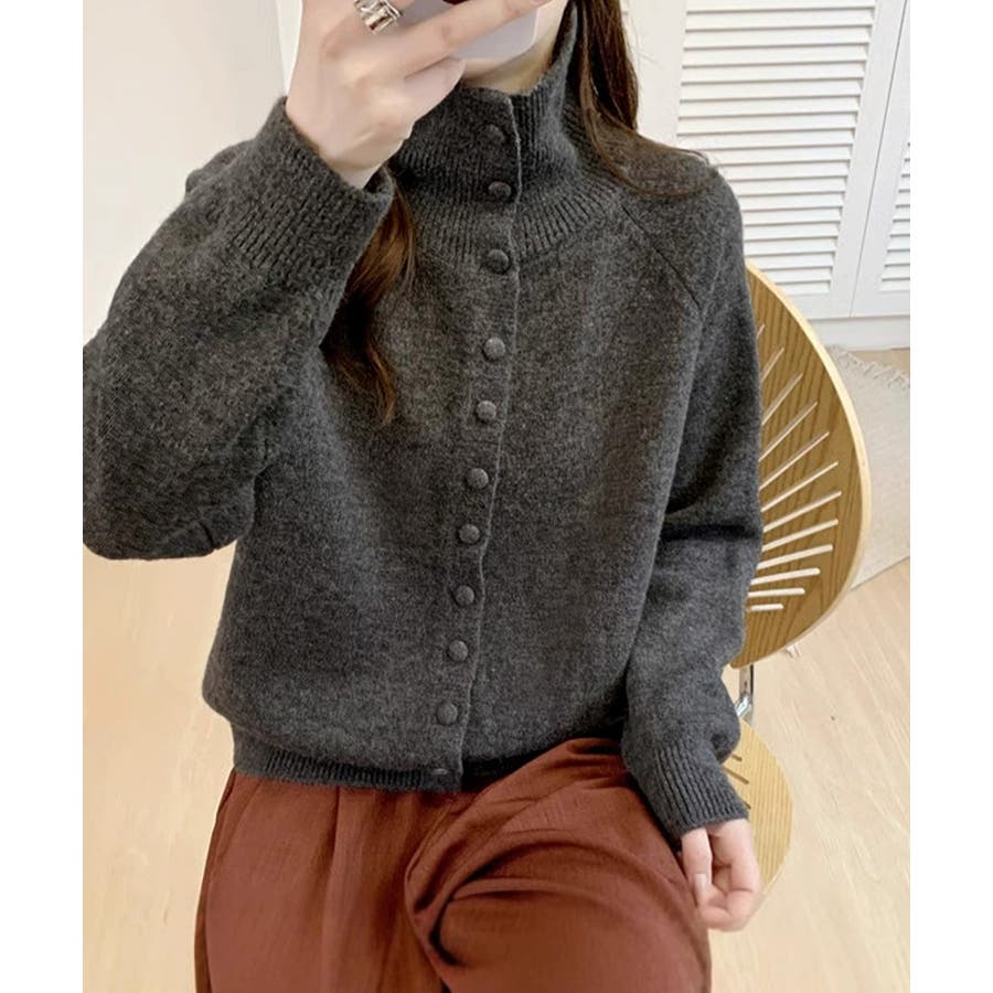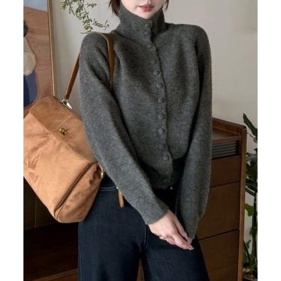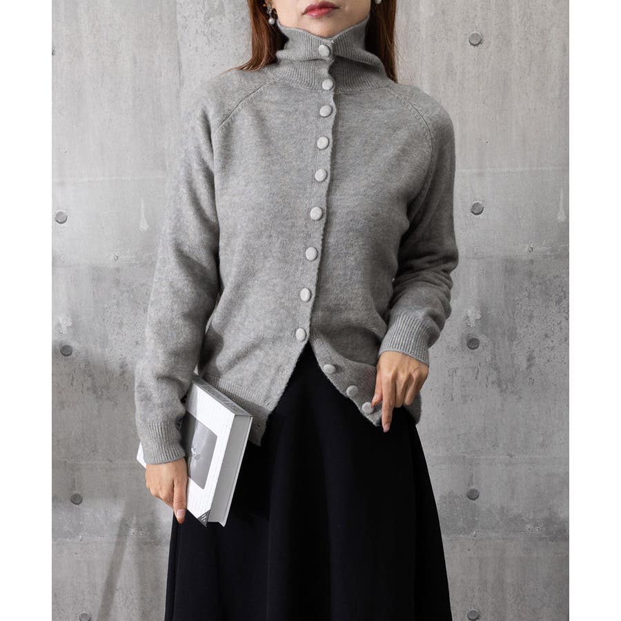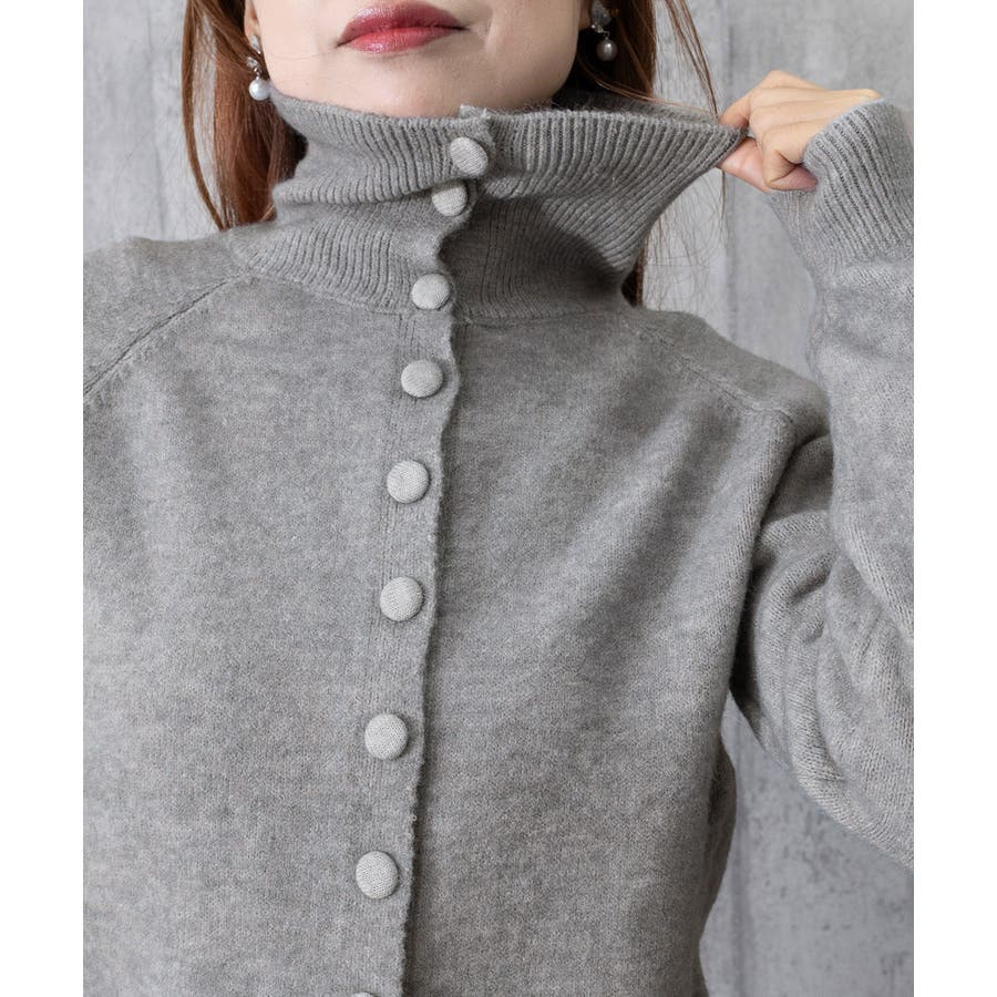 ボタンデザインが目を惹くハイネックの長袖ニットカーディガン。