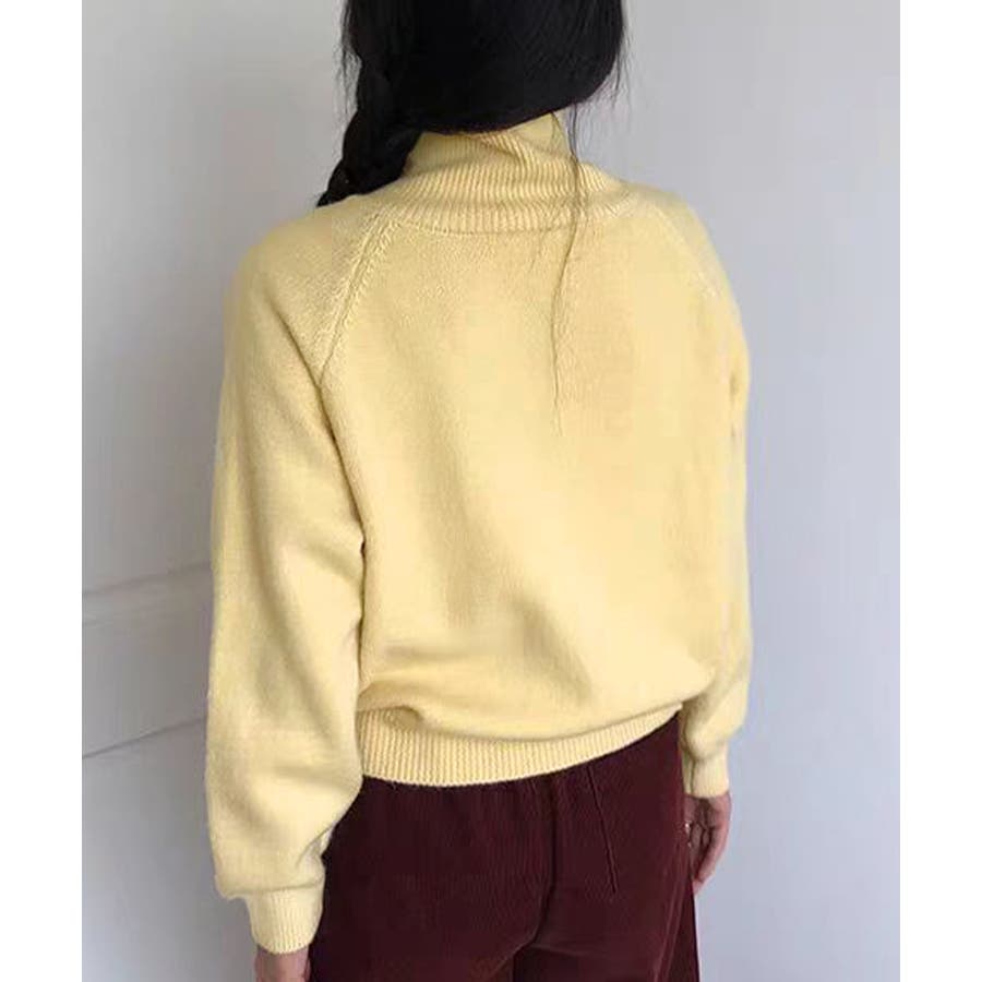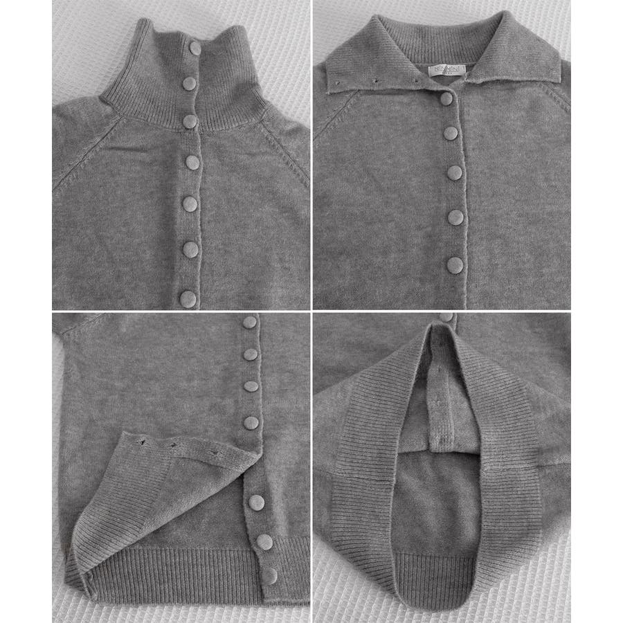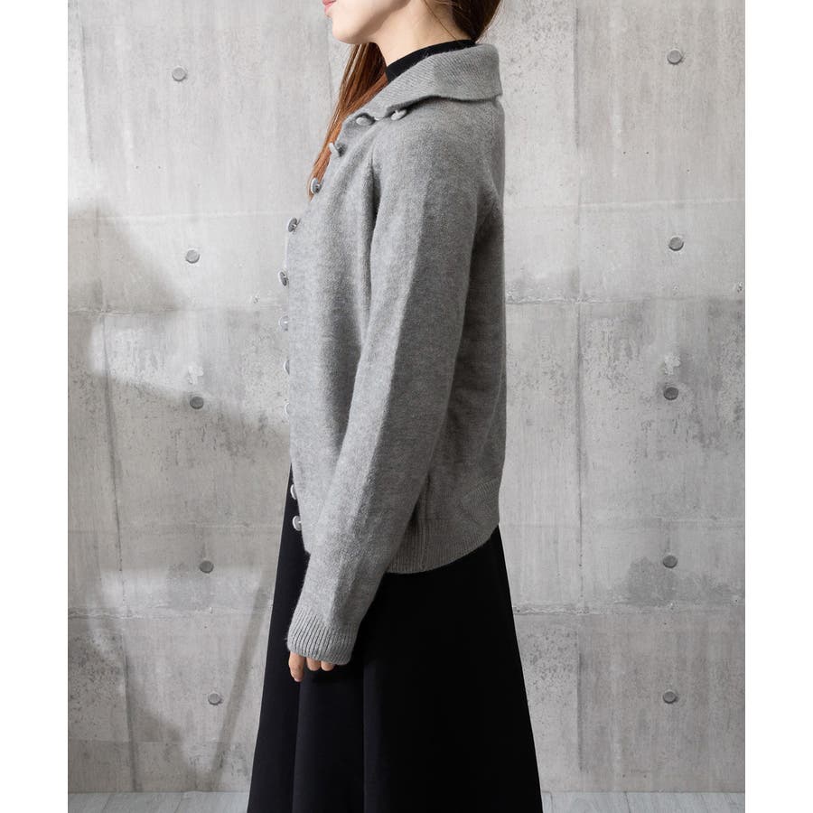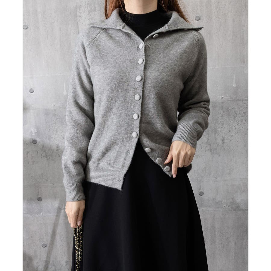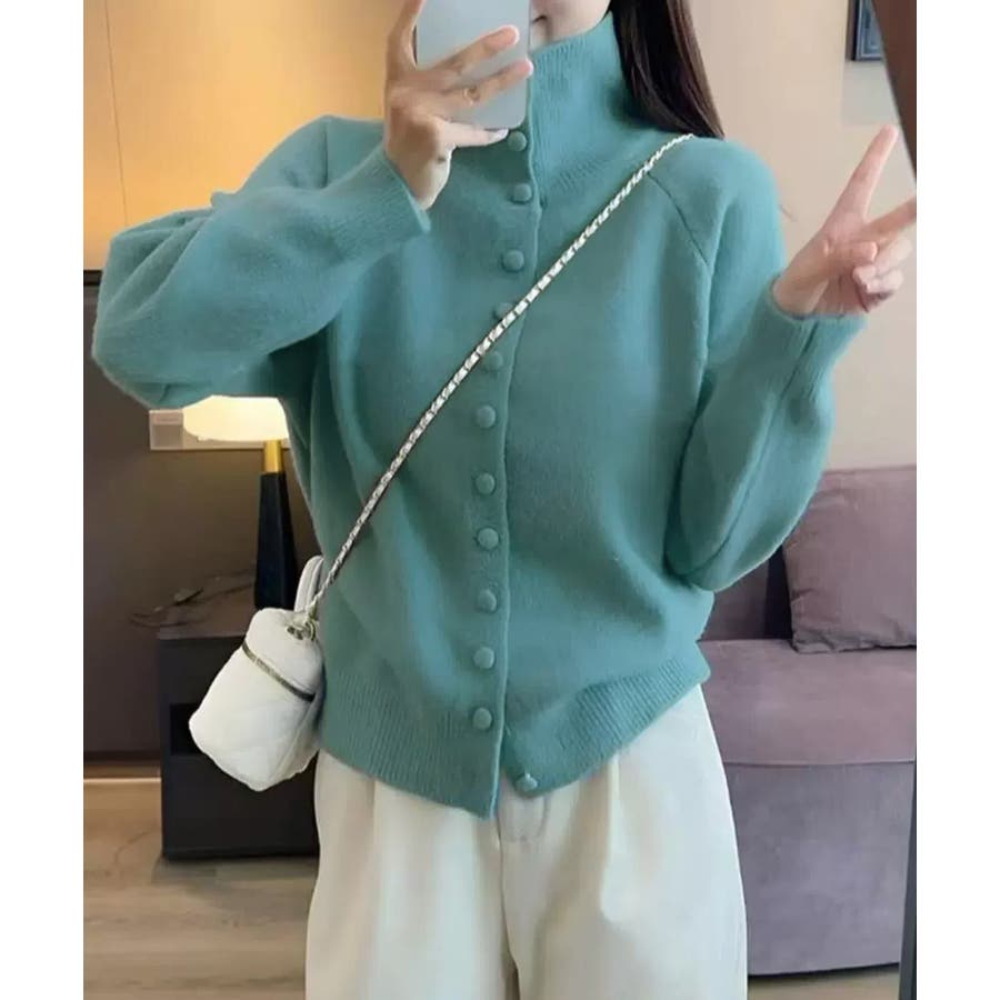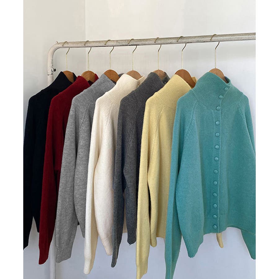 ボタンデザインが目を惹くハイネックの長袖ニットカーディガン。