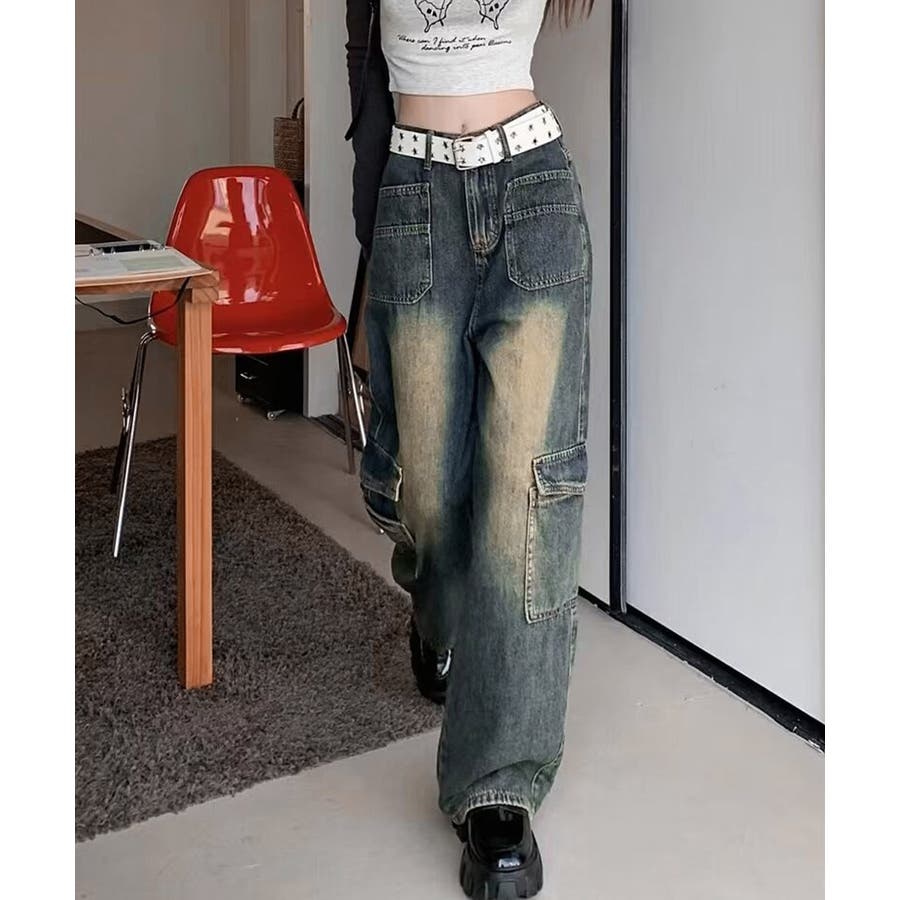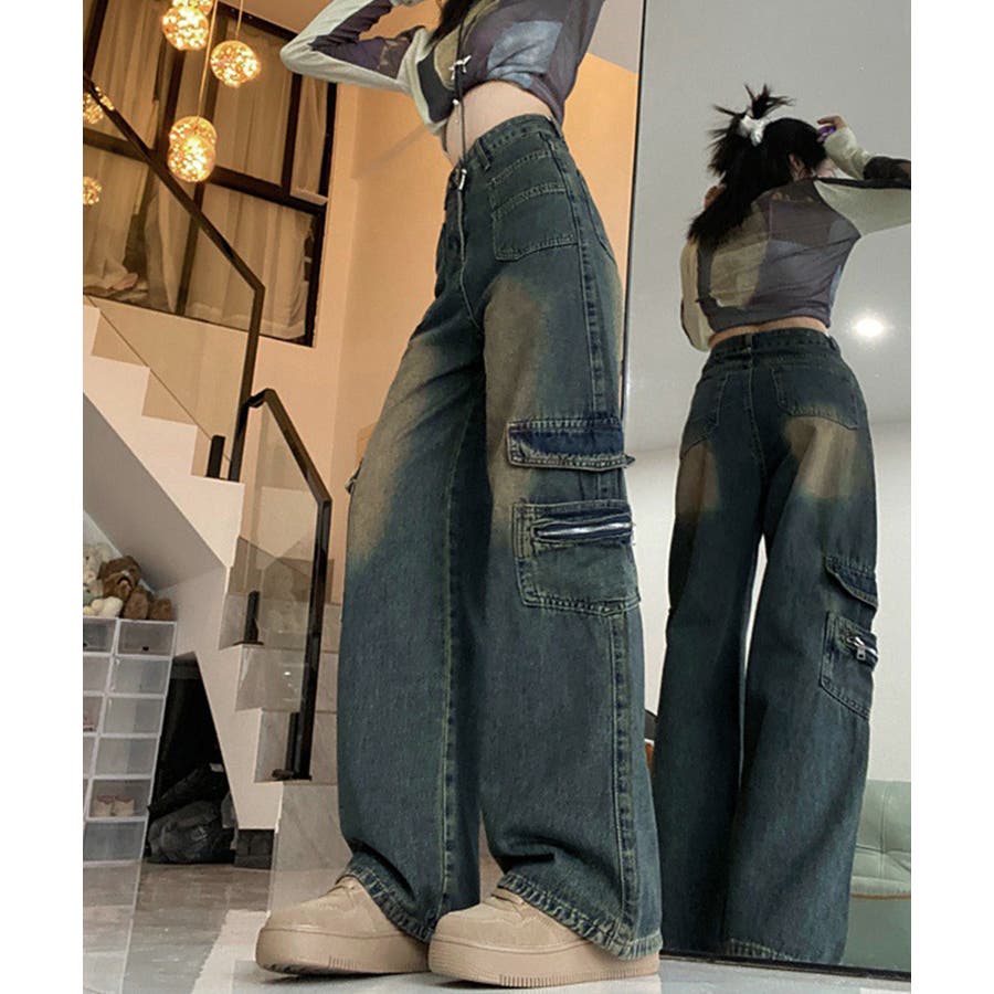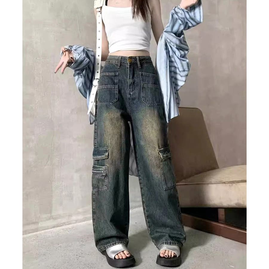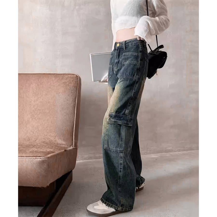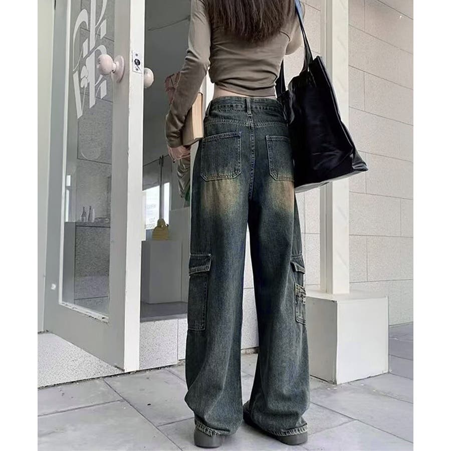 デニム素材とカーゴデザインを融合させた、ユニークなレディースストリート系ロングジーンズ