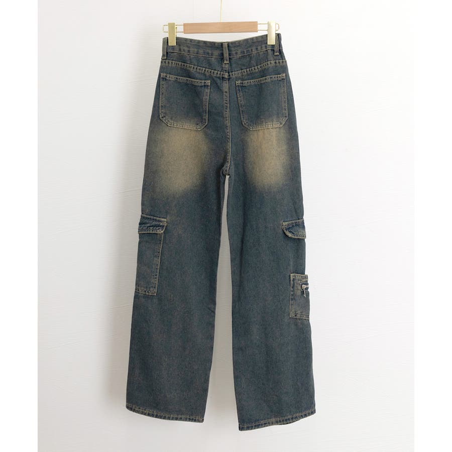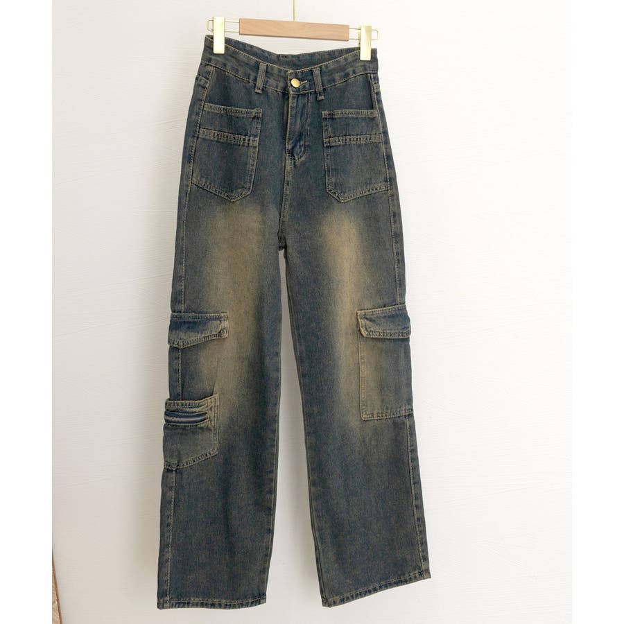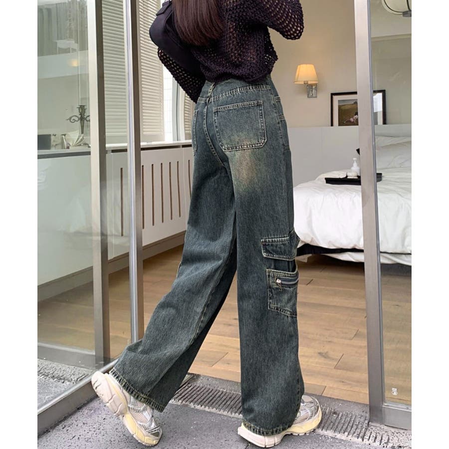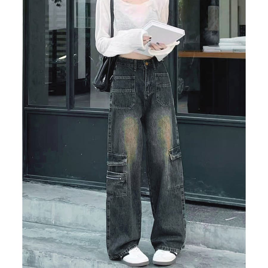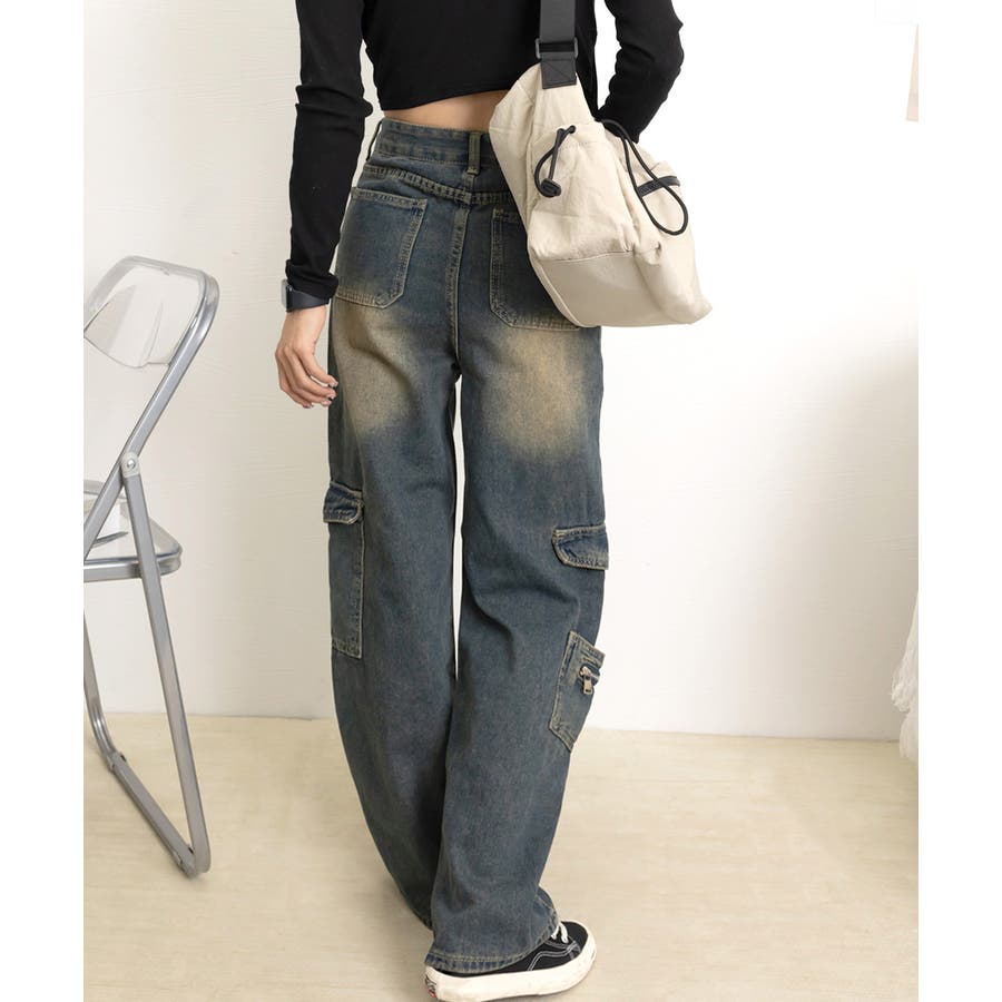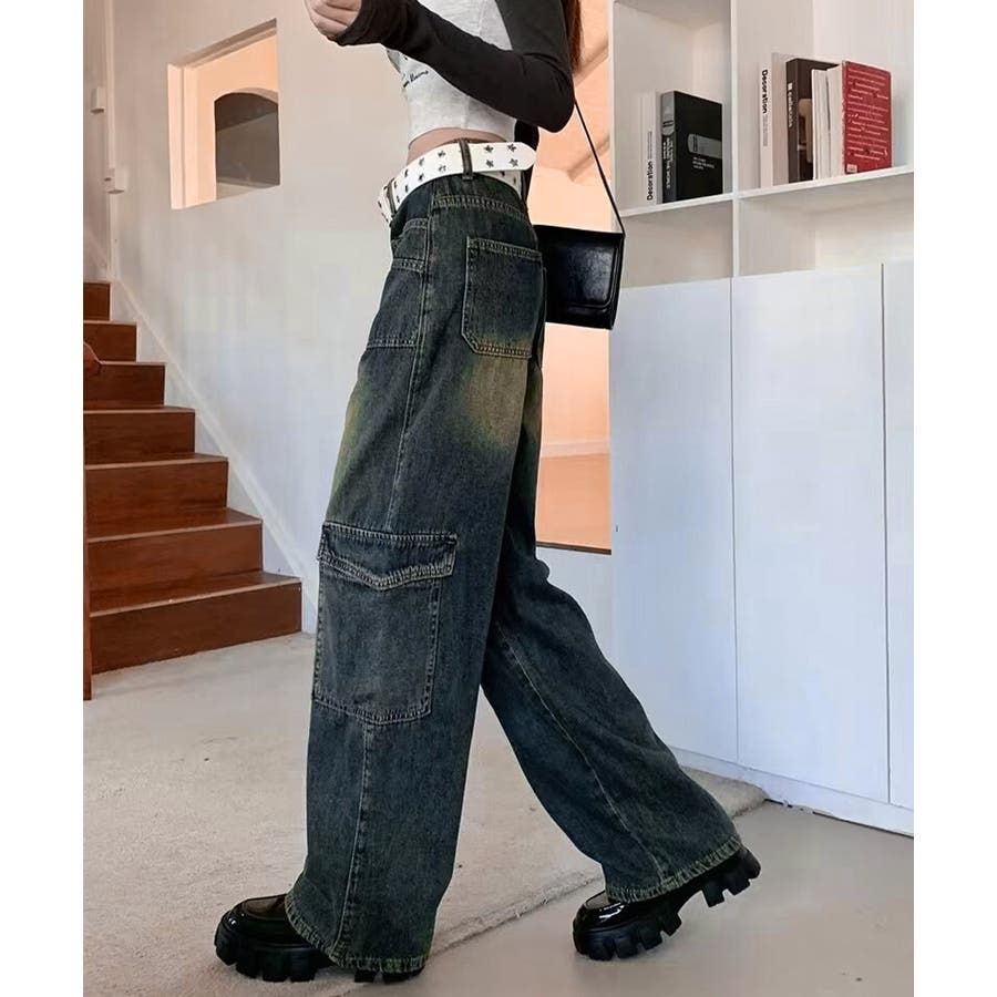 デニム素材とカーゴデザインを融合させた、ユニークなレディースストリート系ロングジーンズ