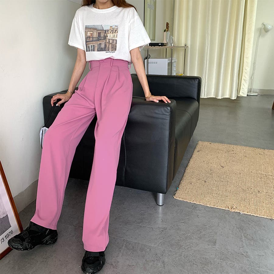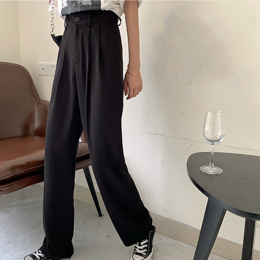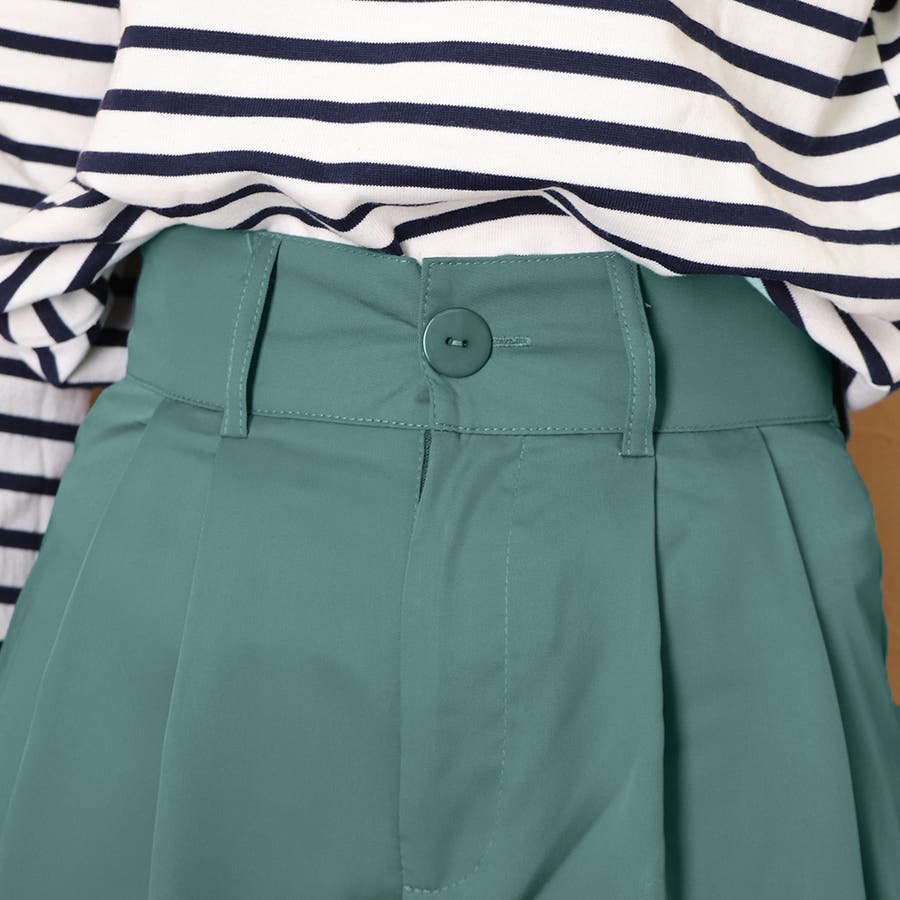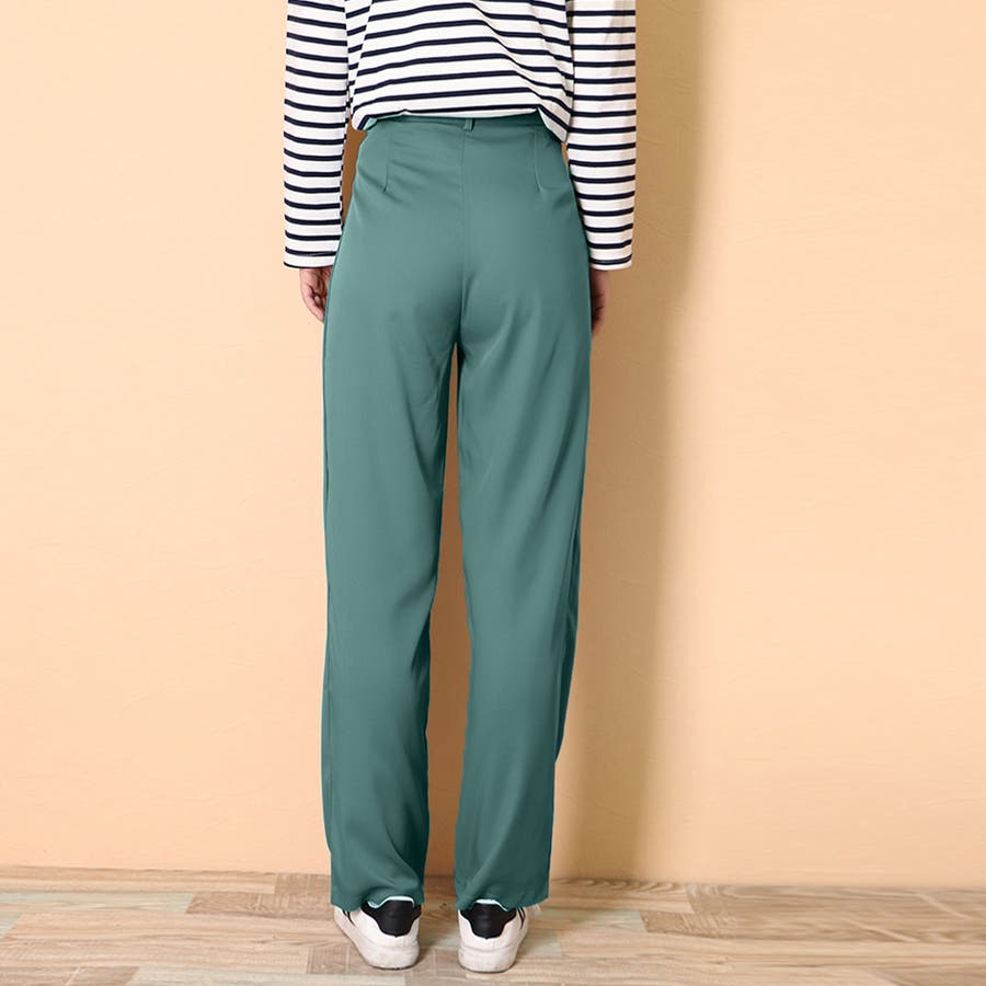 深めの股上とタックデザインで腰やヒップ周りをスッキリ印象に