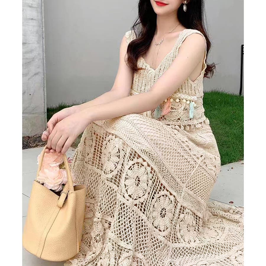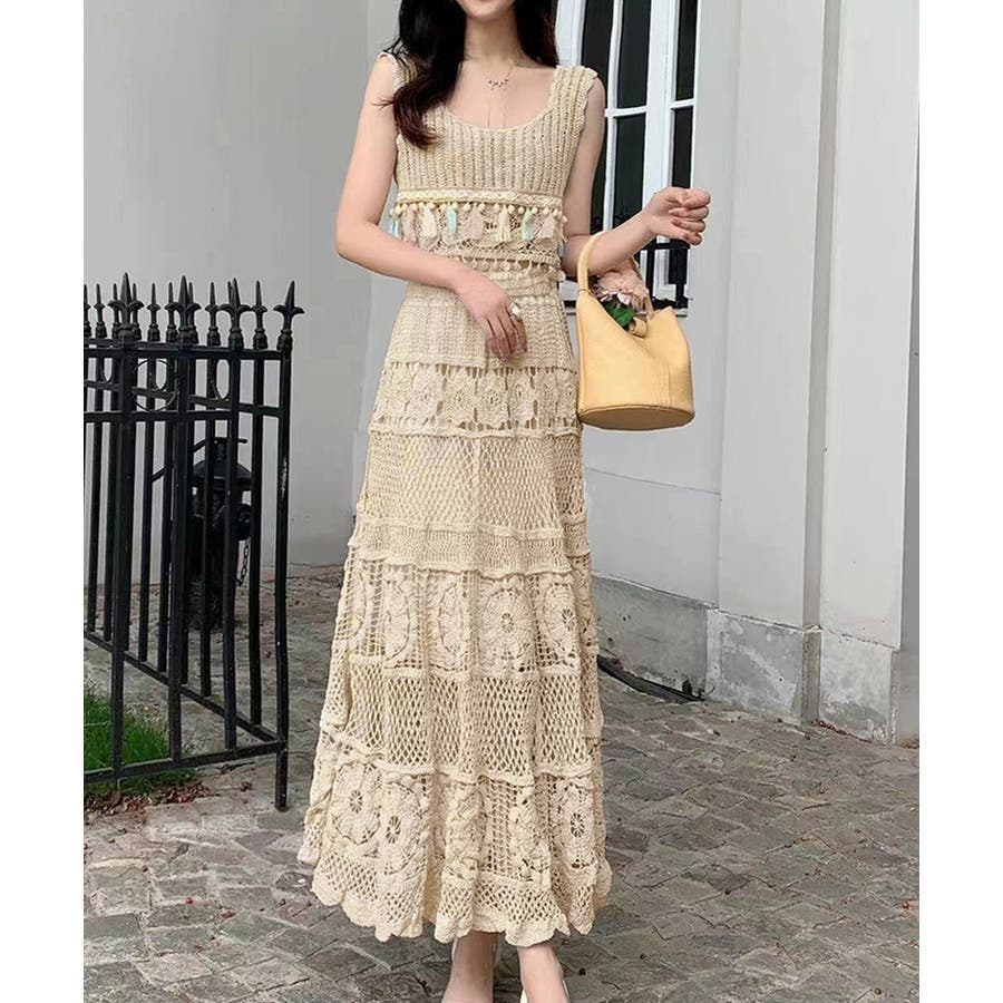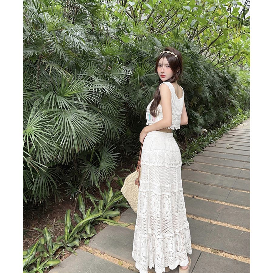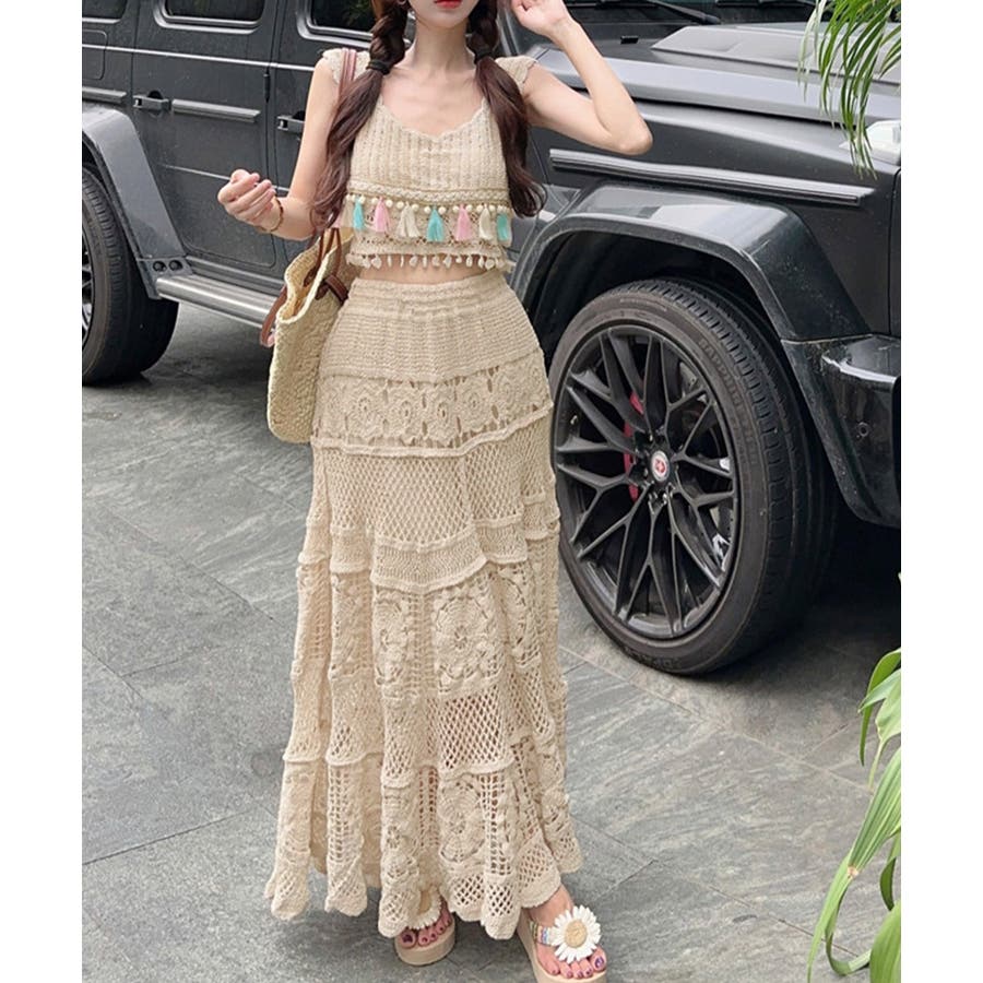トレンドのクロシェ編みサマーニット2ピースセットアップ